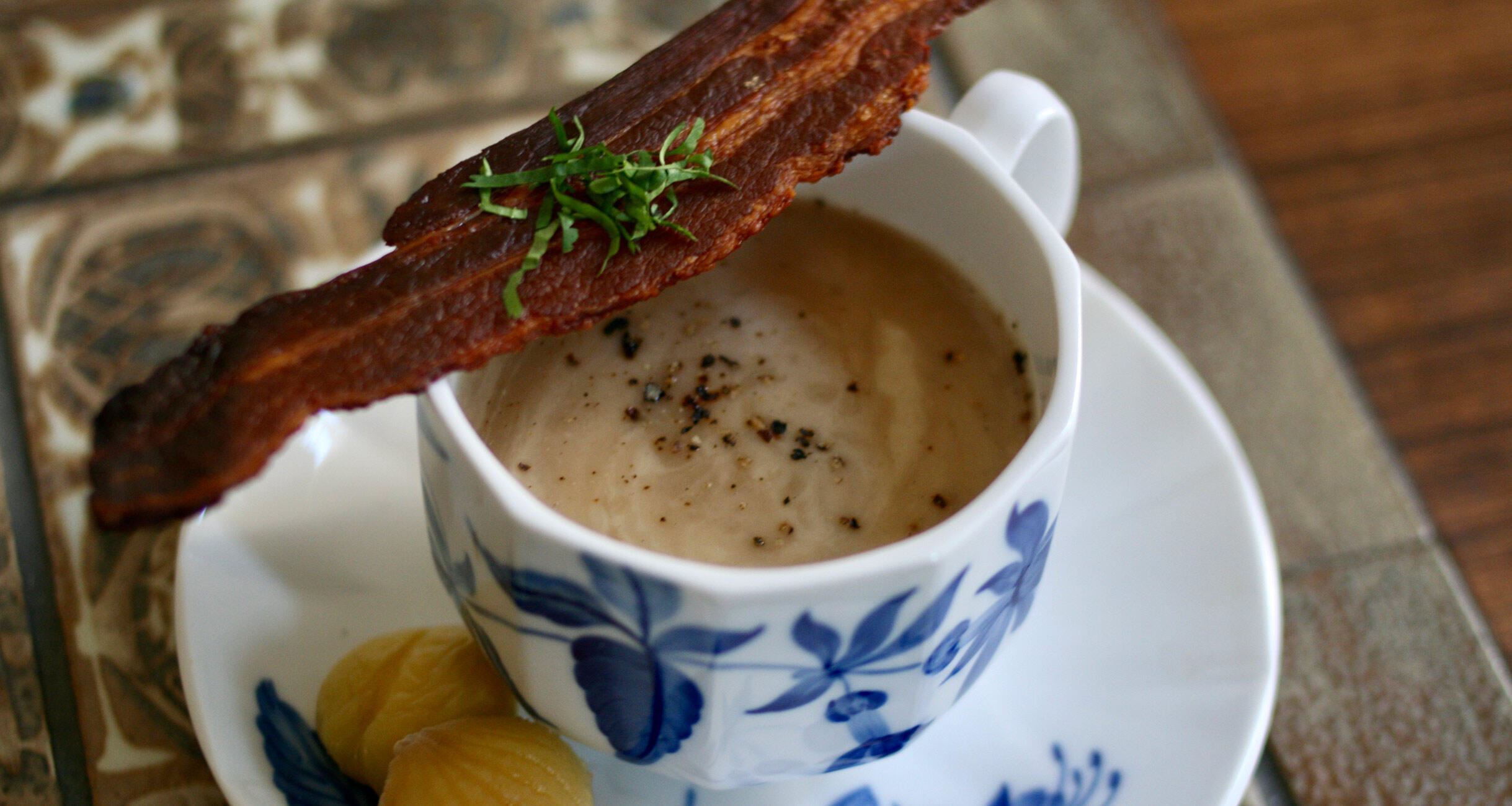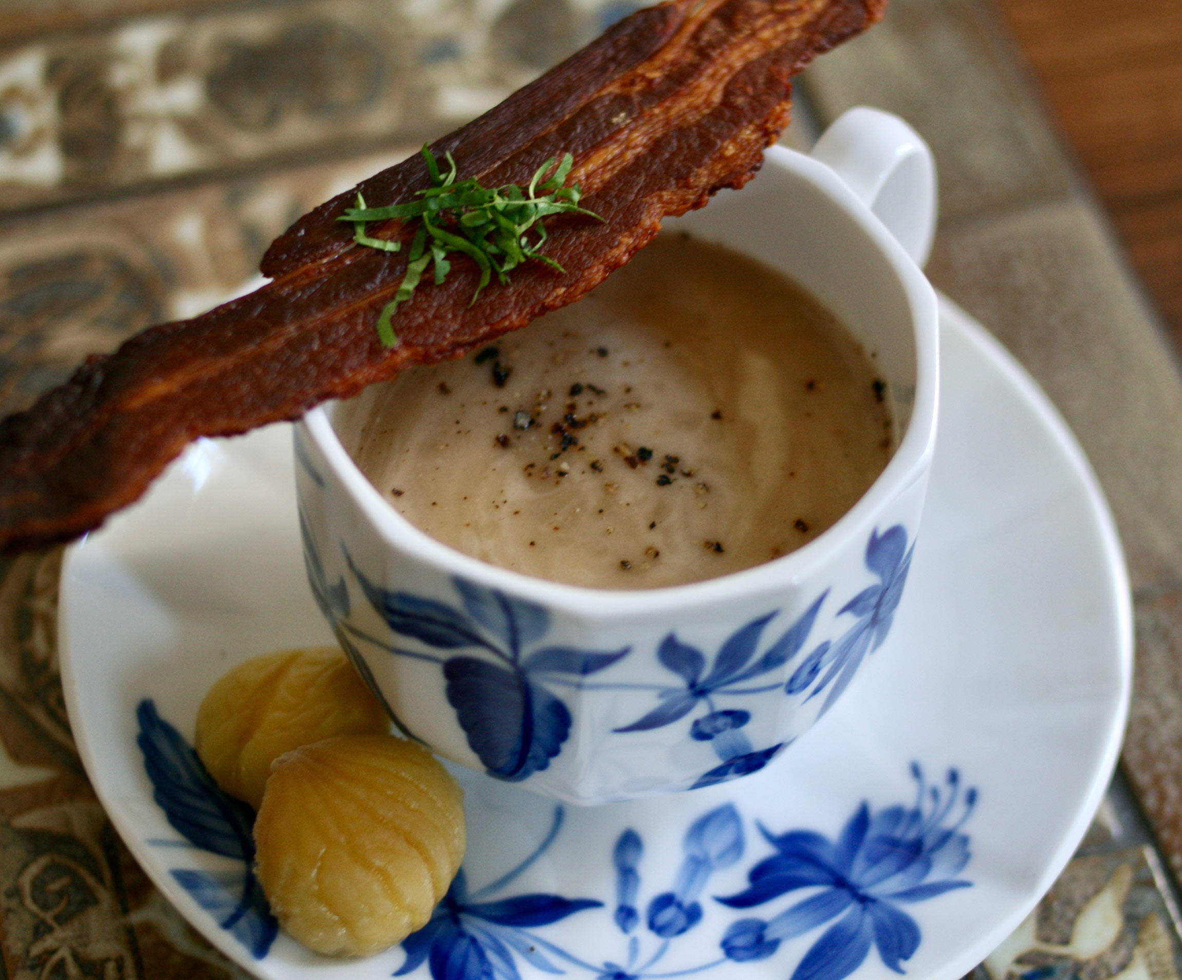 あっという間でしょ? 超簡単、けれども、美味しい、栗のポタージュ。オーブンで焼いたカリカリベーコンを添えるのがフランス流です。とっても美味しいですよ。ボナペティ!