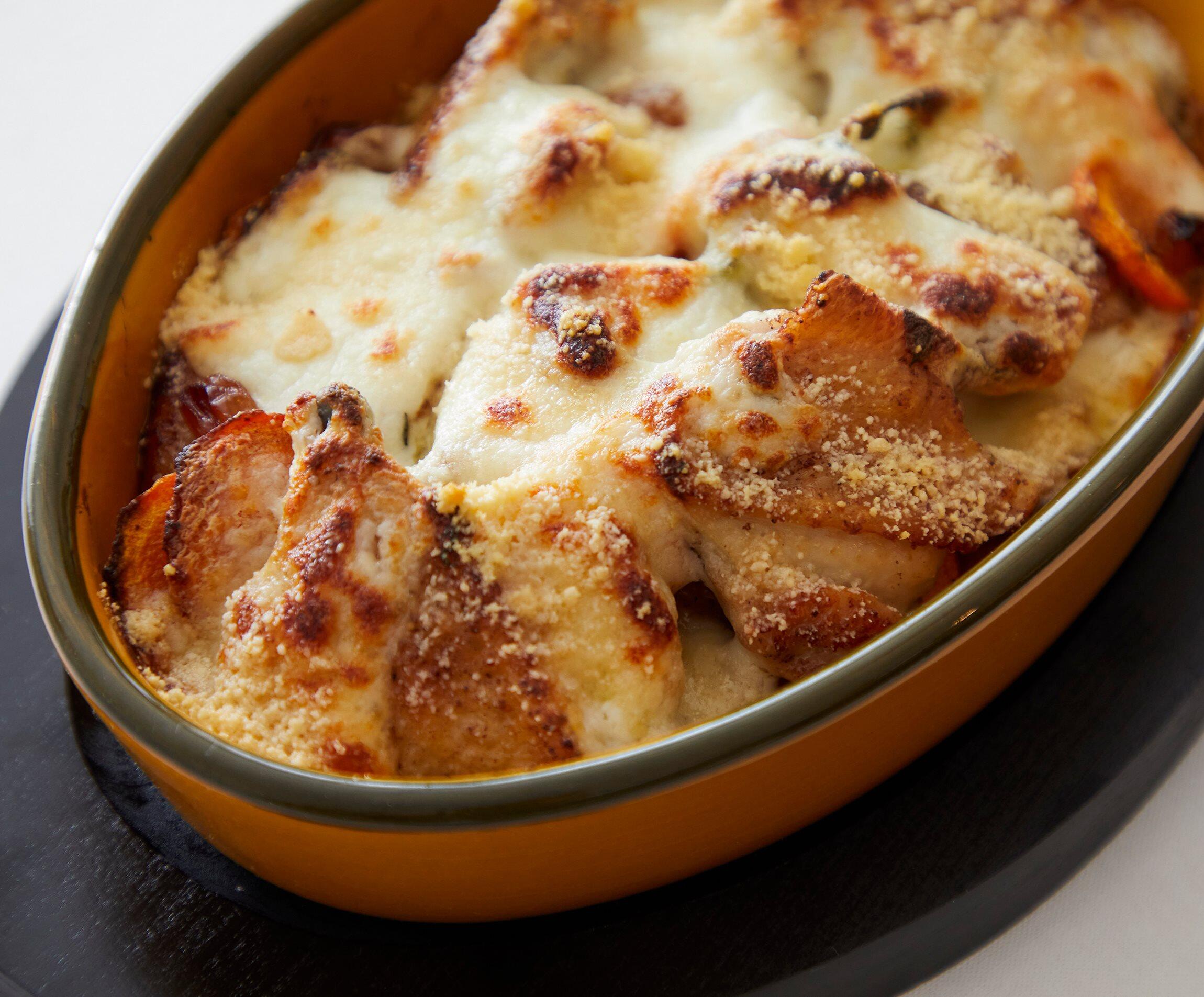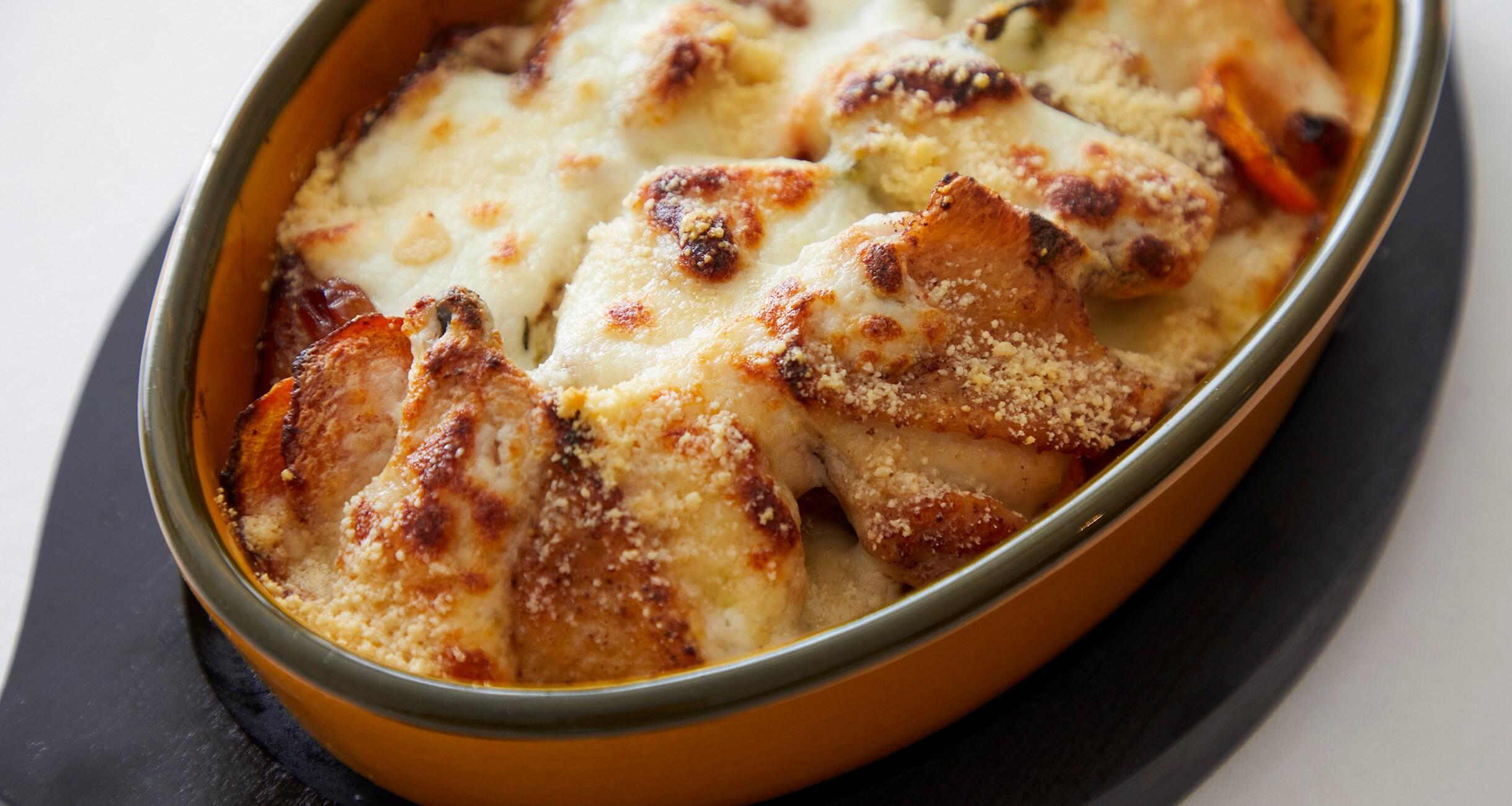 耐熱容器に入れ、パルメザンチーズをふり、220℃のオーブンで12~13分、おいしそうな焼き色がつくまで焼く。