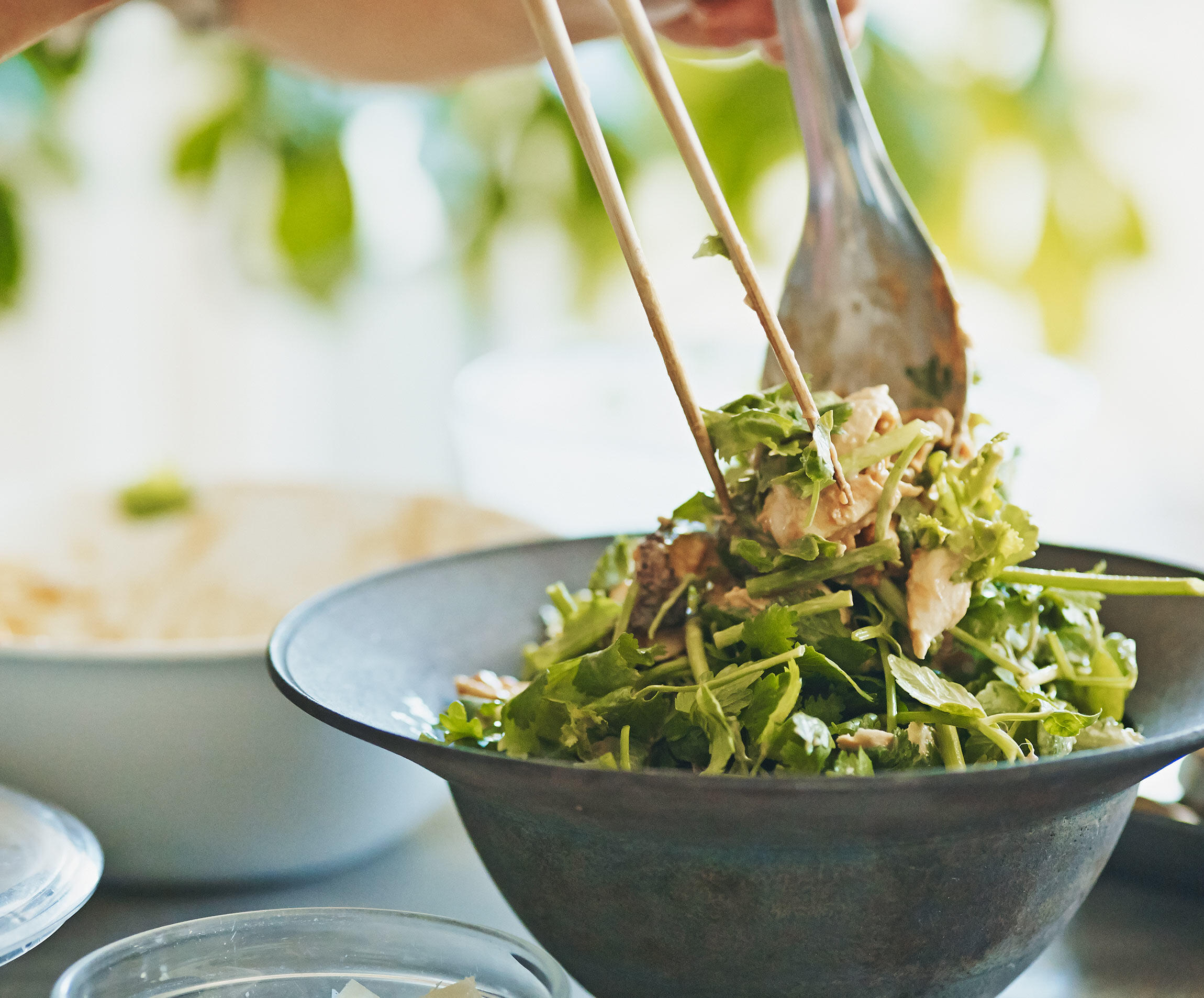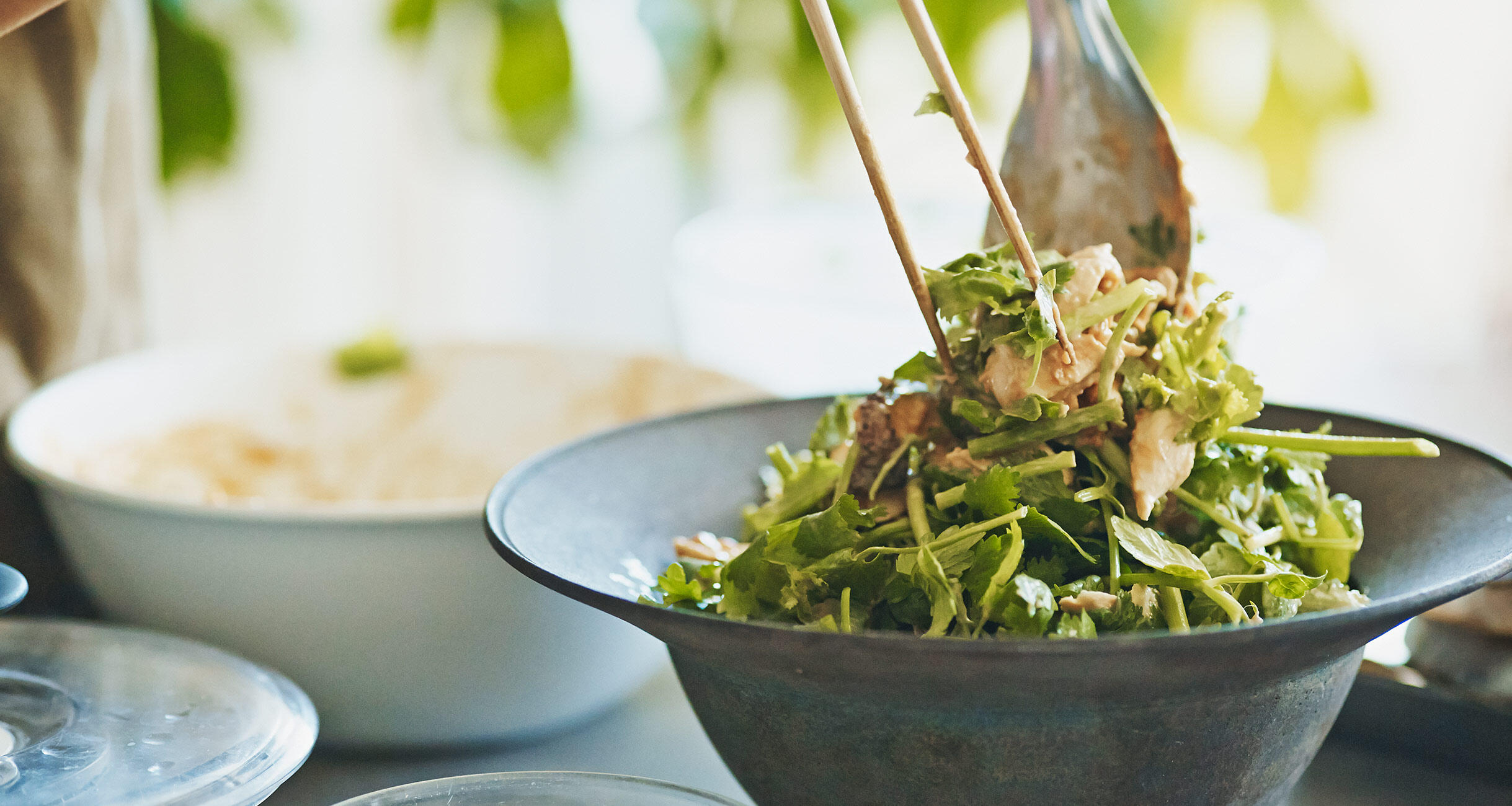 ピーナッツバターのコクと、せりのシャキシャキとした軽い歯触りのバランスがよく、飽きません。鶏ささみは大きめにちぎると、食べごたえがあり、おつまみ代わりになります。