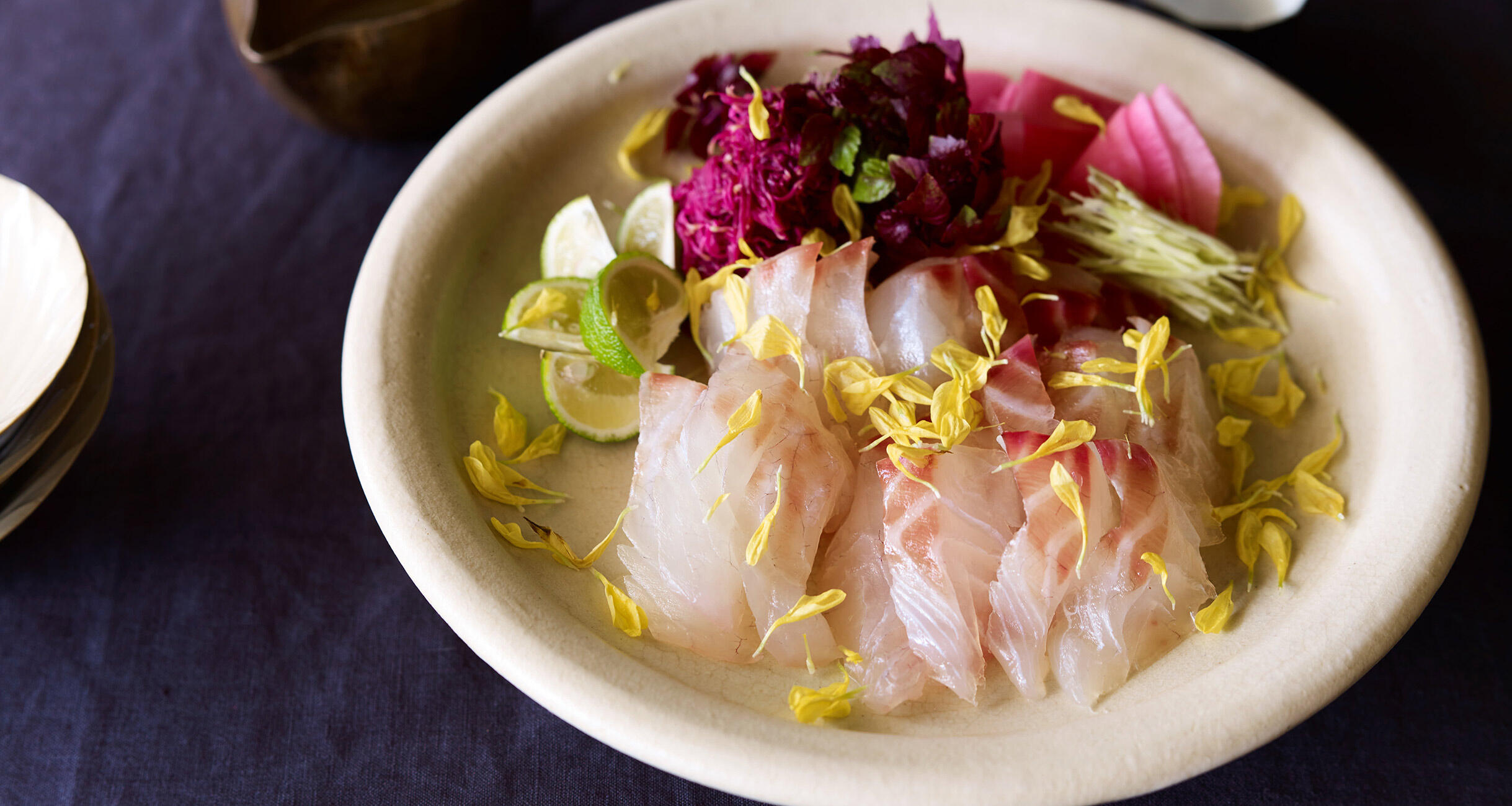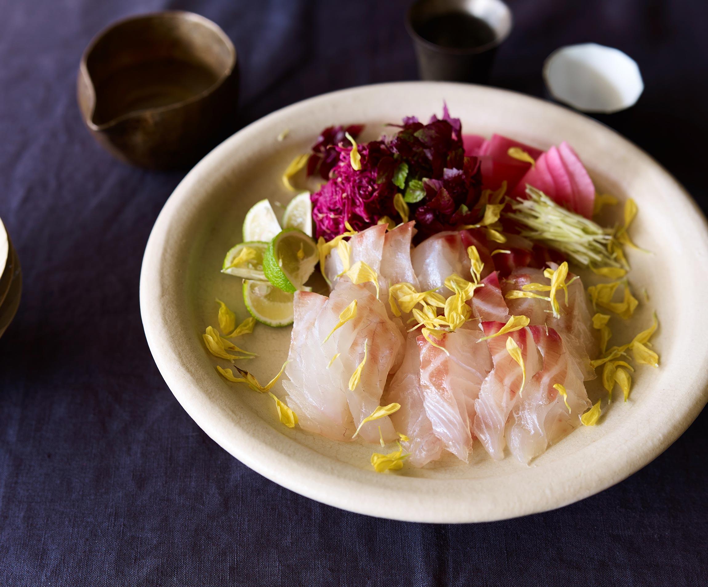 すだち、塩、醤油など、鯛の薬味を替えながら飽きずにいつまでも食べ続けられます。わさびは細切りにするとツンとした刺激がほどよい加減になり、昆布じめの鯛の繊細な味との相性よし。酢漬けは見栄えもよく、箸休めにピッタリ。