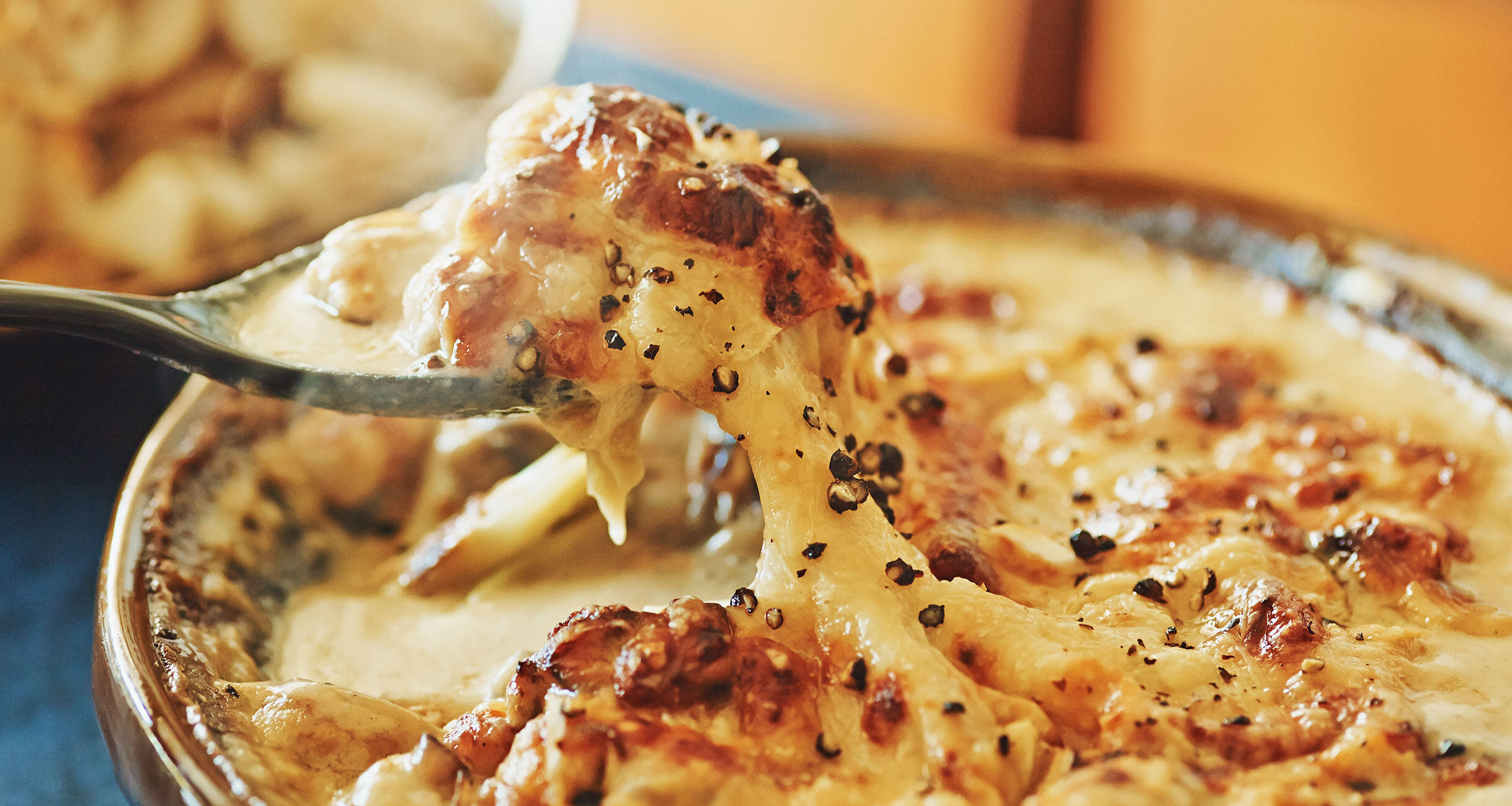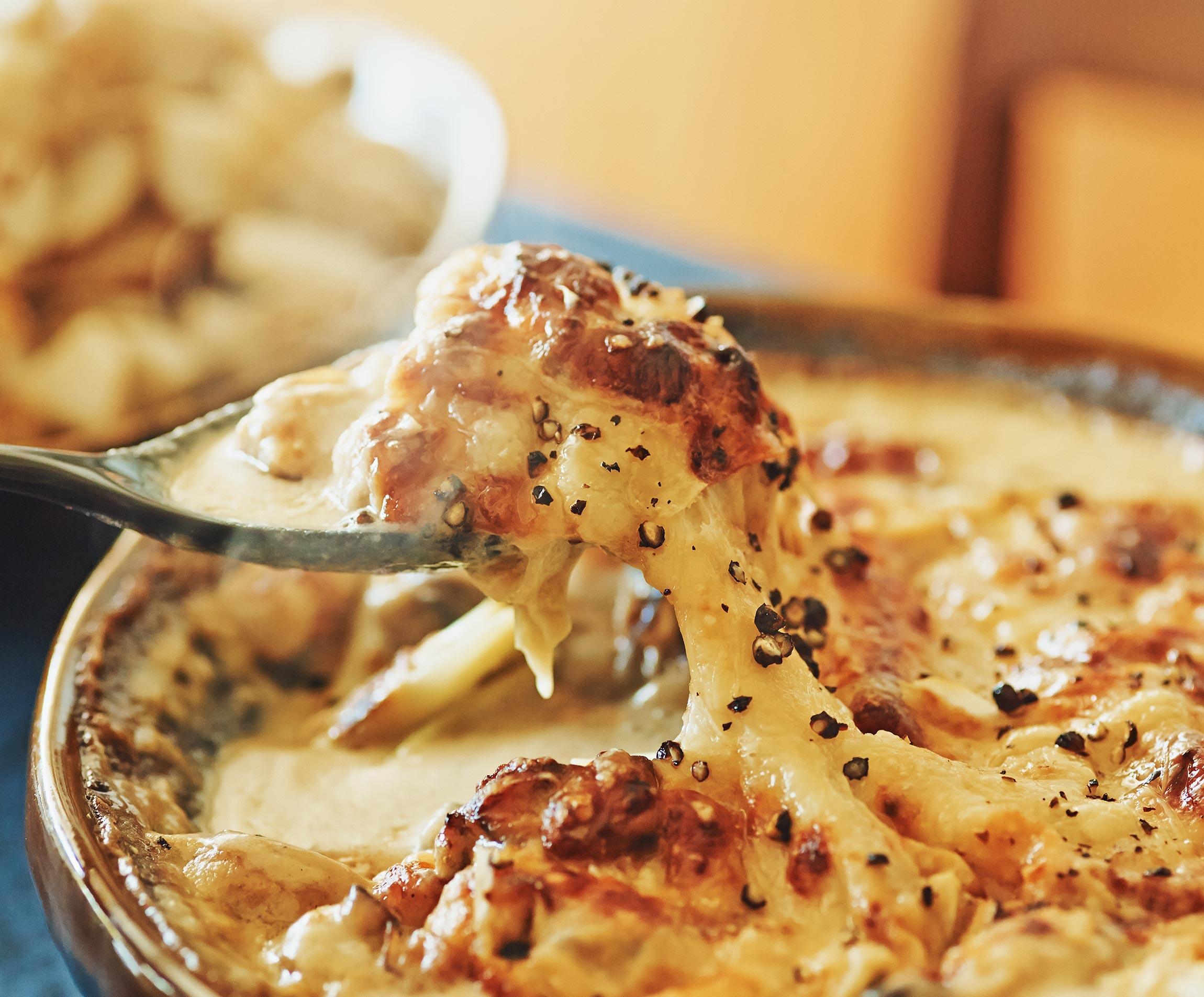 まろやかな白味噌がベースとなり、ねぎの旨味と牡蠣のだしに一体感が出ている滋味深いグラタン。仕上げに黒胡椒をふると、白味噌の甘味がぐ っと引き締まります。胡椒は粗く刻むと、クリームに負けない強い味わいに。