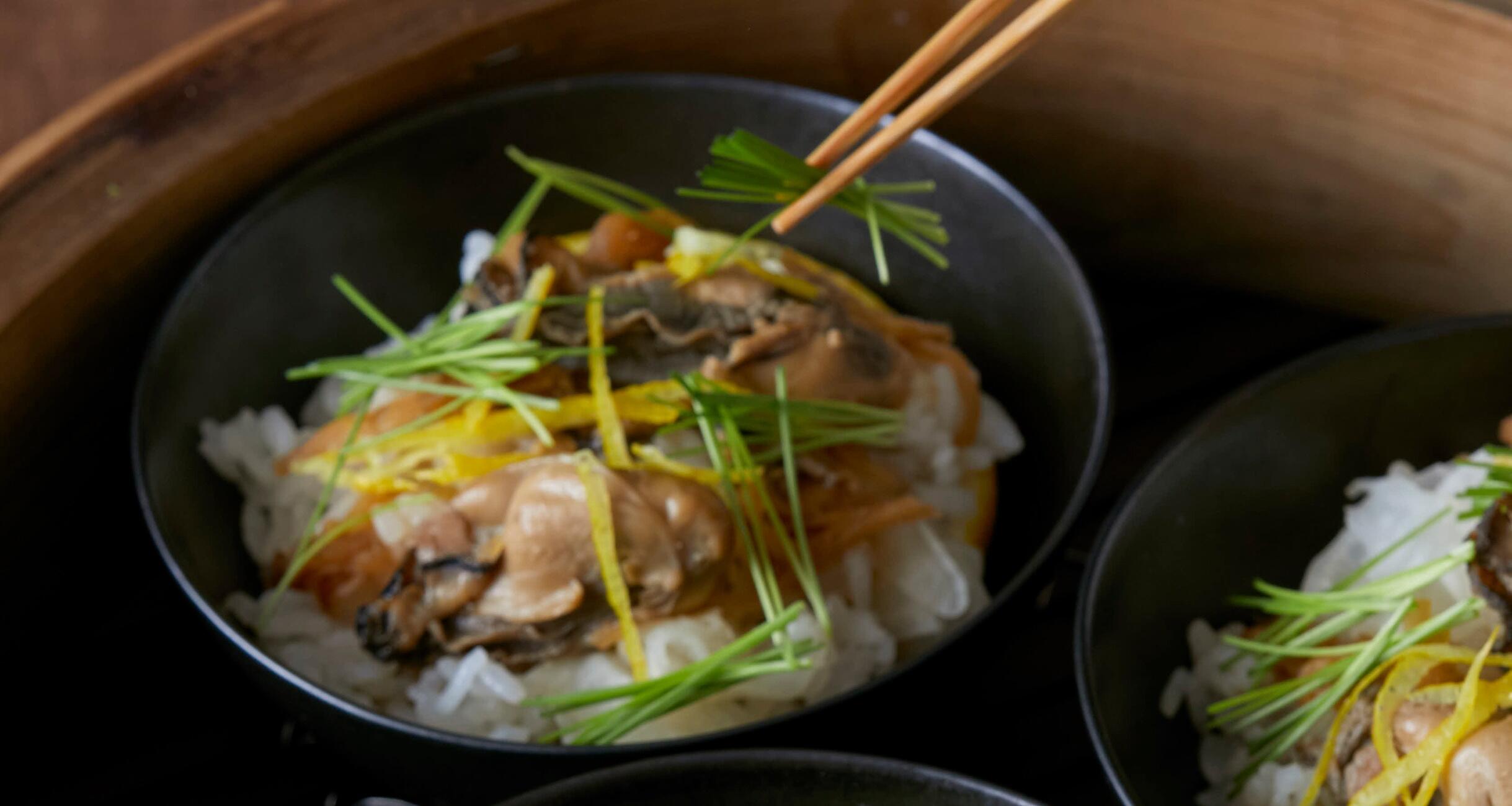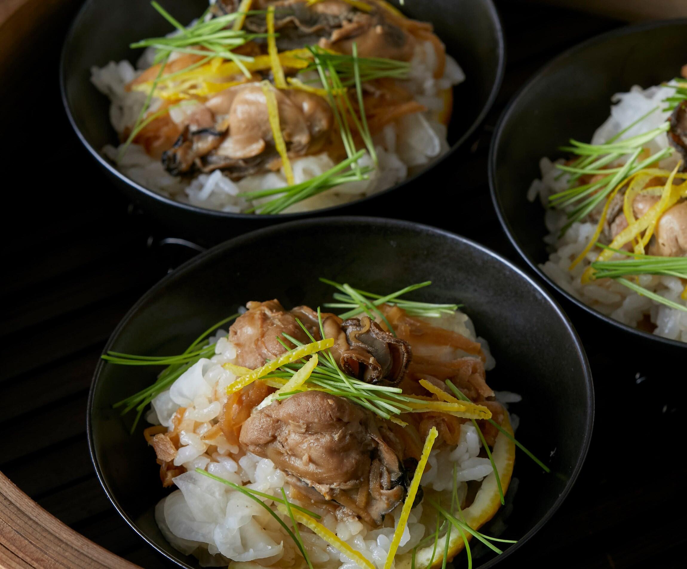 器に柚子のスライス2~3枚を段々に重ねながら酢飯をふんわりとよそい、牡蠣の生姜煮を適量のせ、煮汁を小さじ1/2~2/3回しかける。蒸気の上がった蒸し器で熱々に蒸す。柚子の皮と食べやすく切った芽ねぎをあしらう。