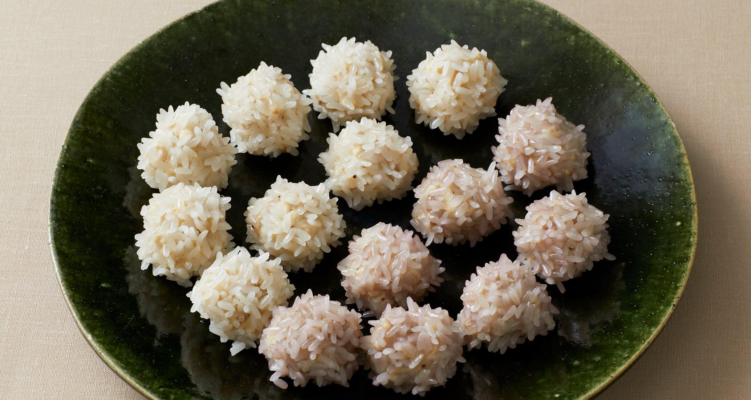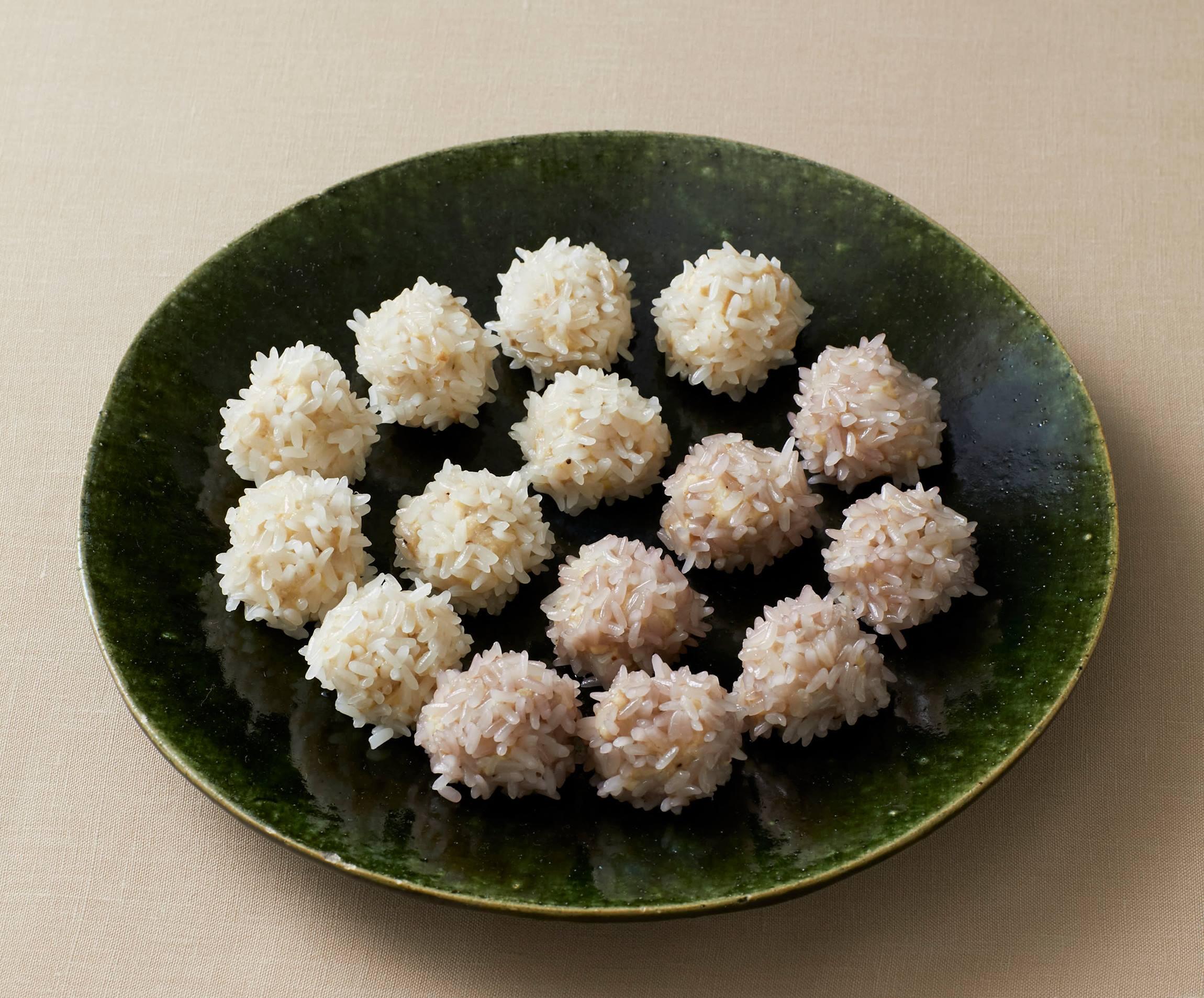 水で薄めた赤ワインでもち米をうっすら紅色に染めて、上品な紅白しゅうまいに仕上げました。中には豆腐入りのやわらかい挽き肉が。そのままでもよし、梅肉を少しつけて食べるのもおすすめです。