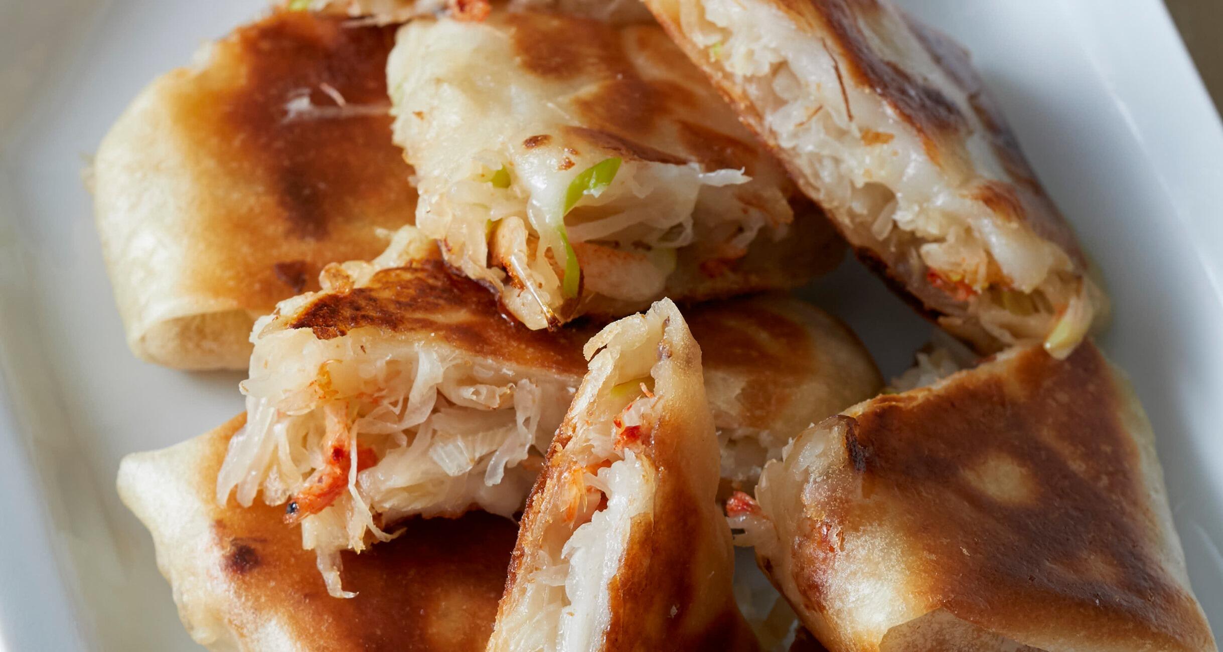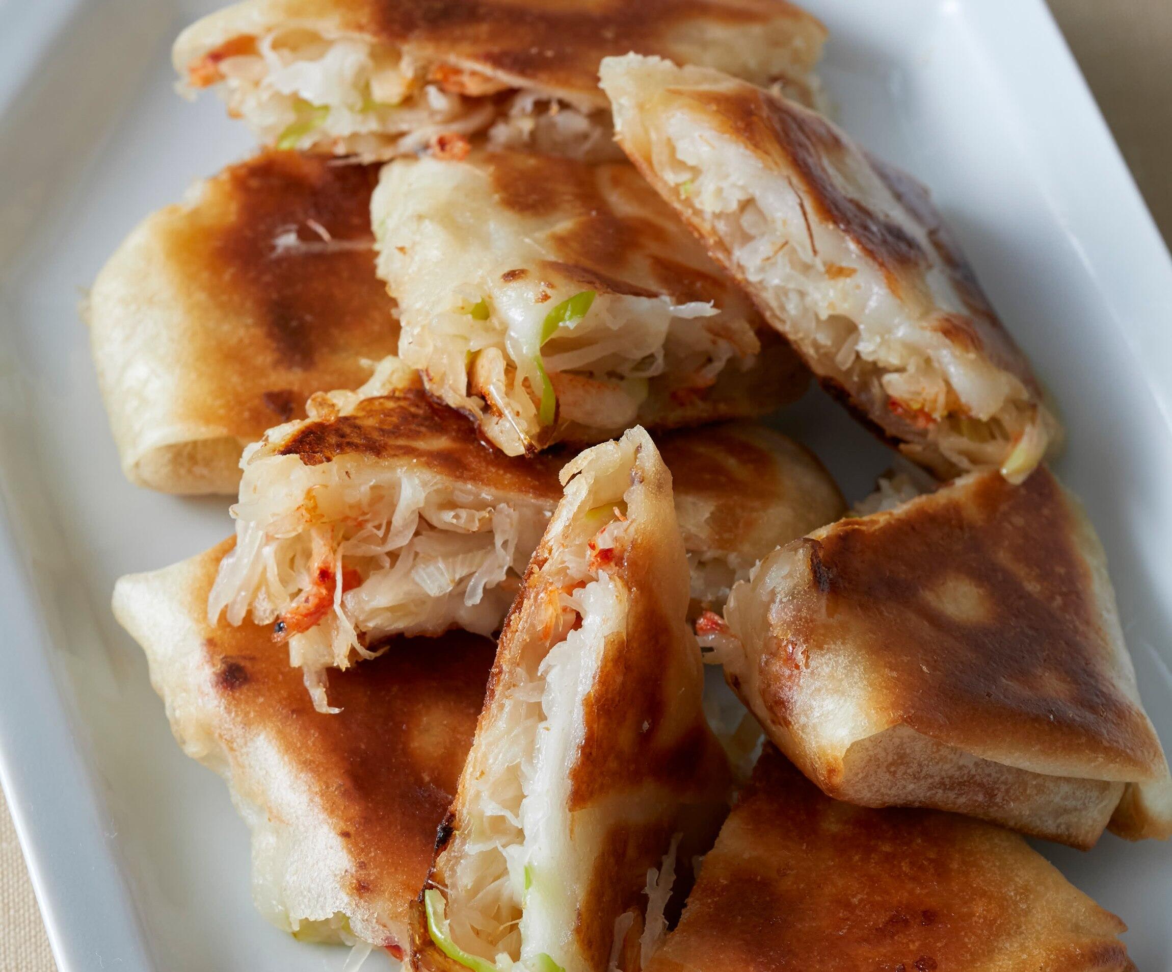 大根はねぎ、生姜、桜海老で炒めて、香りよく。餅入りの春巻きは口の中で融合し、まるで大根餅を食べているよう。揚げずにカリカリに焼いて。