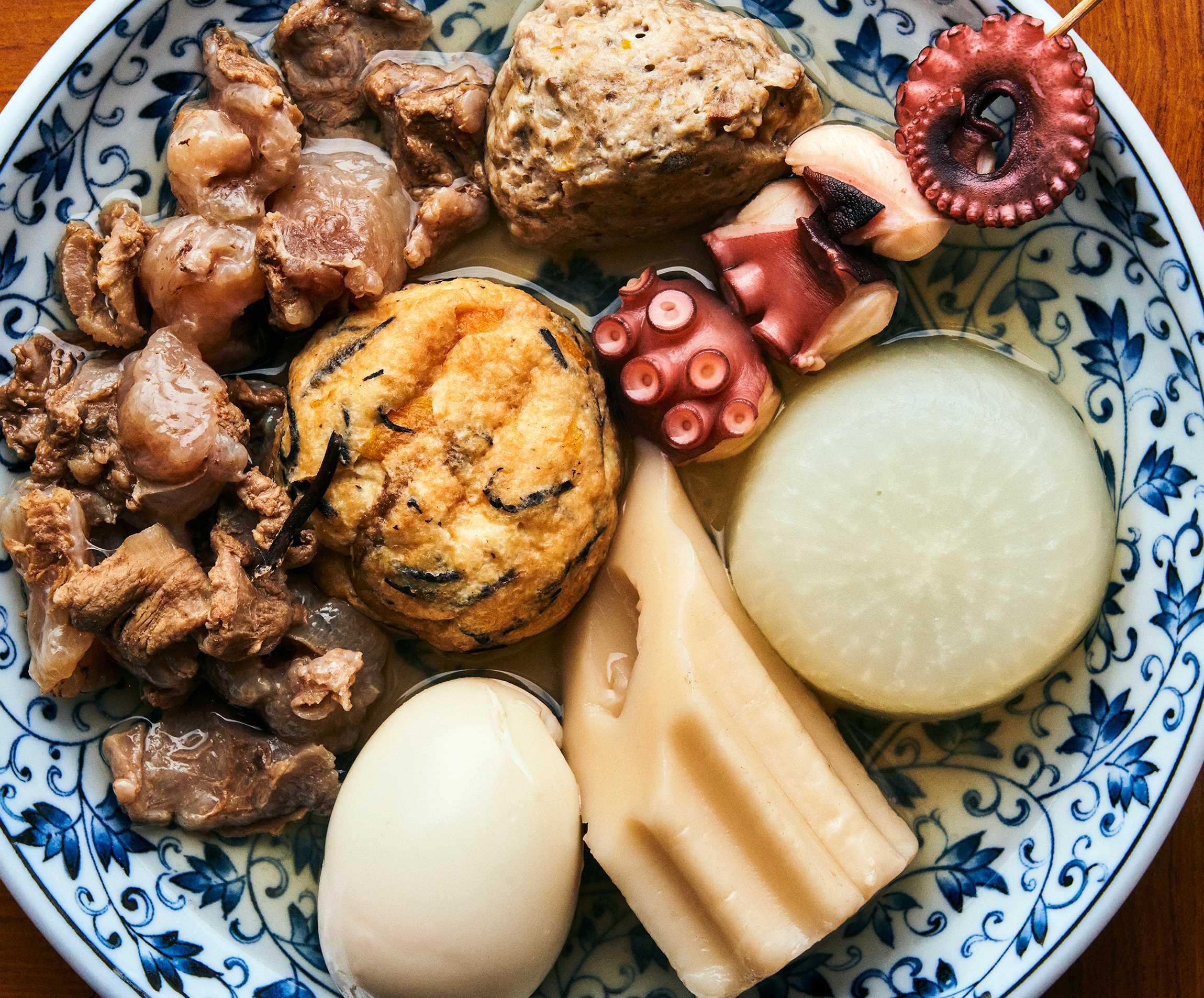 が、しかし、ようやく知ったのである、牛すじの正解を。教えてくれたのは「おでんやden」の佐藤真一さんだ。この店のおでんは昆布だしベースの関西式。牛すじは定番の人気おでん種に君臨しているのだが、これがもう絶品。ほろっと柔らかく、脂っこさは皆無。澄んだ旨味が噛むほどに溢れ出て、だしもおいしく育っていく。うっとり。