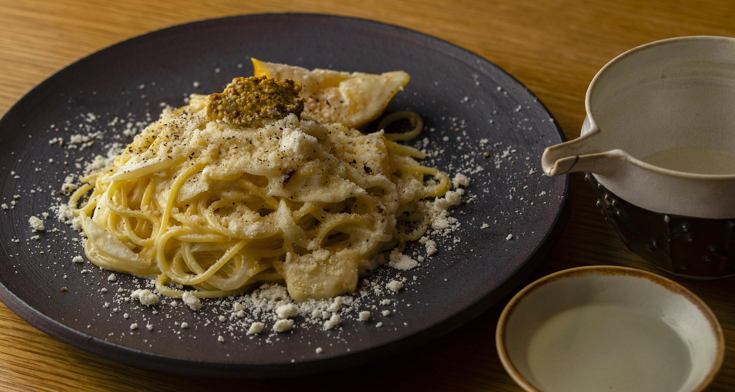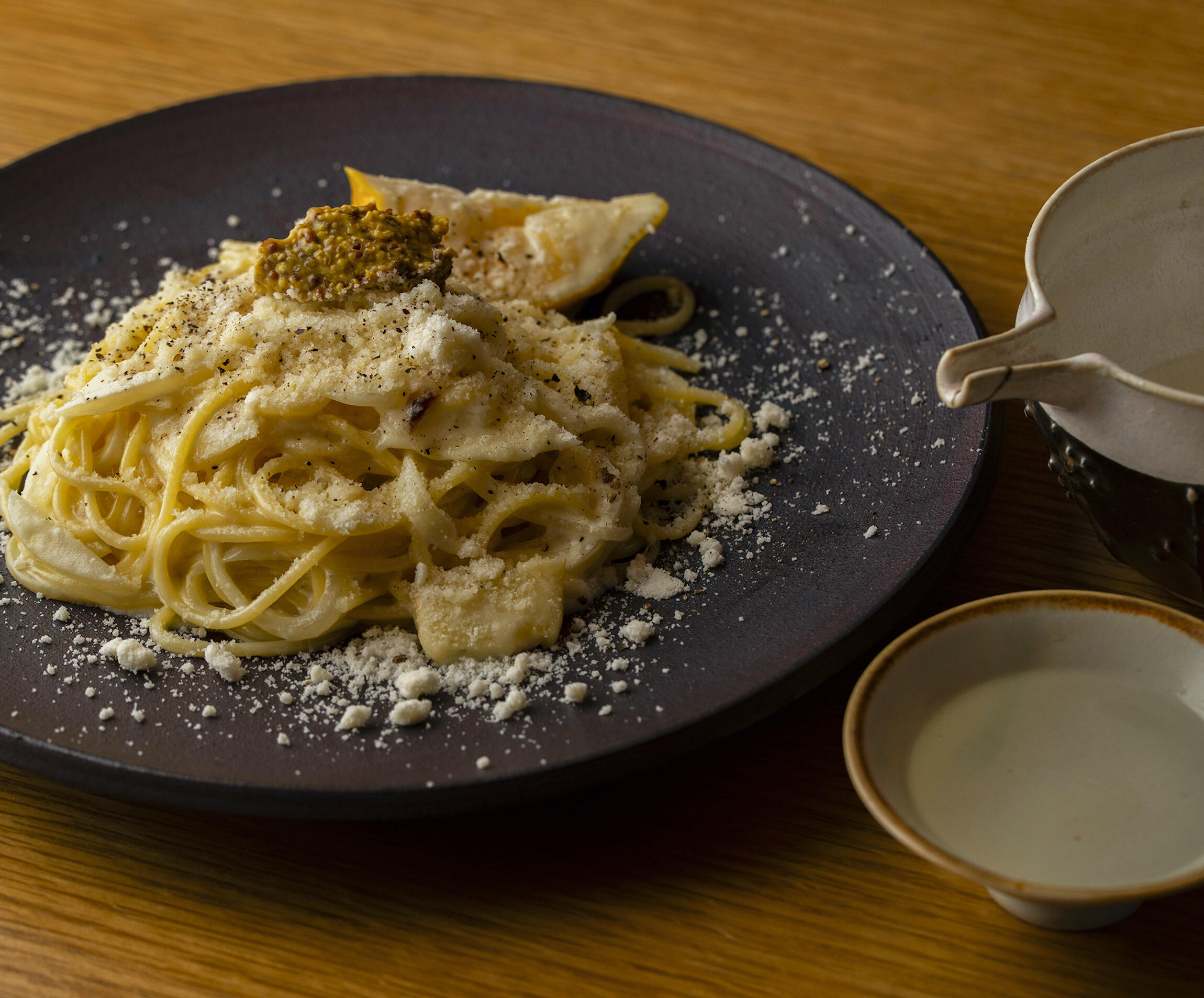日本酒とともにクリームをまとったパスタを口に含むと、コクと甘味がぴったりと寄り添う。