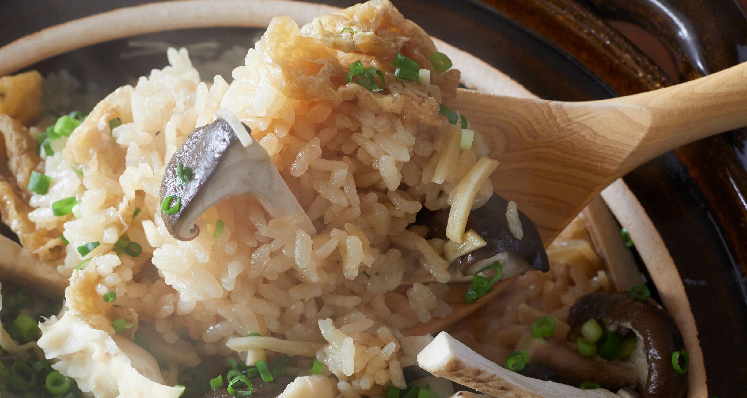 土鍋ごとテーブルに。蓋をあけると、内側で溜まっていたきのこの香りが一気に立ち上ります。シンプルな炊き込みご飯も土鍋の力でごちそうに。