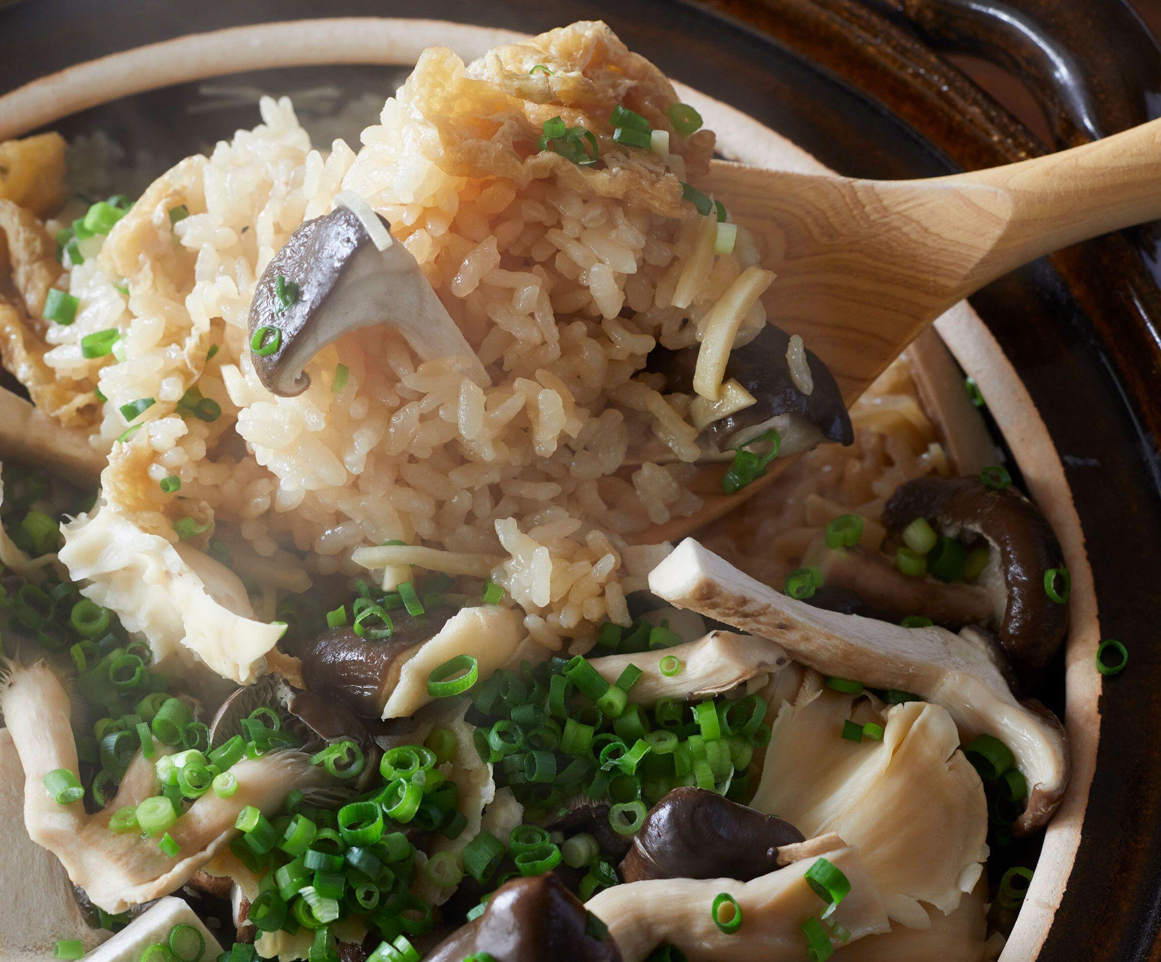 調味料を土鍋に加えて混ぜ、きのこ、油揚げ、生姜をのせる。蓋をして中火にかけ、煮立ってきたらそのまま3~5分煮る。弱火にして12~15分炊き、火を止めて10分蒸らし、小ねぎを散らして全体を混ぜる。