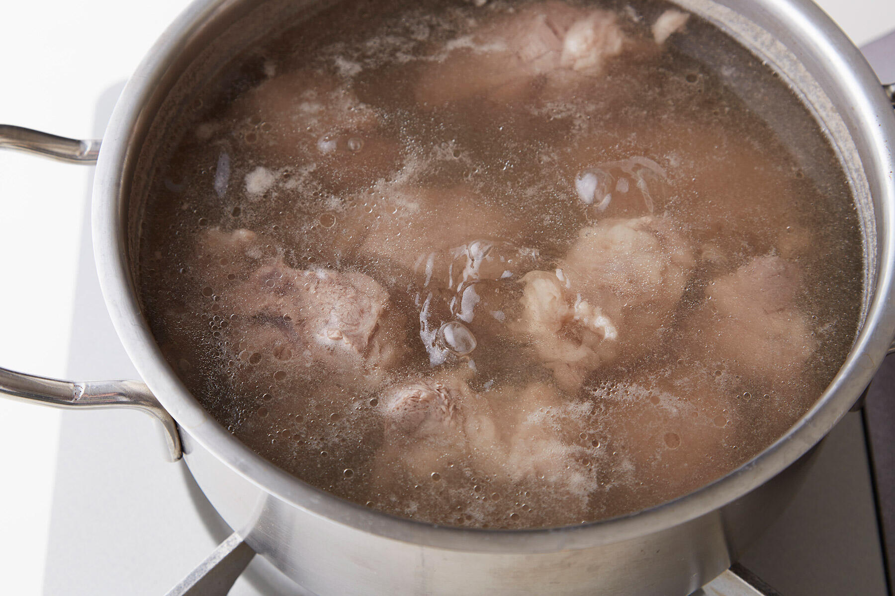 牛肉は厚さ3cm、4~6cm四方に切り、室温にもどす。鍋に水を煮立てて牛肉を入れ、再び煮立ってアクが浮いてきたら火を弱めてアクを取り、残りの下ゆで用材料を入れ、蓋をして弱火で1時間ほど煮る。
