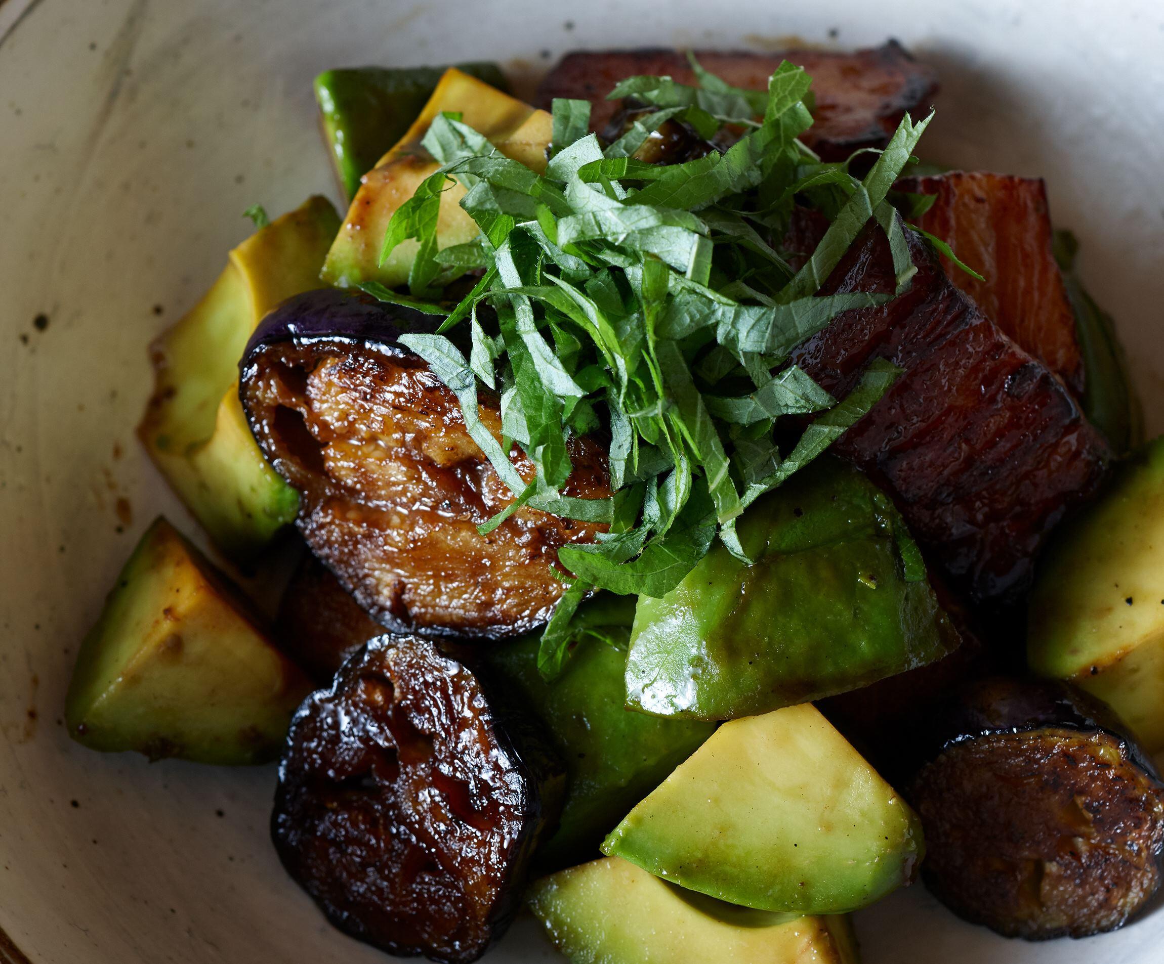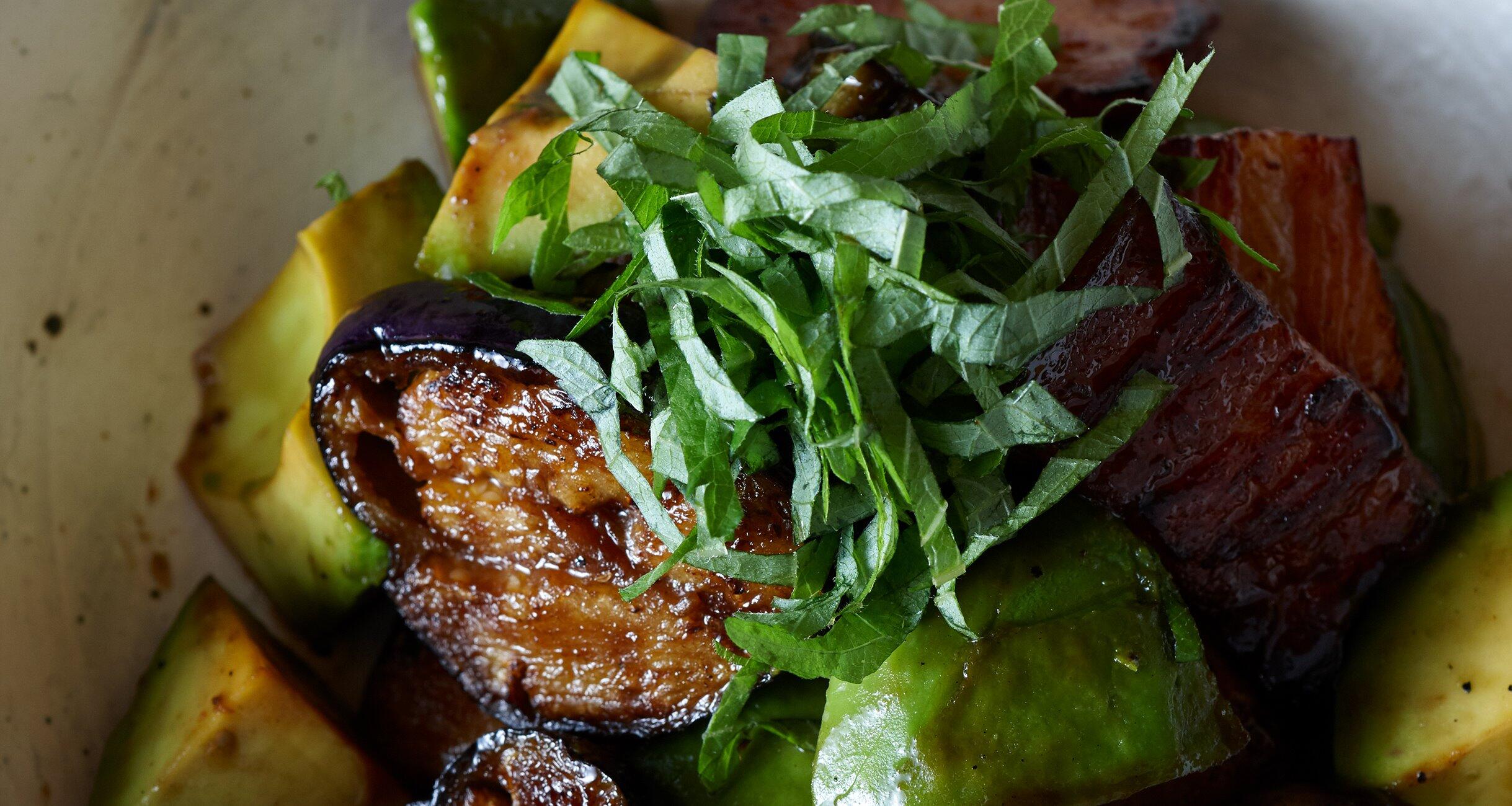 火を通したアボカドがふわりとやわらかく、ベーコンの旨味をまとう。さらに、なす、青じそと間違いのない組み合わせ。お腹にもたまるので軽い〆料理にも。