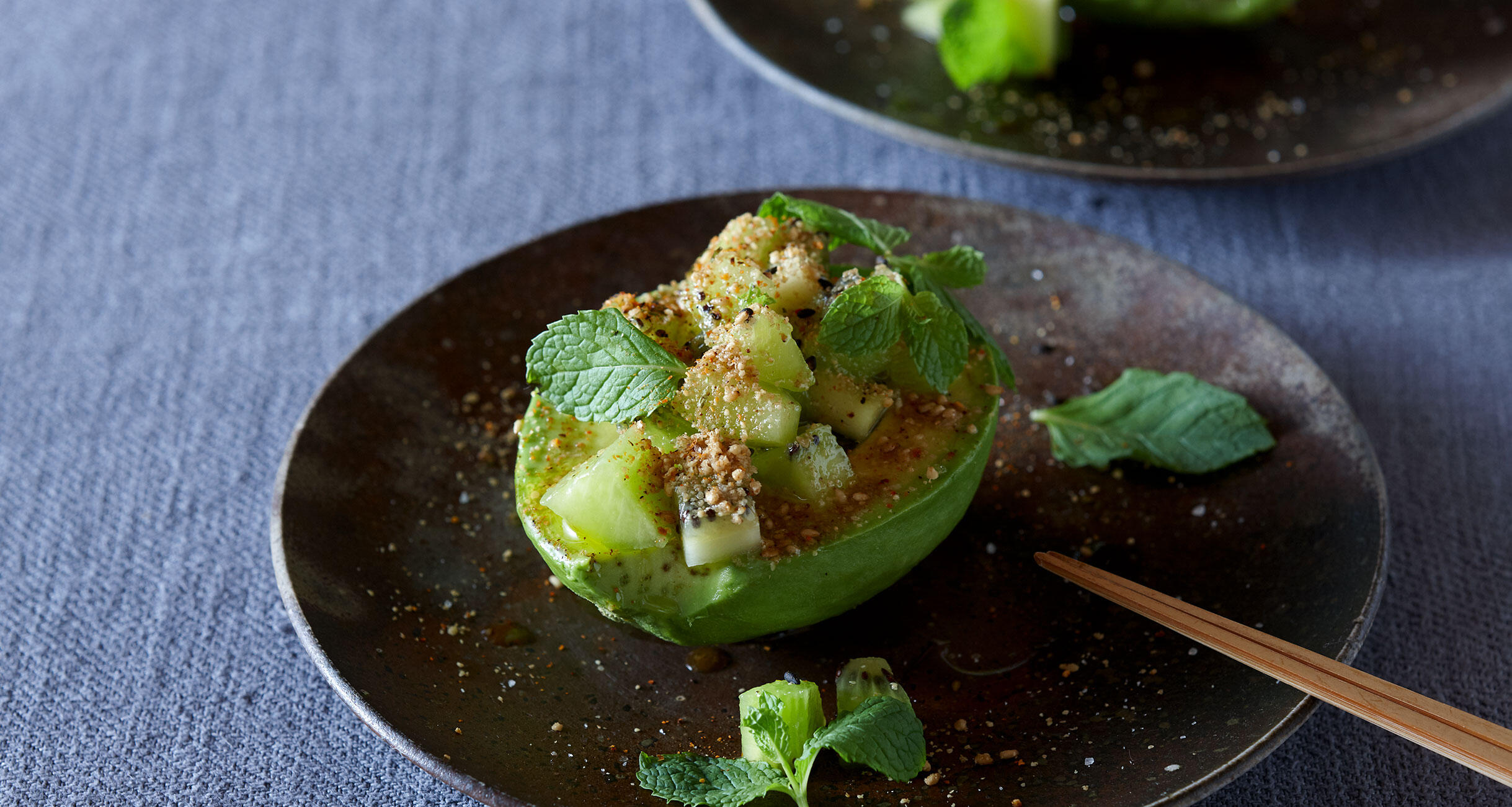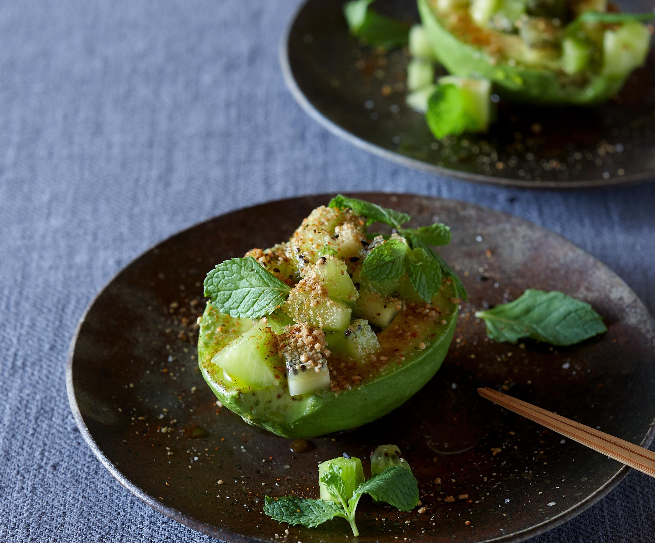 なんともフォトジェニックなアボカド。キウイの種とすり胡麻のプチプチした舌ざわりが面白く、そこに七味唐辛子がじわりと主張してくる。ミントの清涼感も欠かせない。