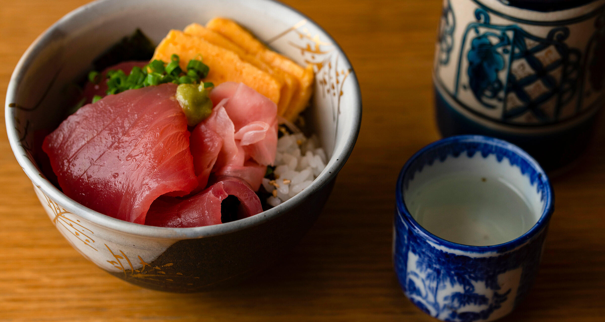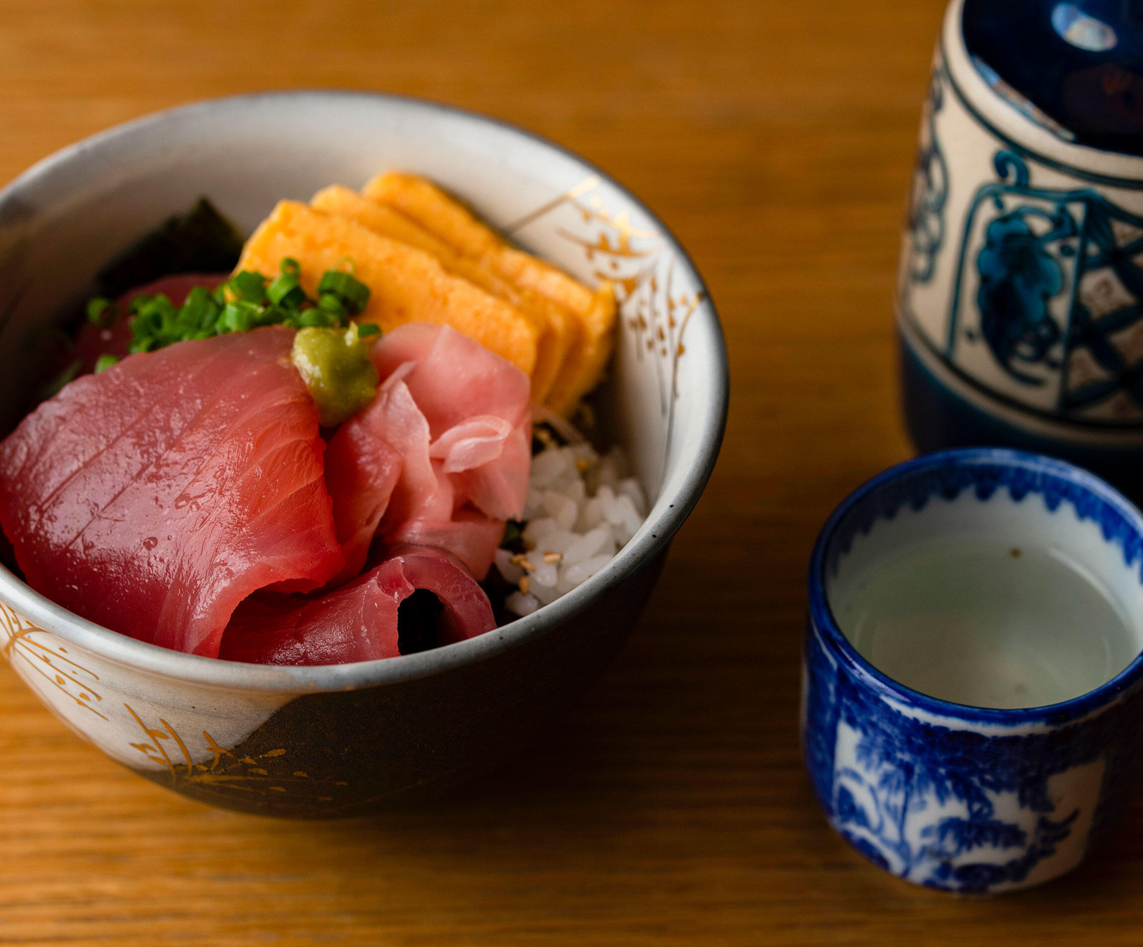 マグロ、卵焼き、ガリを彩りよく盛りつけて、万能ねぎをふりかける。淡口醤油と味醂を合わせて回しかけ、お好みでわさびを添えたら出来上がり。