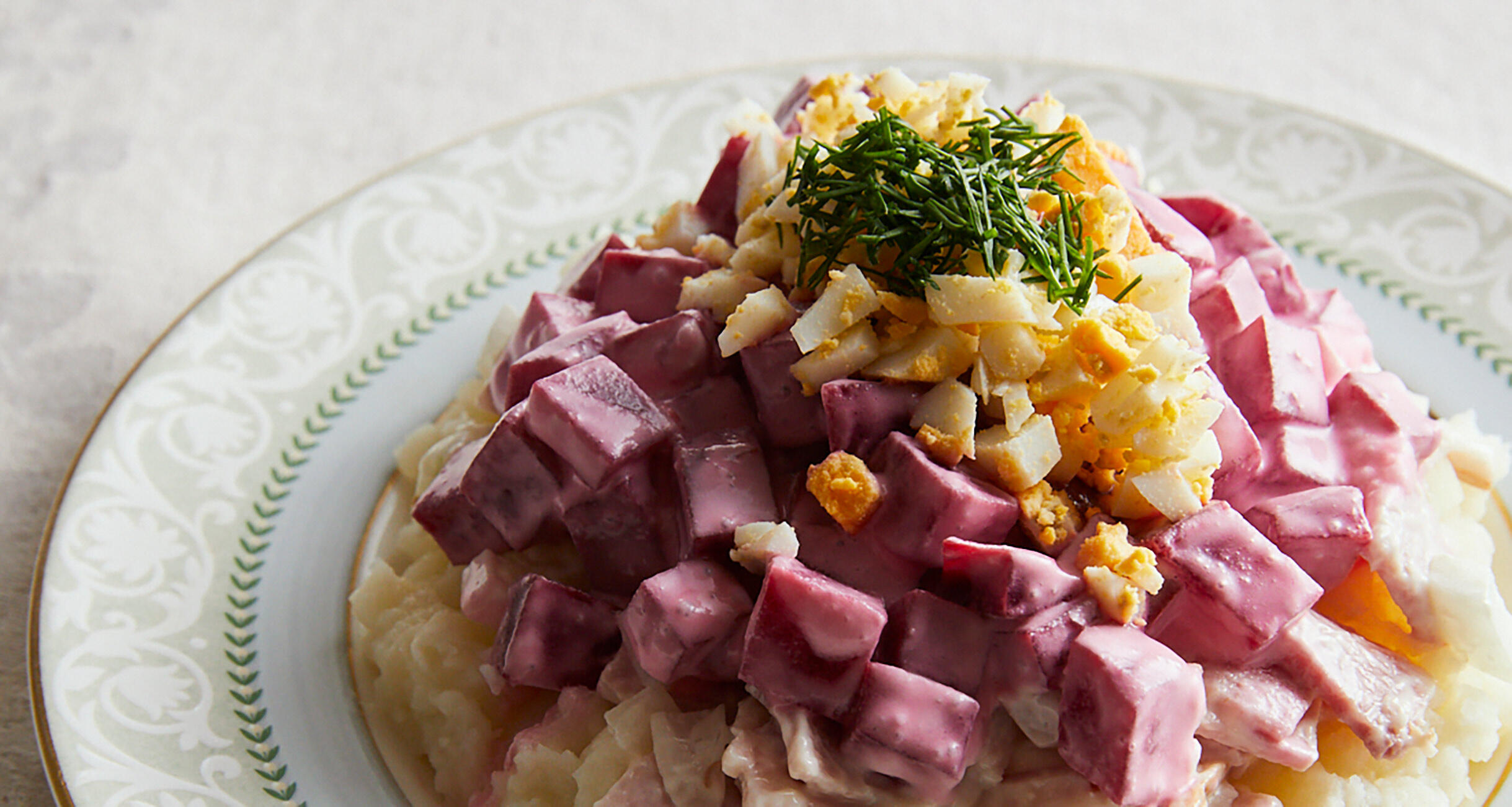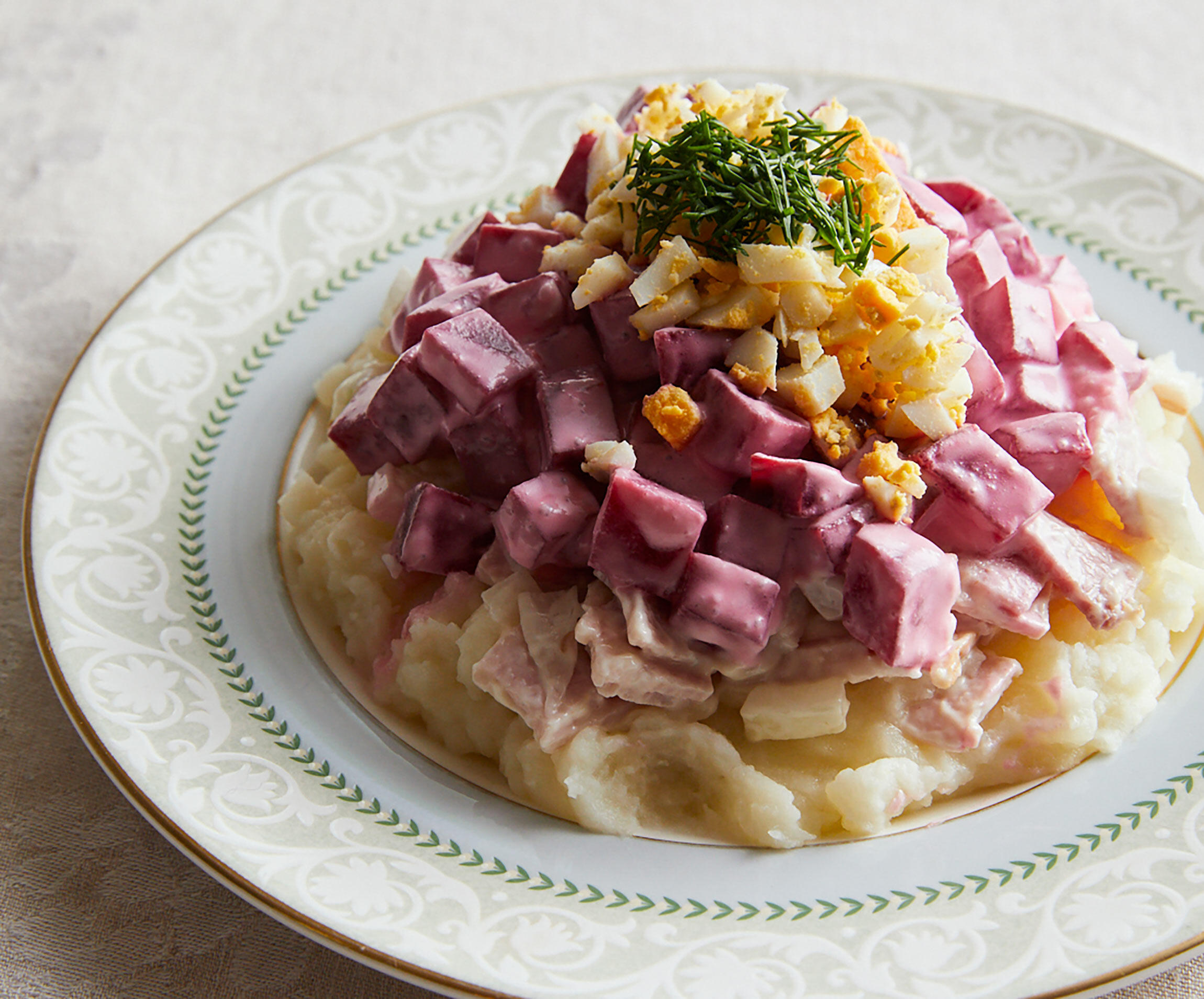 器に3のじゃがいもを敷き、4のハムと玉ねぎ、ビーツの順にのせる。ゆで卵を散らし、ディルをのせる。