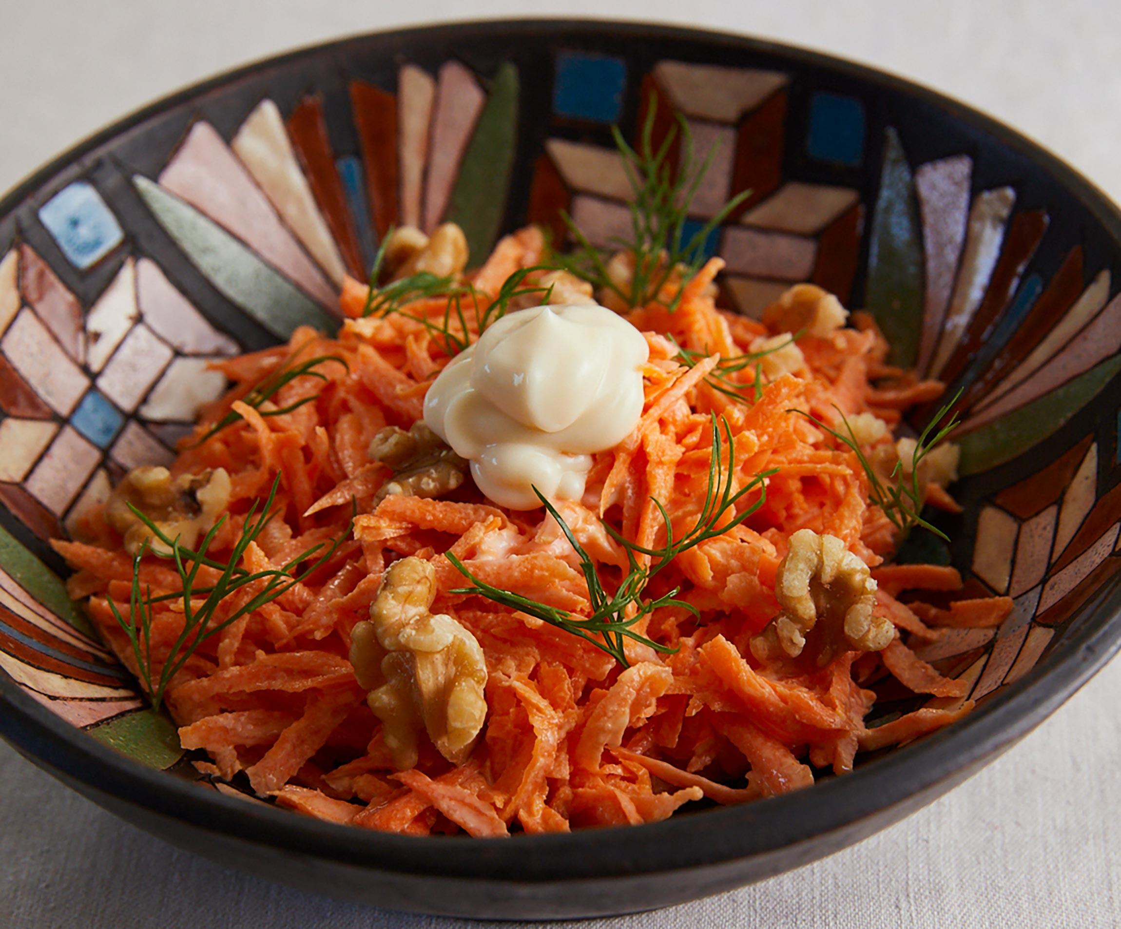 ロシアで、何か一品足りない!というときによくつくられるサラダ。簡単ながら、クルミの香ばしさや、にんにくのピリッとした風味がアクセントになっています。マヨネーズの代わりにサワークリームを混ぜてもおいしい。