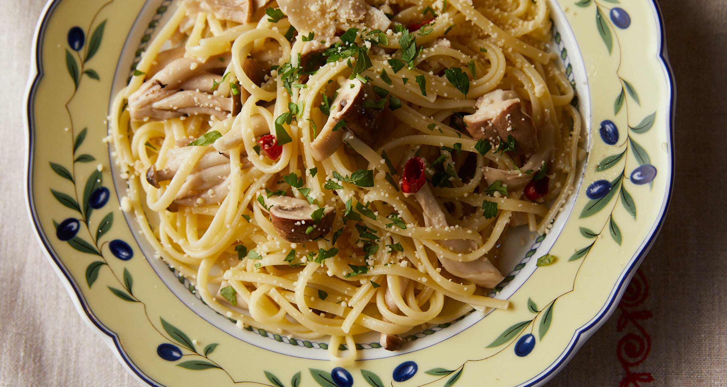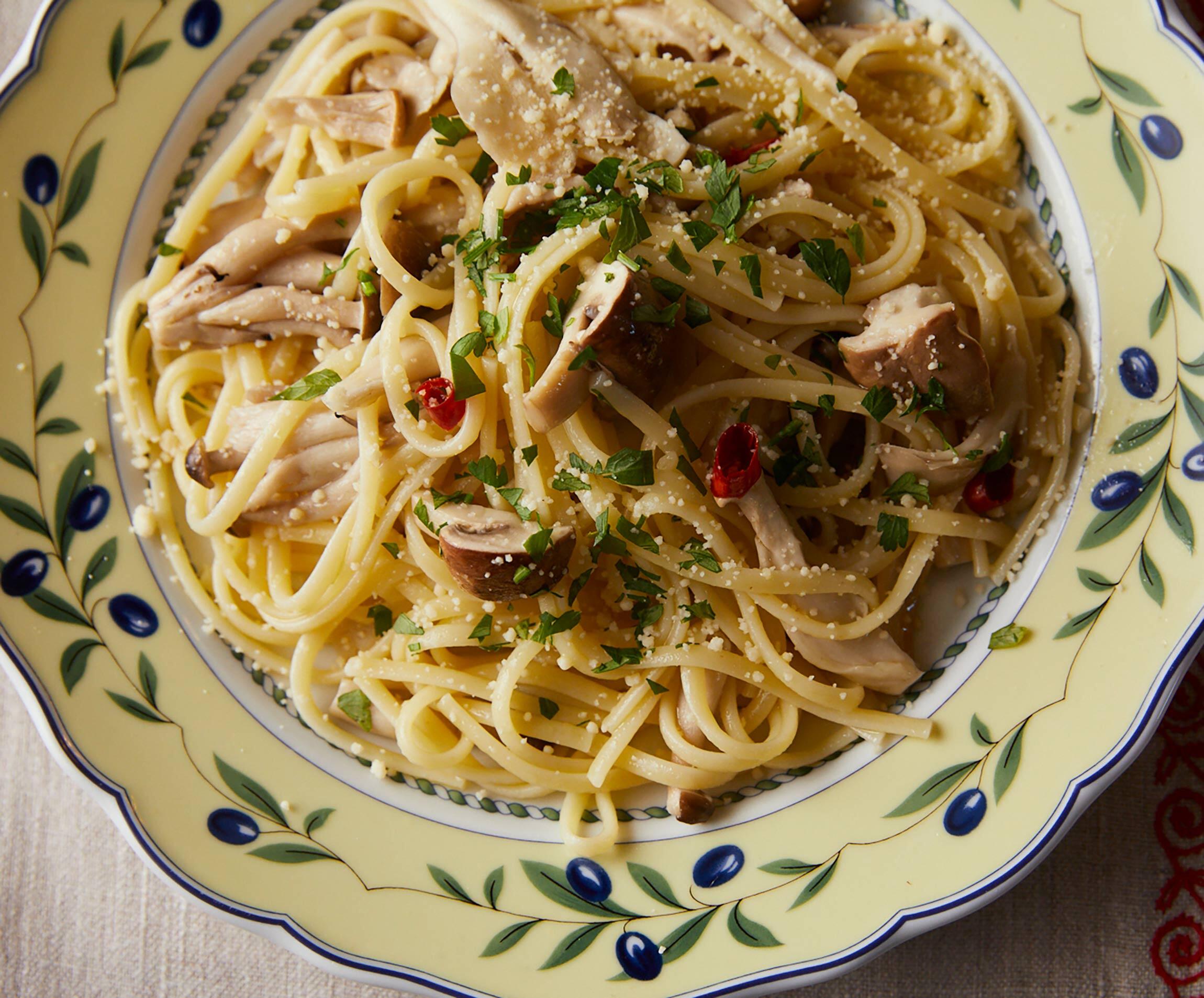 きのこの漬物さえあれば、ササッとつくれるお手軽パスタ。発酵のやさしい旨味が麺にからみます。ロシアではラプシャーという卵入りのショートパスタを使うのがポピュラーですが、ここではリングイネを折って使用。