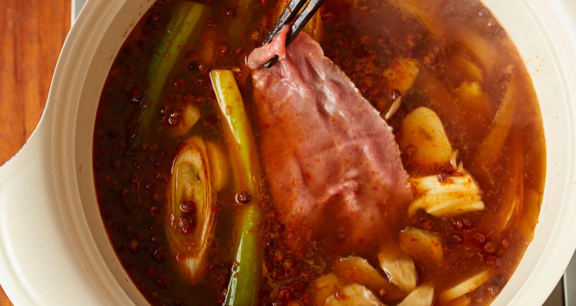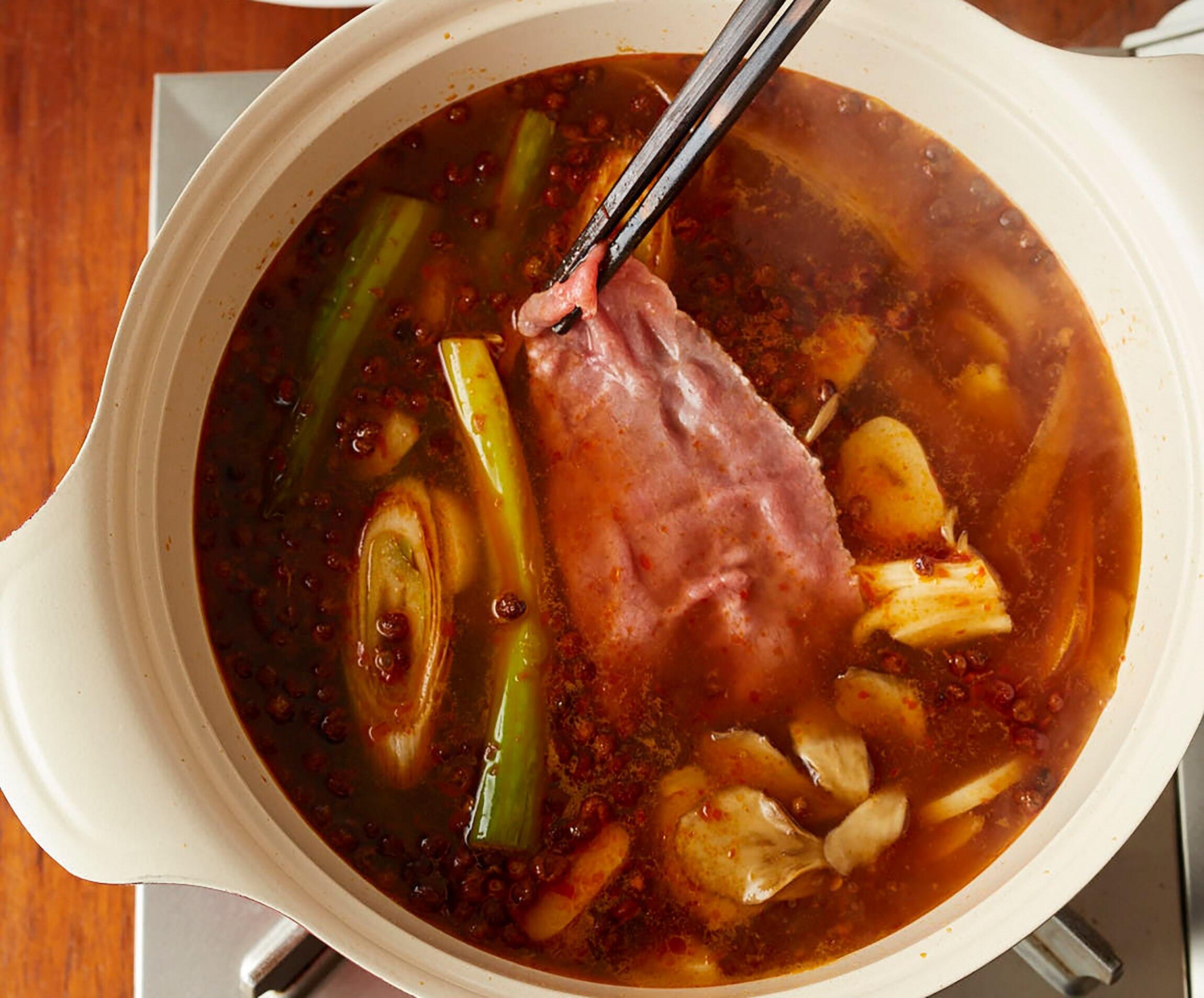 マーラー(麻辣)火鍋とは、中国ではポピュラーな辛い鍋料理。花椒の舌が痺れるような辛さ(麻)と唐辛子のヒリヒリするような辛さ(辣)が特徴です。今回の鍋は牛肉ですが、羊肉、豚肉でつくってもおいしいですよ。