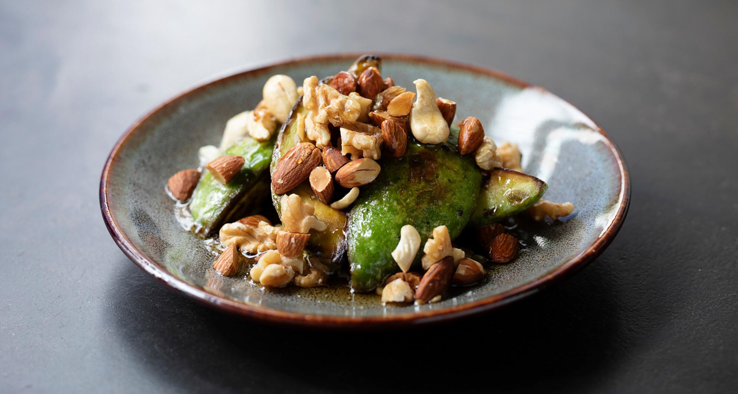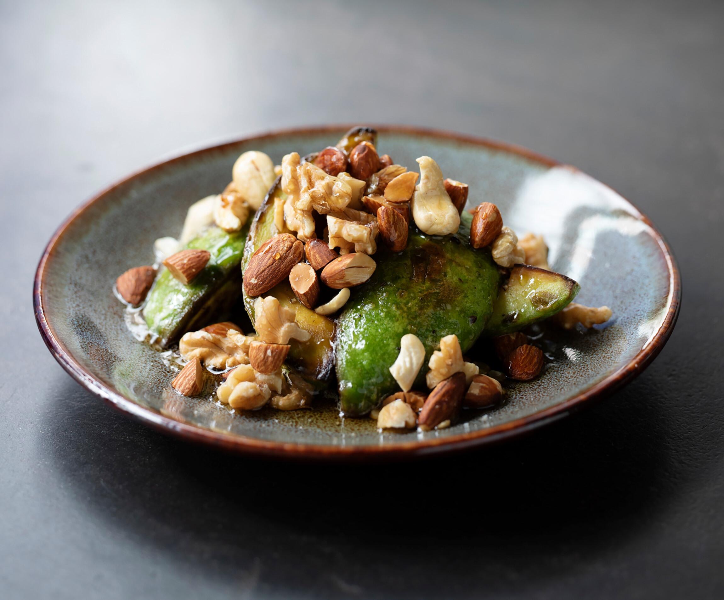 ありそうでなかなかなかった、アボカドのソテー。森のバターをバターで焼くという禁断の一手に添えるのは、カリカリのナッツとメープルシロップ。食べると意外やさっぱりとしていて、甘じょっぱさにワインがすすむこと請け合い。