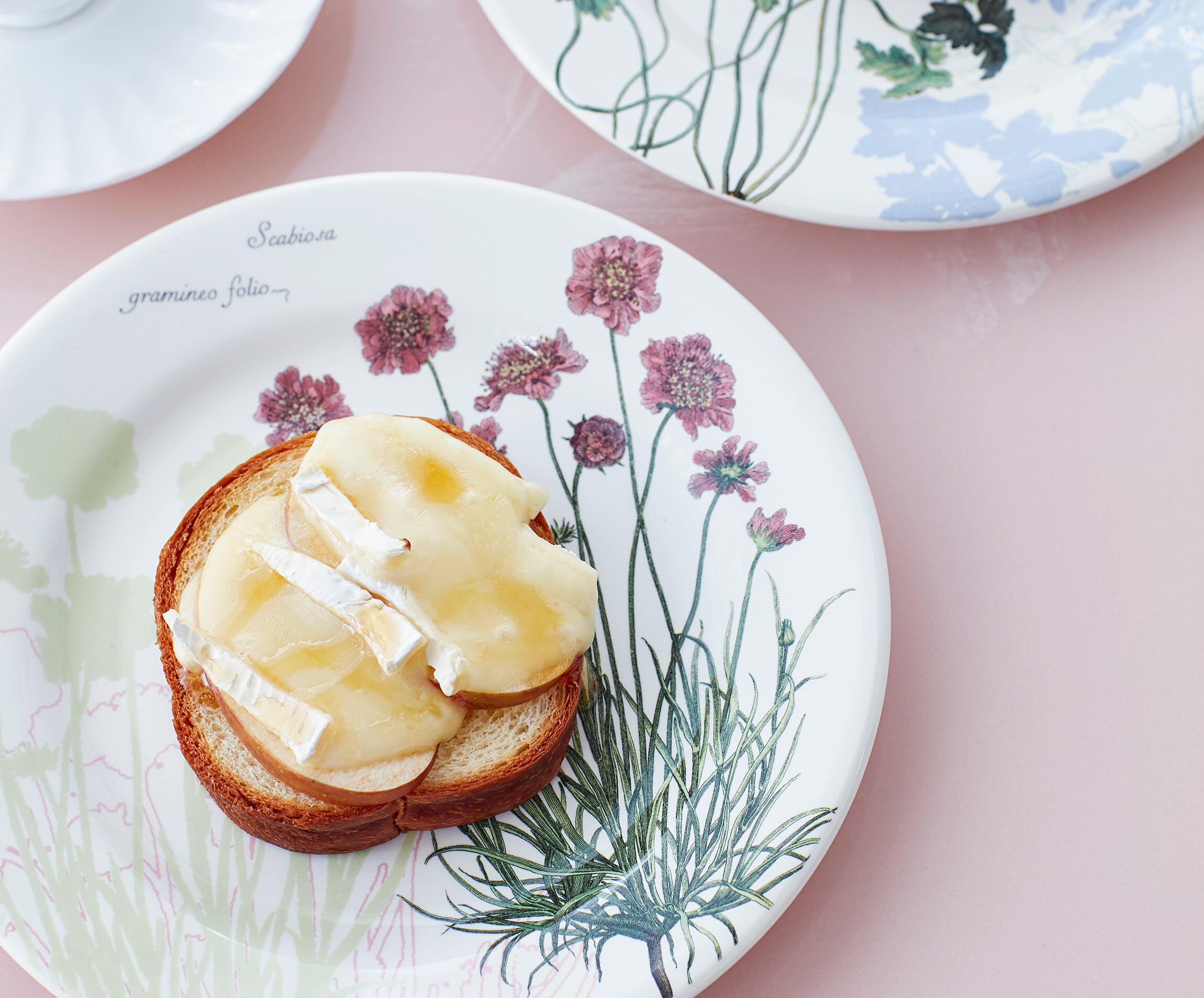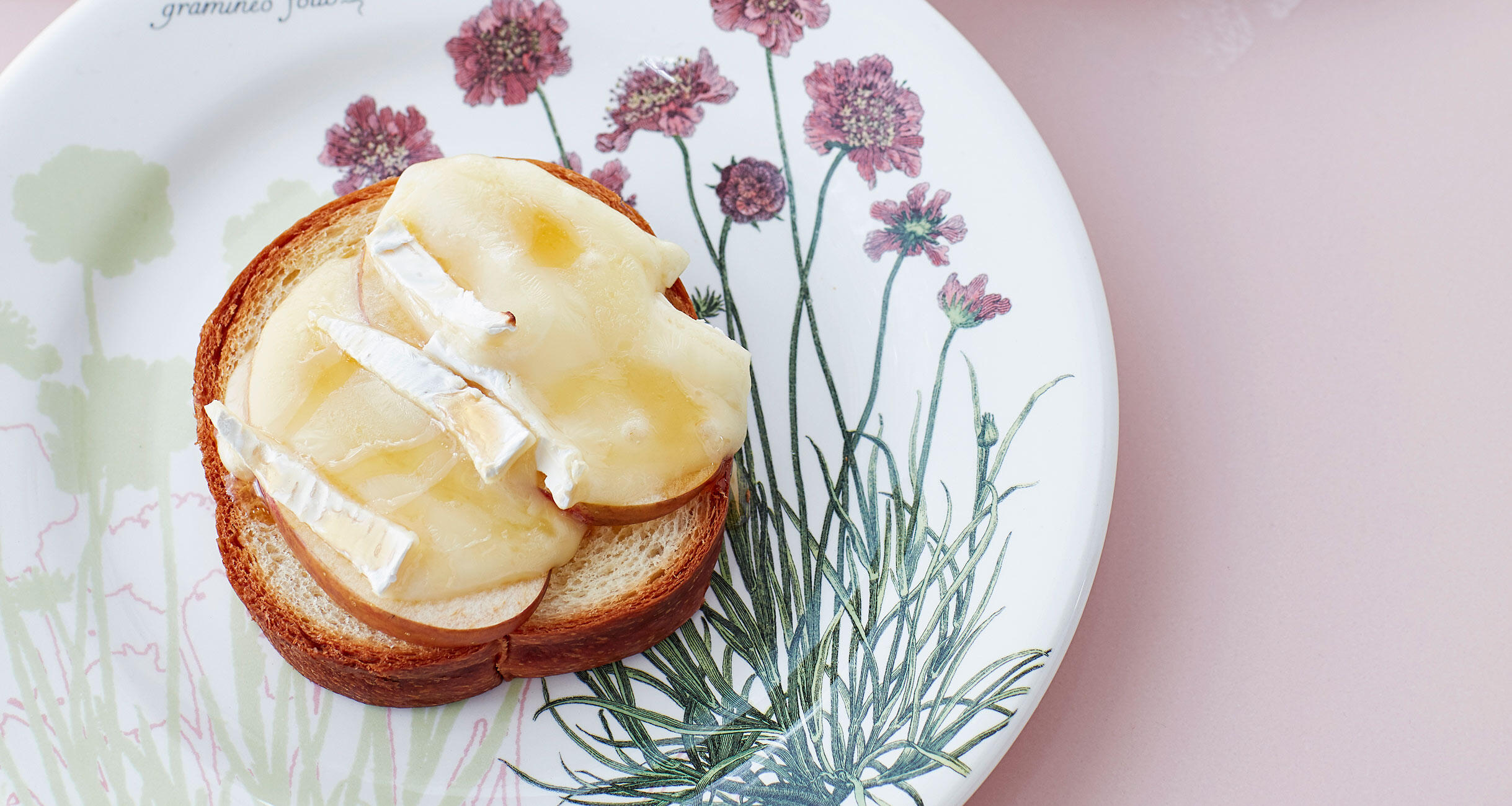 りんごは、赤い色が濃いものを選ぶと見た目が華やかに。また、ふじなど、歯ごたえのサクサクとしたものを選ぶと食感にアクセントが出る。ブリーの濃厚でミルキーな味わいは、苦めのカフェオレやブラックのコーヒーともよく合う。はちみつとの相性も抜群。