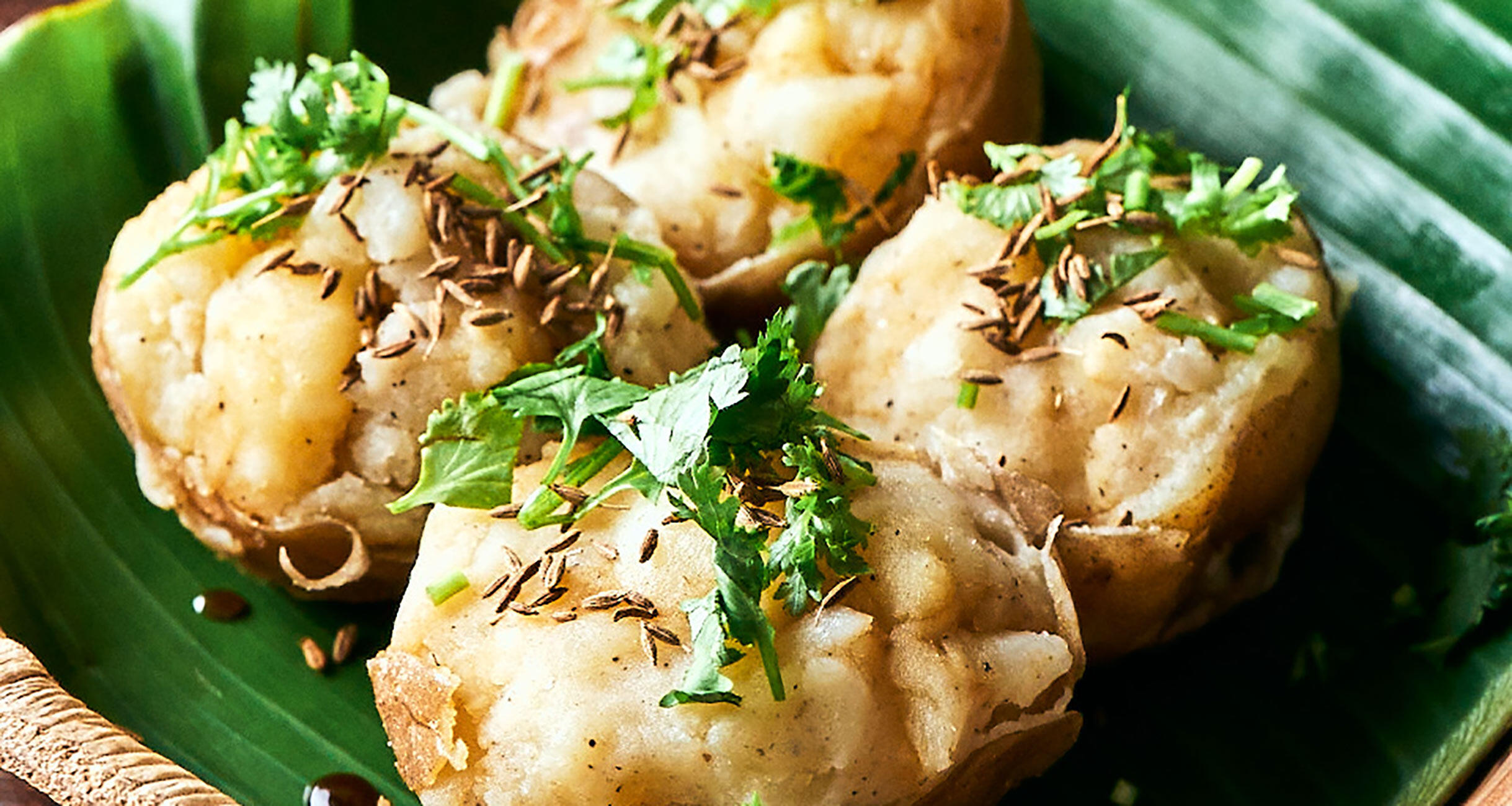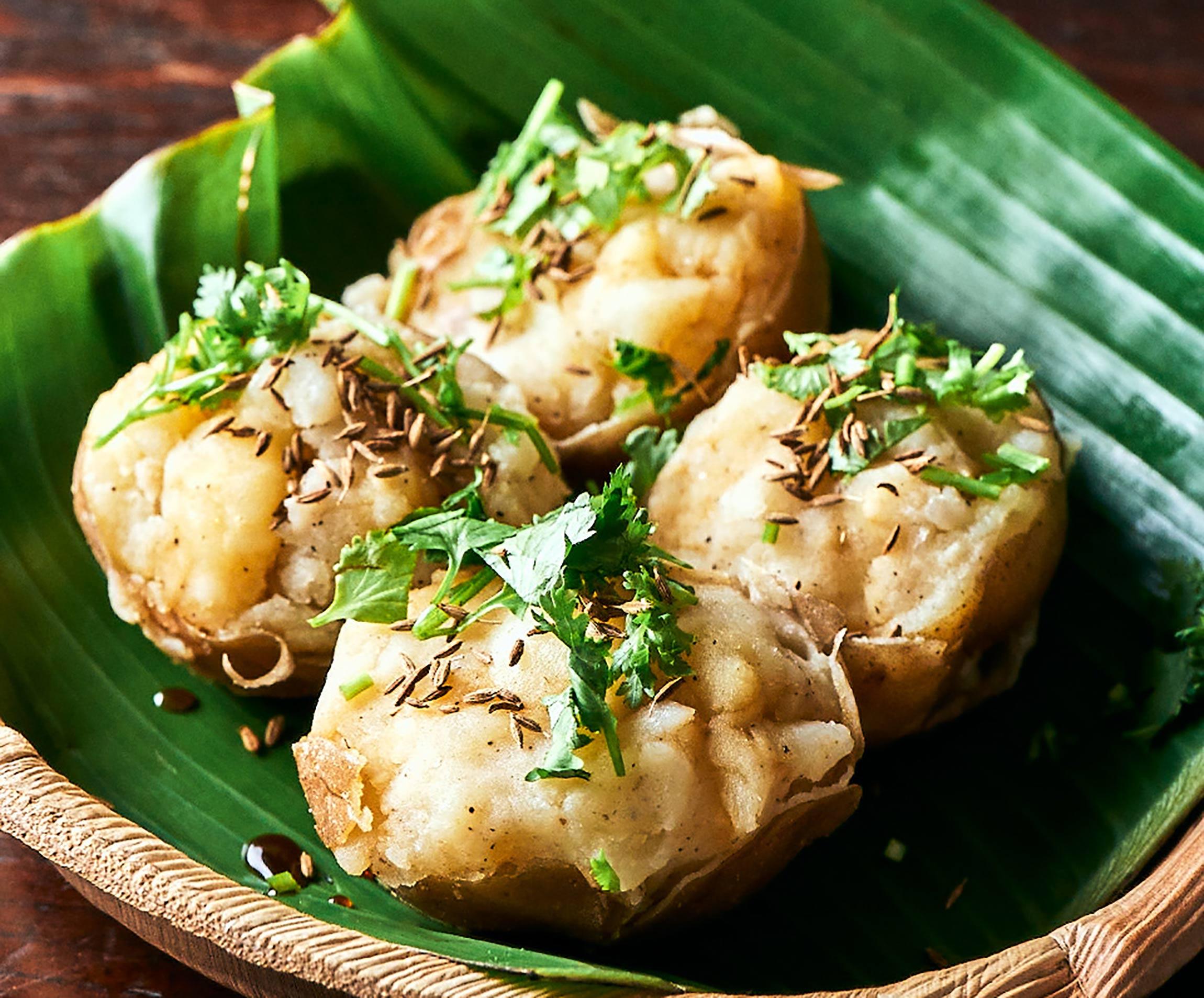 粗くつぶしたじゃがいもにたっぷりのバターを溶かしながら混ぜるのがミソ。口の中で溶けるような優しい食感に仕上がる。ガラムマサラの風味がふわっと広がり、カリカリに煎ったクミンの食感がおいしさを盛り上げる。意外なほど醤油がよく合い、ビールがすすむ!