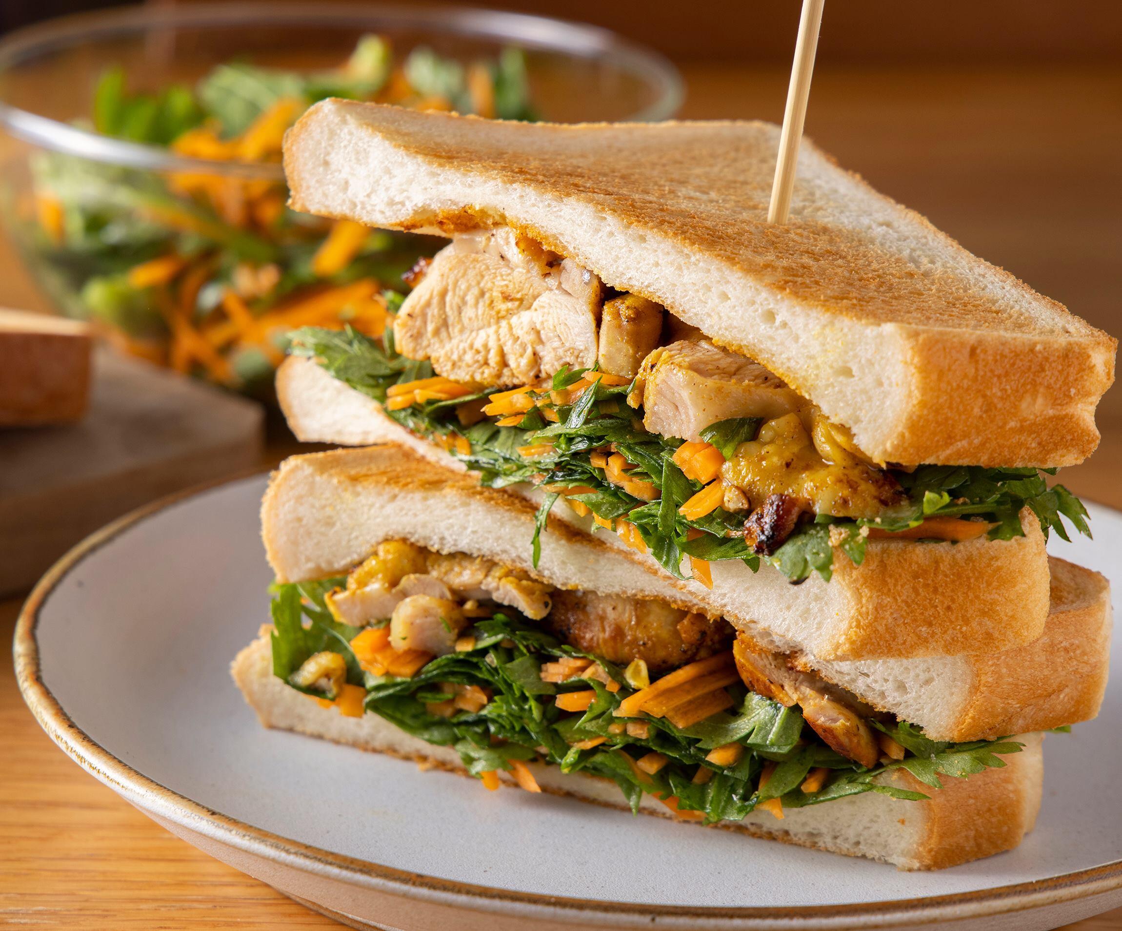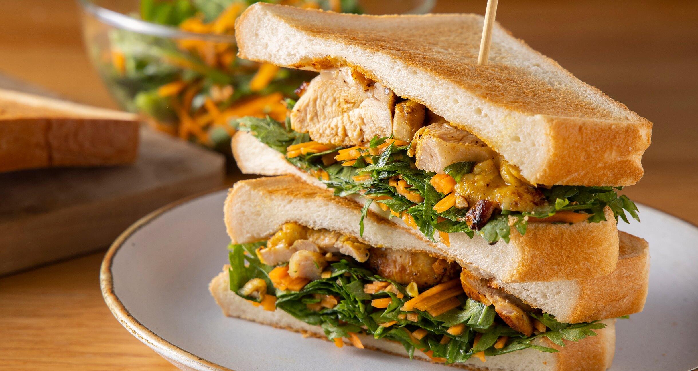 濃口ごま油が深く香る!ボリューミーなサラダとチキンのトーストサンドイッチです。教えてくれたのは、料理家の山田英季さん。ビタミンA(カロテン)が豊富な春菊とにんじん、良質なタンパク質の鶏肉と、希少成分セサミンを含む「純正ごま油 濃口」のマッチング。食パンで挟めば、一品で簡単おいしいバランス食の出来上がりです。