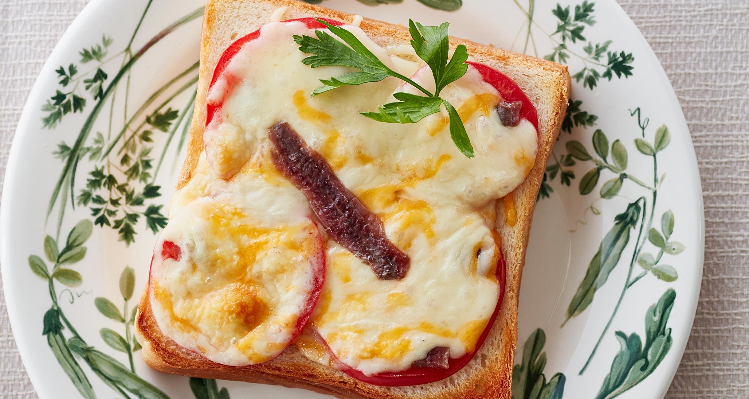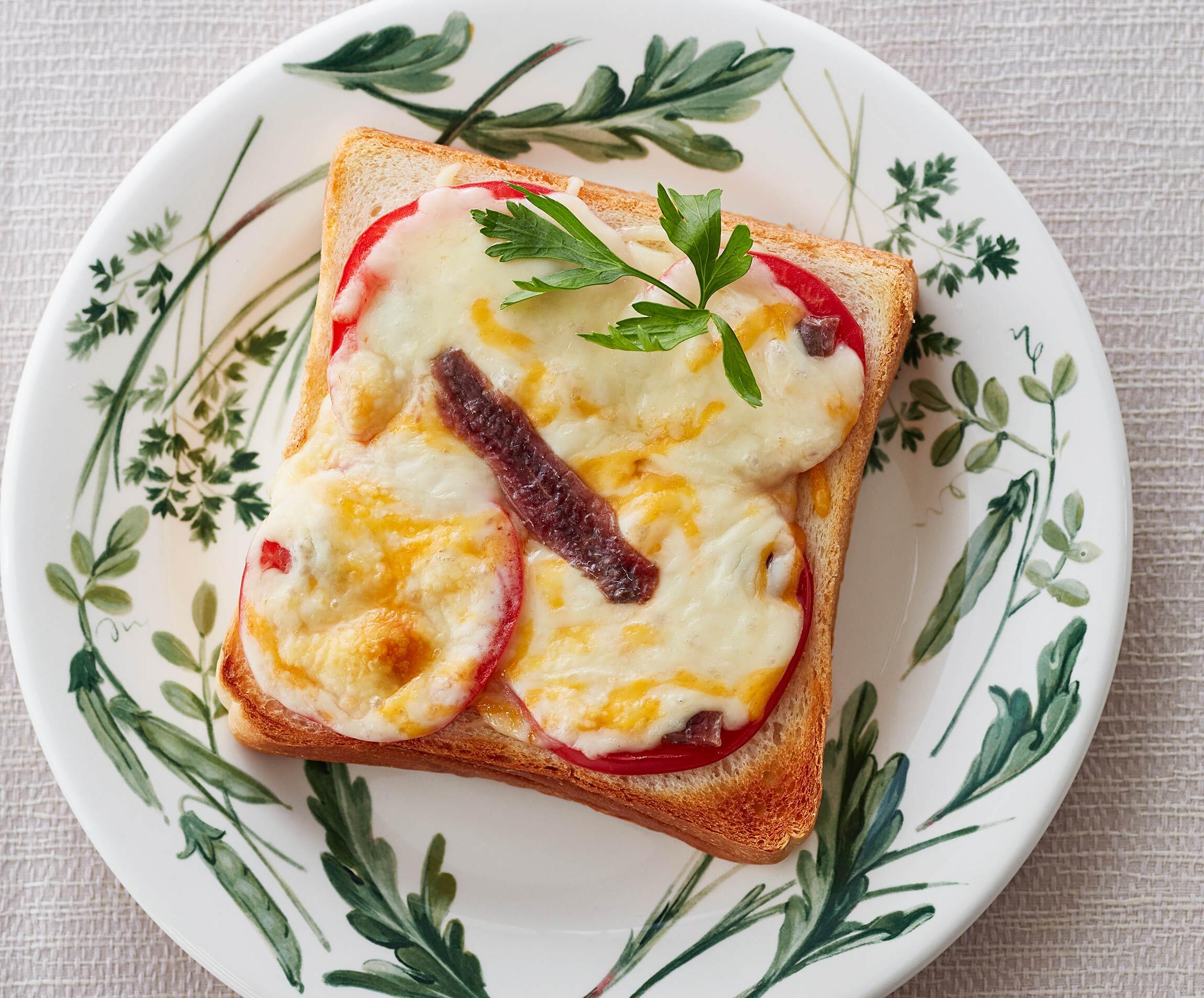 アンチョビフィレの塩気とトマトのボリュームで、ピザトーストのような満足感を得られるトースト。トマトはミニトマトに代えてもよし。水分が出てしまうので、パンに具材をのせたらすぐに焼き、早めに食べるのがおすすめ。