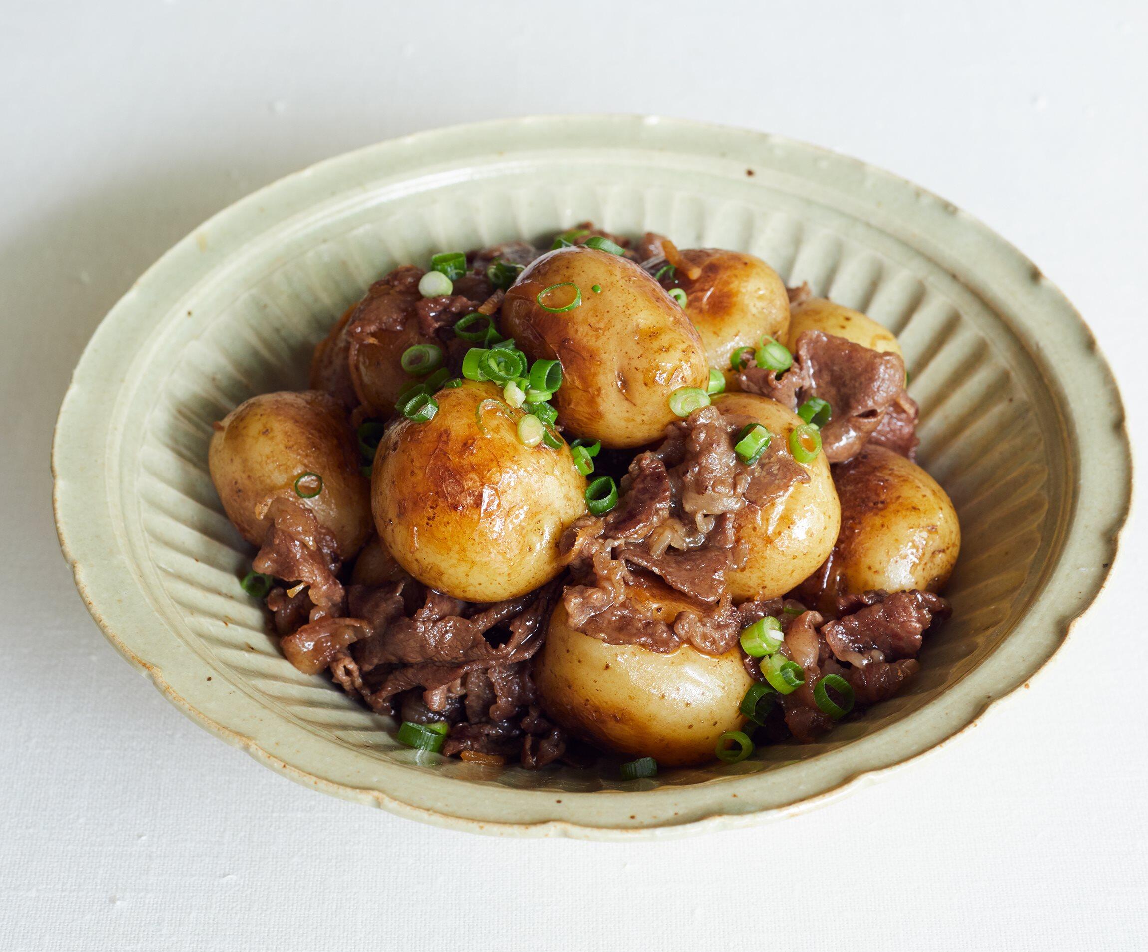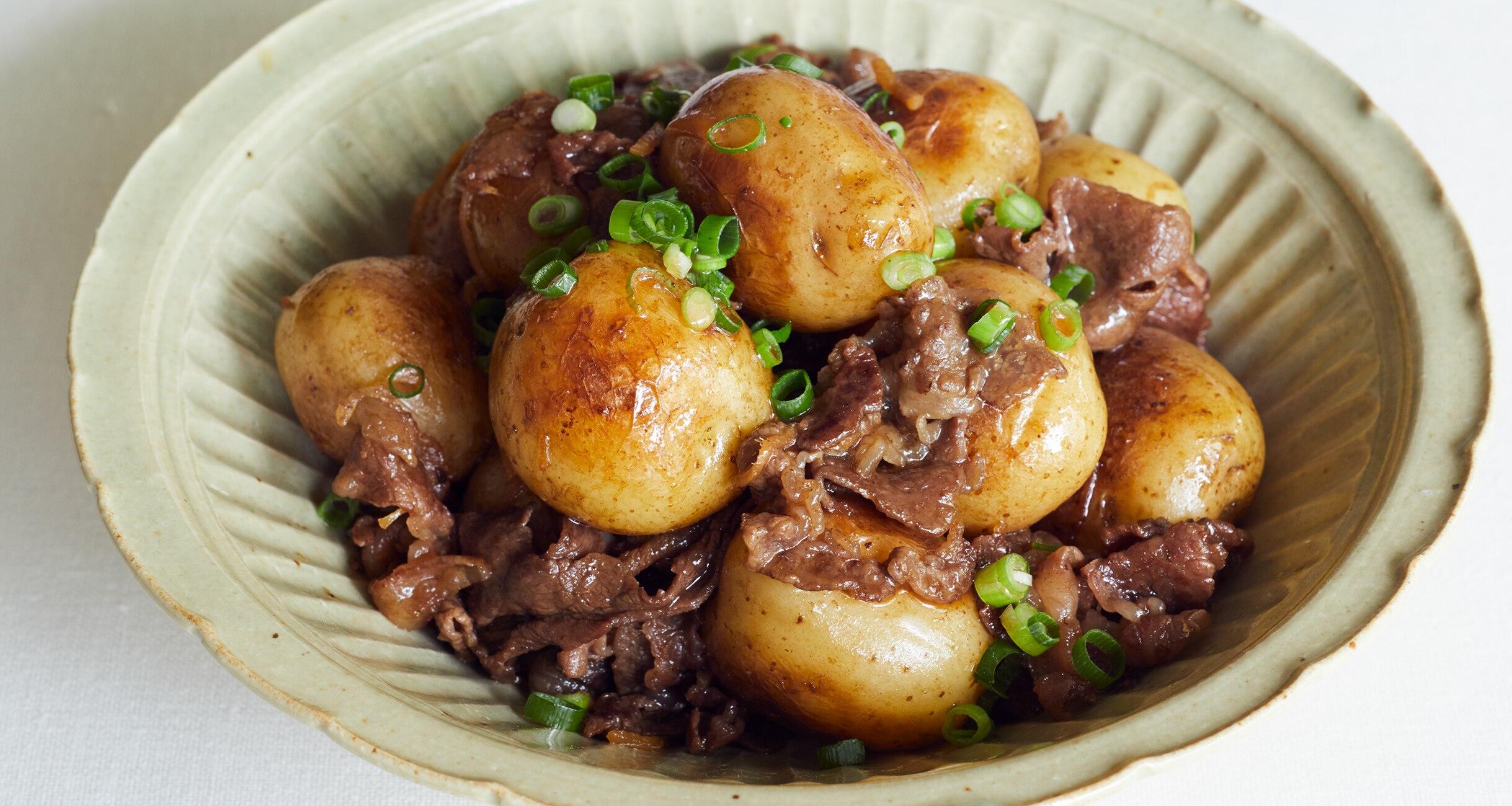 安心の甘辛味。牛肉を加えてちょっとぜいたくな煮物に。じゃがいもを焼きつけて、表面を油でコーティングしてから煮ると、香ばしくてグッと旨味が増します。