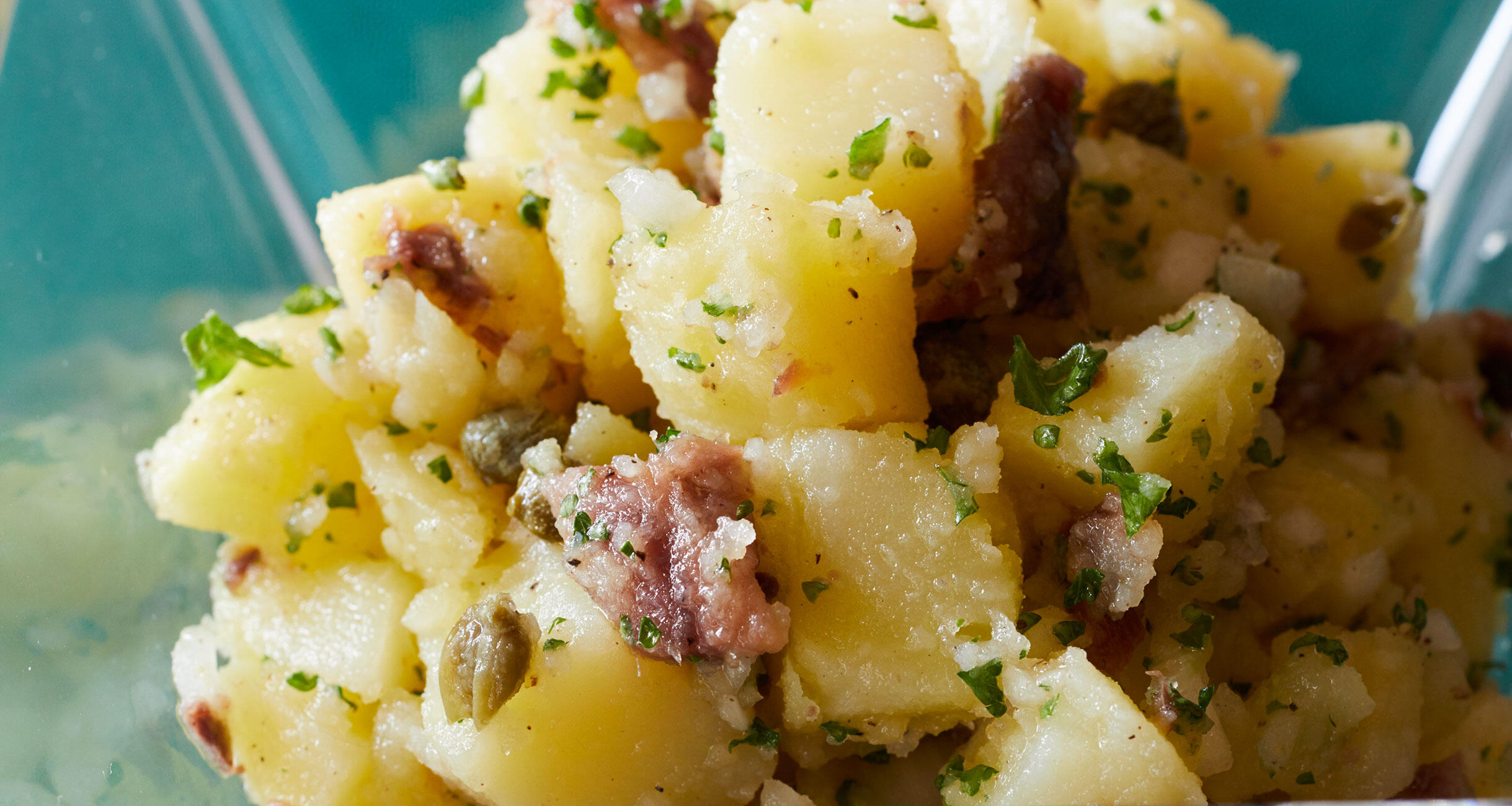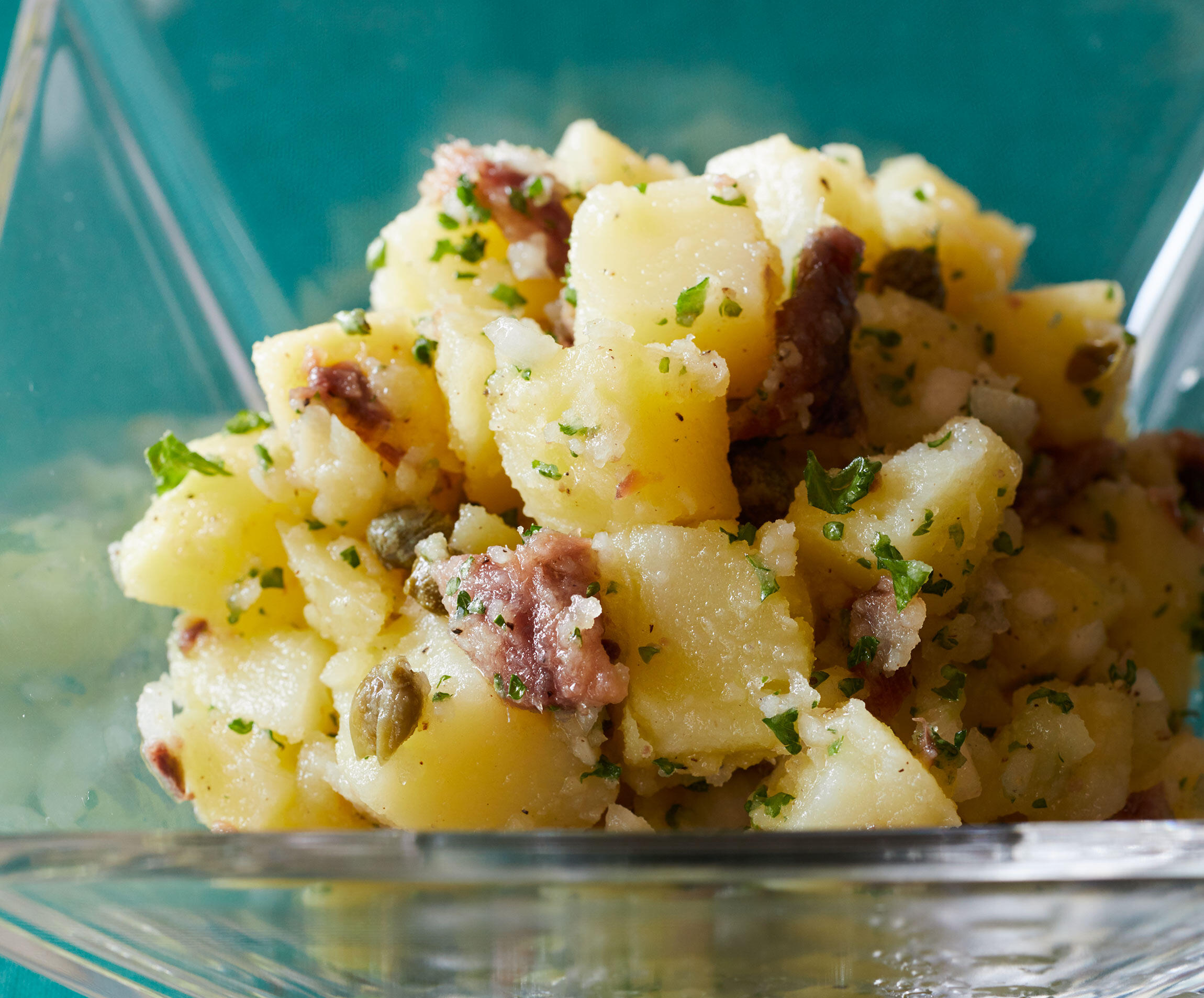 新じゃがのみずみずしい味わいが楽しめます。イタリアの旨味素材であるアンチョビにケイパーもプラスしてダブル旨味効果。白ワインのお供にもおすすめです。