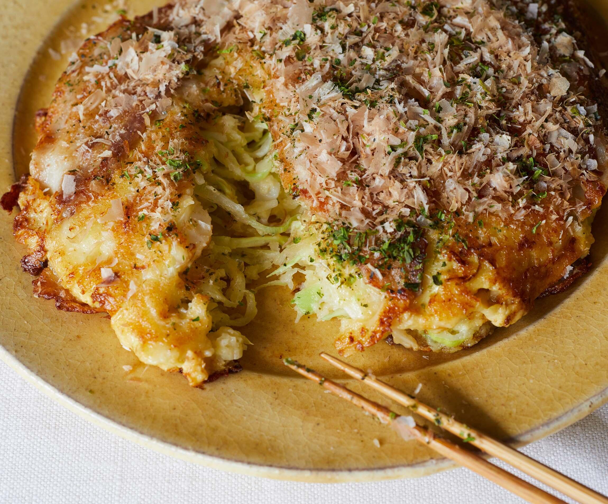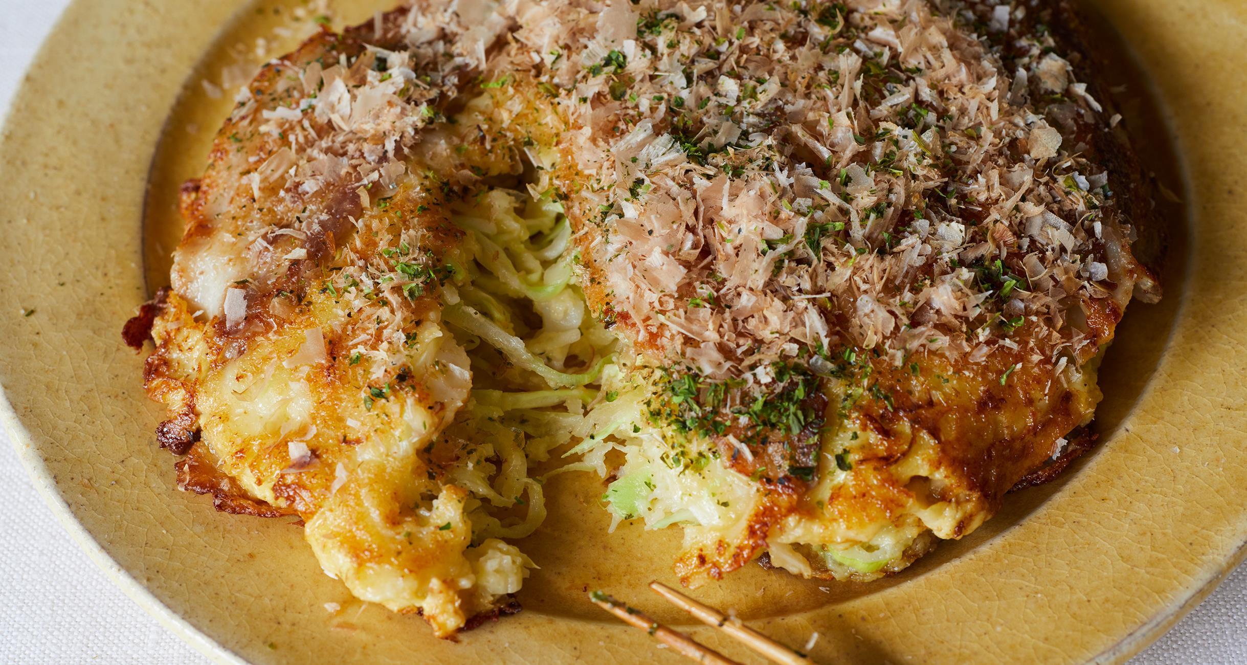 直径26cmのフライパンにサラダ油小さじ1を薄くひき、中火で熱して豚肉を並べ、その上に3の生地をのせる。中火で3~4分焼いてから弱火にして4~5分焼く。裏に返してサラダ油大さじ1をまわりから流し入れて中火で3分ほど焼き、さらに弱火で4~5分焼く。器に盛って醤油を刷毛で塗り、削り節、青海苔粉をふる。