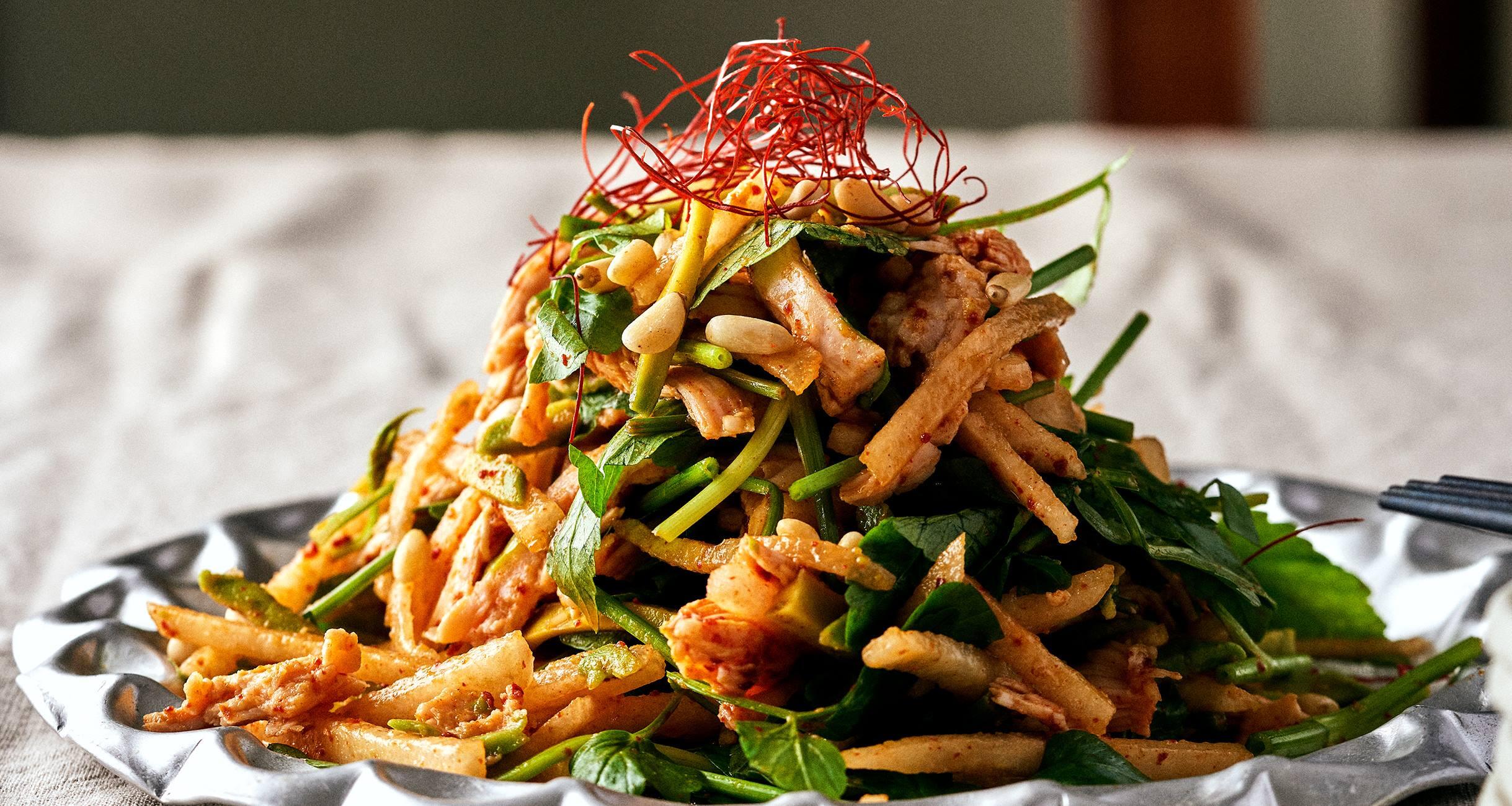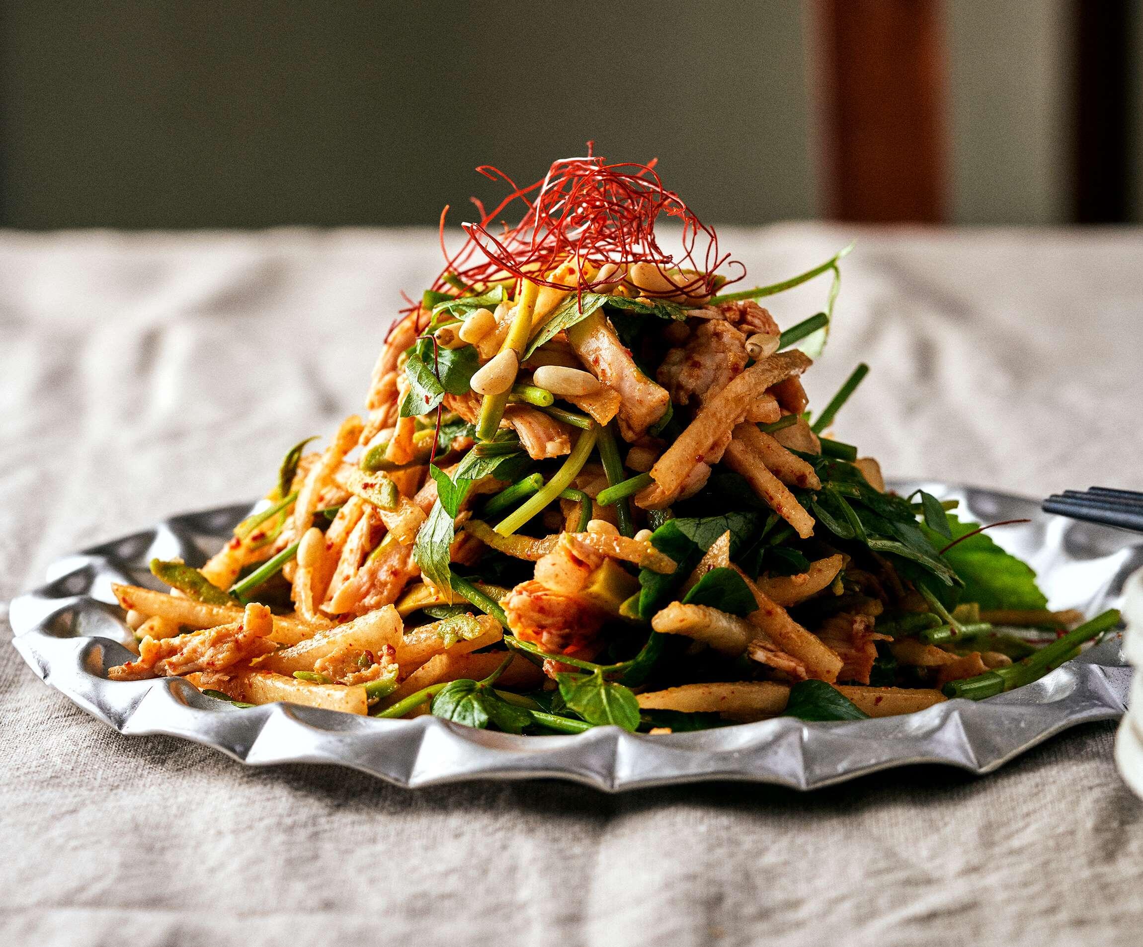 せん切りにしたかたいアボカドは新食感。セリの清らかな香りと、やわらかな辛味の韓国唐辛子がきいた重層的な味わいだ。パプリカパウダーと糸唐辛子で赤色を補った鮮やかな一皿。