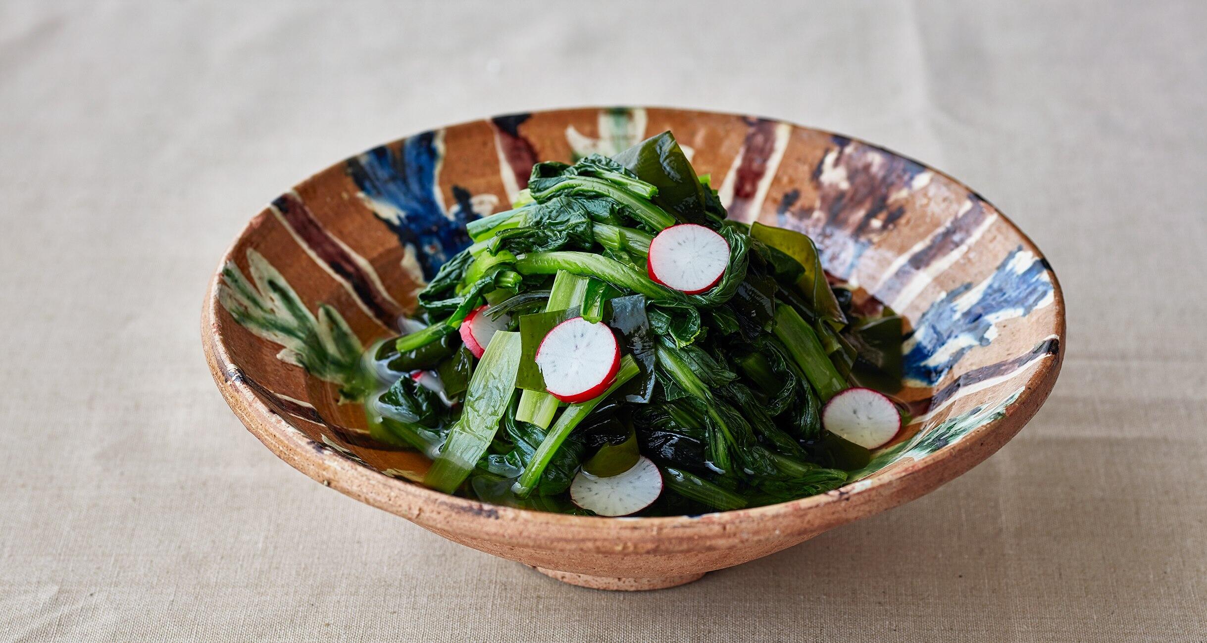 小松菜はゆでて水気を絞り、長さ5cmに切る。新わかめはざく切りにする。ラディッシュは薄切りにする。