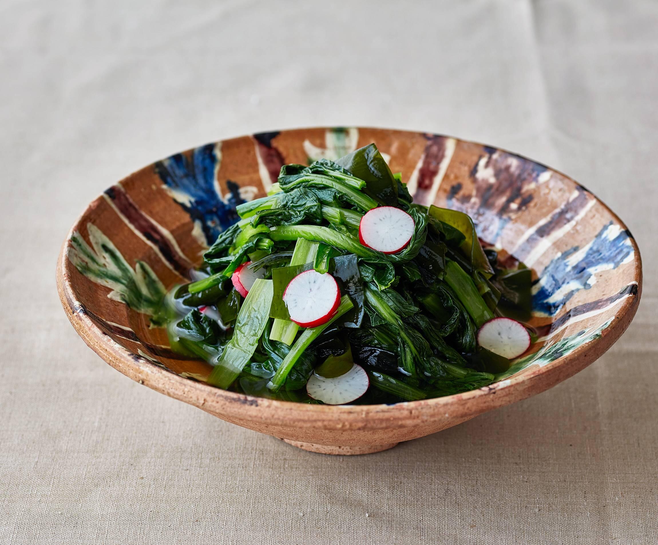 春に美味しいい新わかめと青菜をゆでて、だしに漬けたお浸しは家呑みの定番料理。歯ごたえのいいラディッシュも加えて、大鉢にたっぷり盛ってテーブルに。ポイントは、甘味は加えずに、2倍くらいの濃さのだしでつくること。手軽な袋入りのだしでも十分美味しくつくれる。