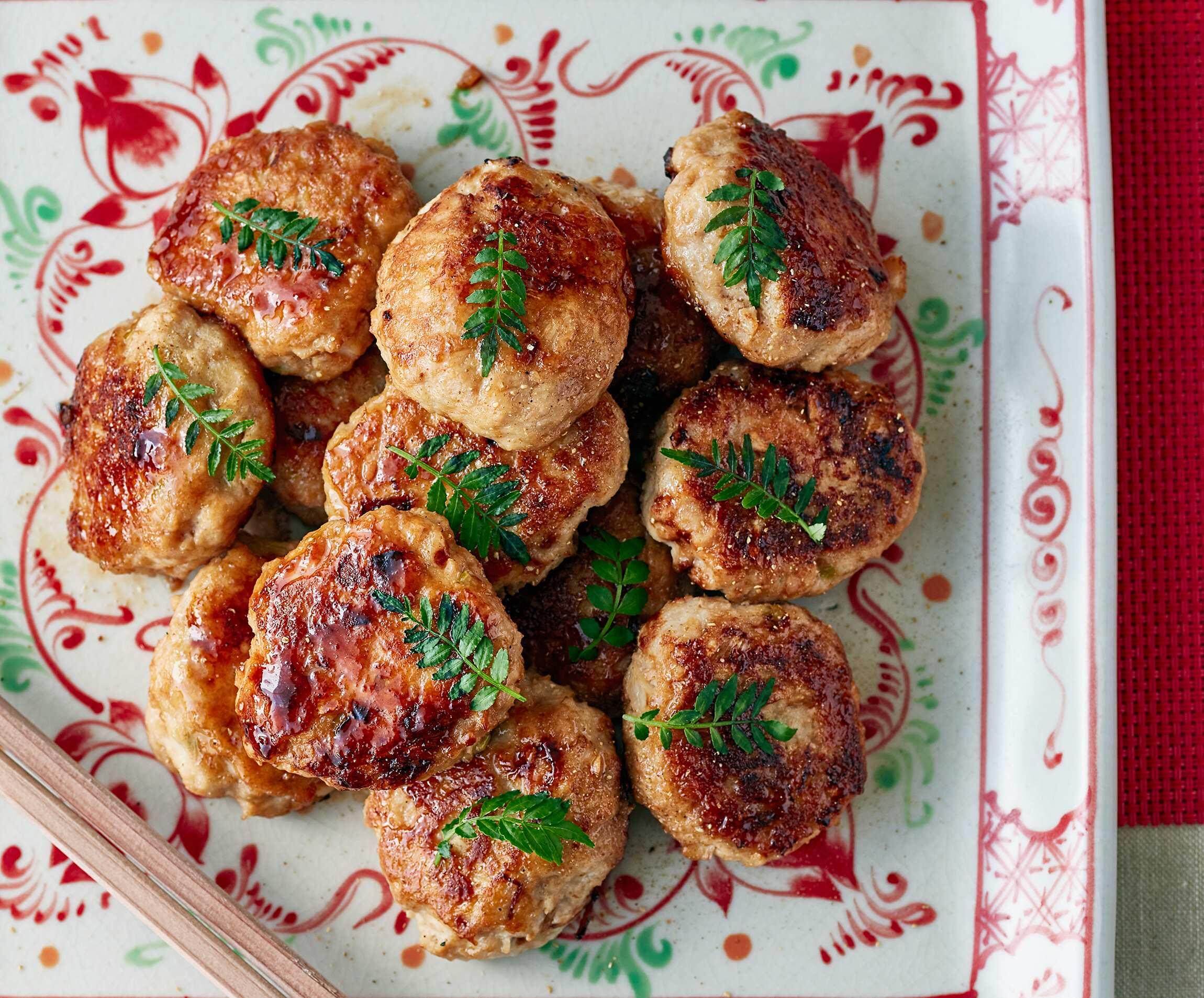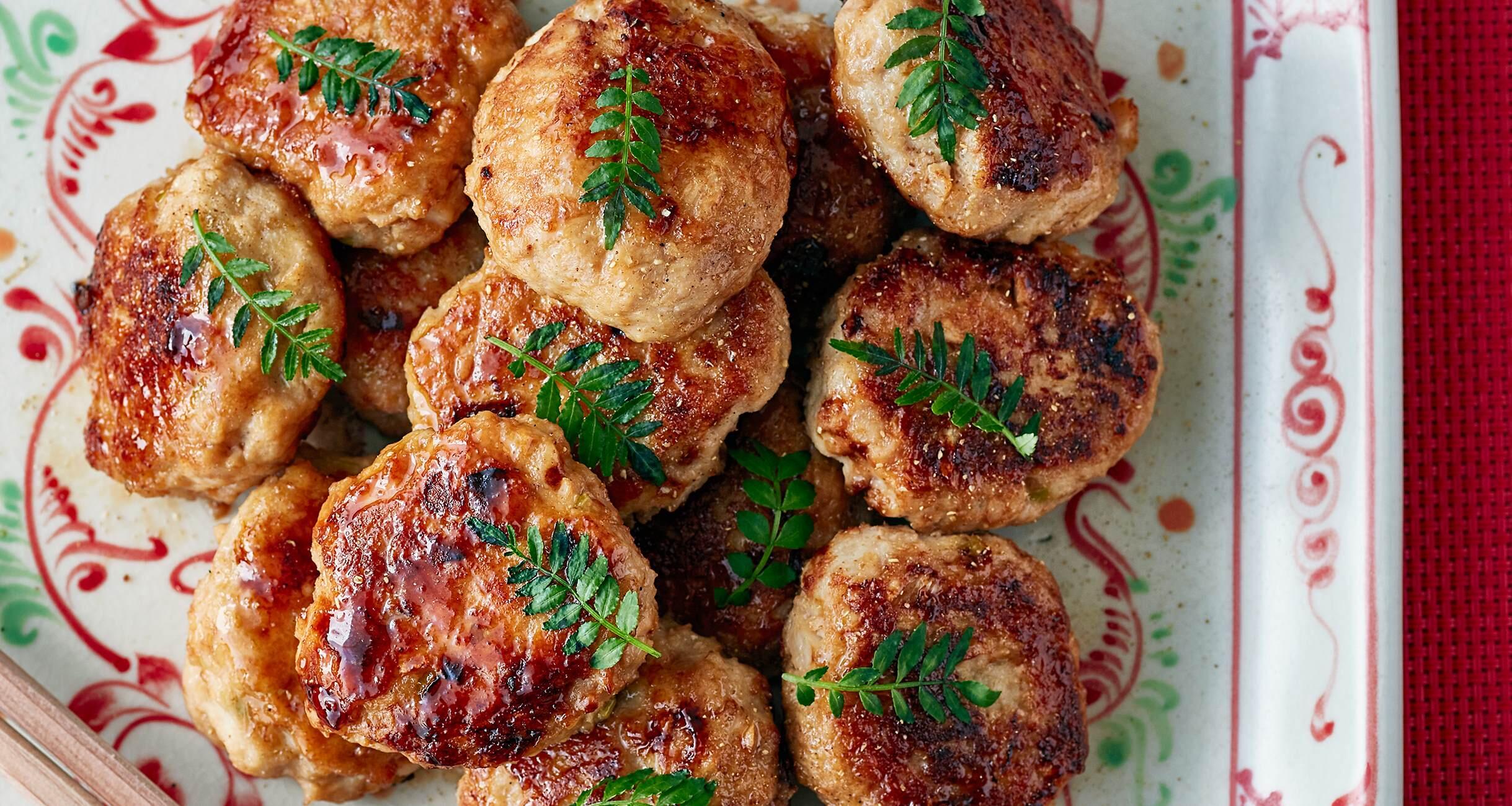 フライパンで甘辛いたれをからめ、おいしそうな照り焼きにして、小さめの小判形にして焼くことで、手が伸びやすくなる一品です。豆腐入りの鶏挽き肉のたねに混ぜ込んだ、春のたけのこの食感が楽しい。冷めてもふんわりやわらかだから、子供やお年寄りにも喜ばれそう。平皿に山積みにして盛り、粉山椒と木の芽を。