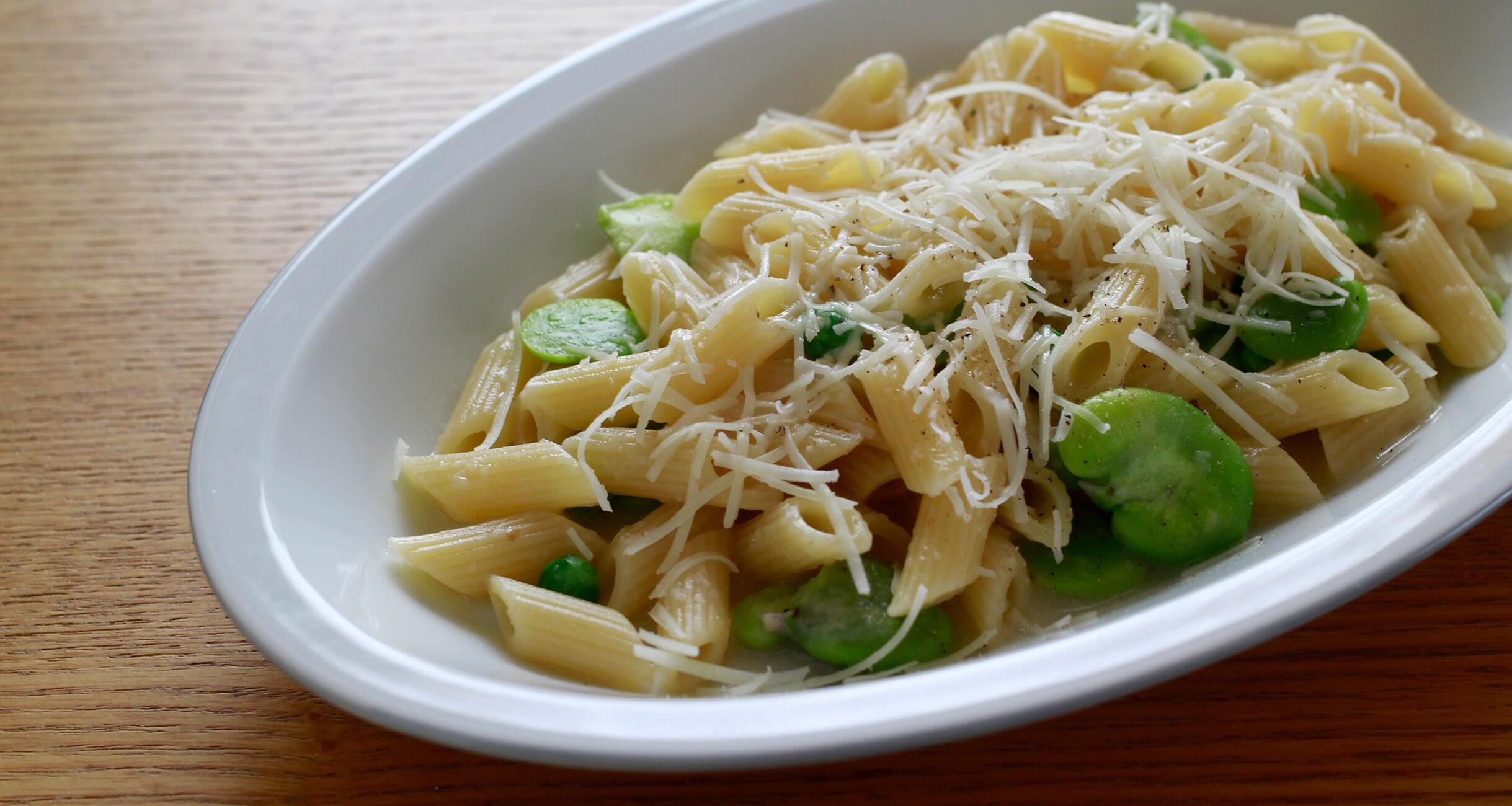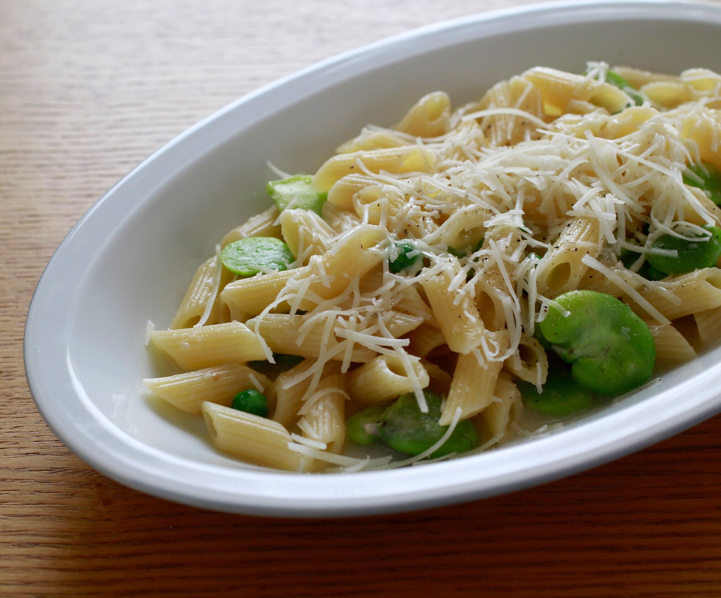 コロコロした具材には、ショートパスタが相性◎。この日は、珍しい短いペンネ「ペンネッテ」を使いました。パスタと豆を一緒にゆでて、チーズと和えるだけの簡単パスタ。