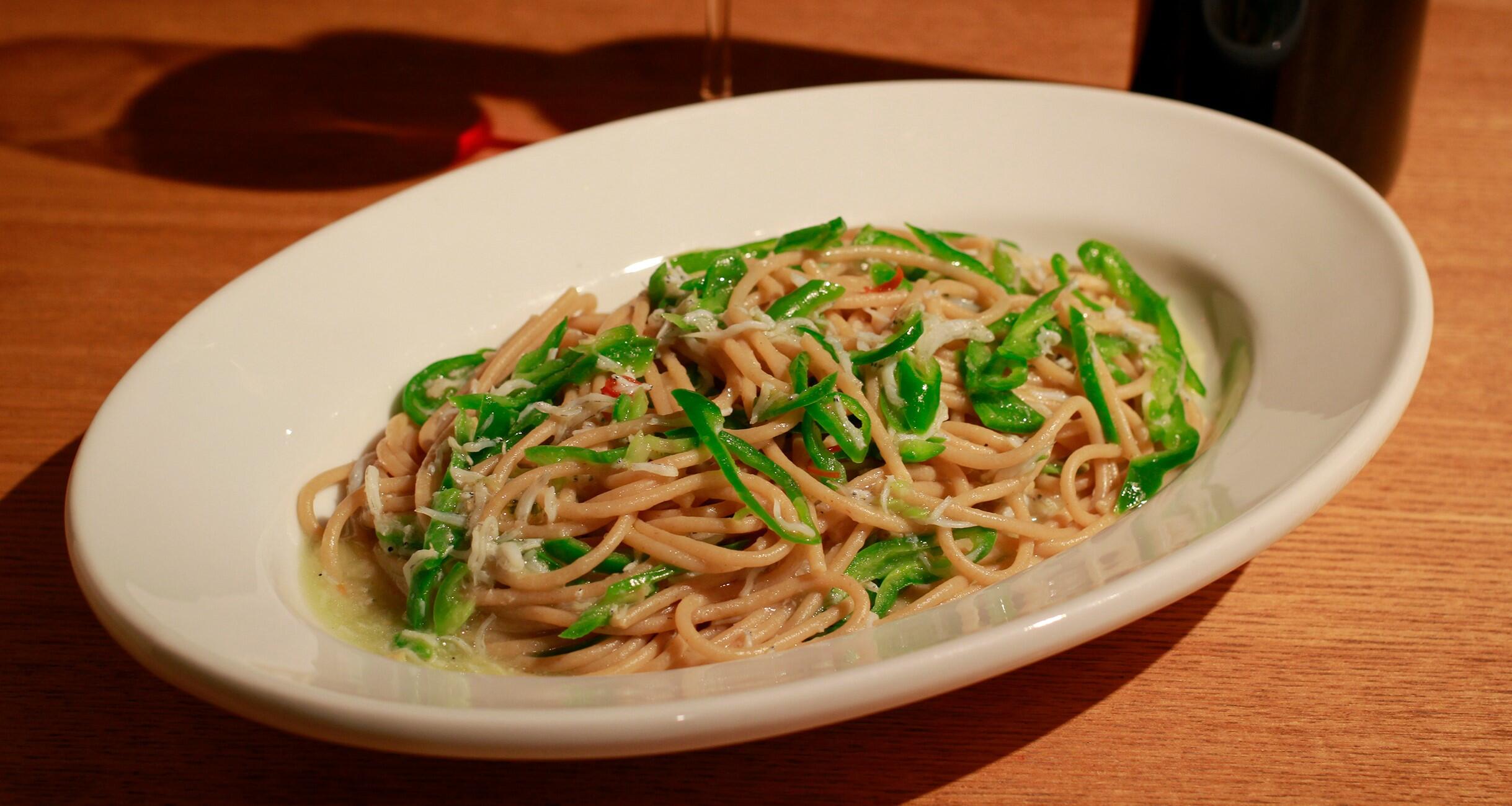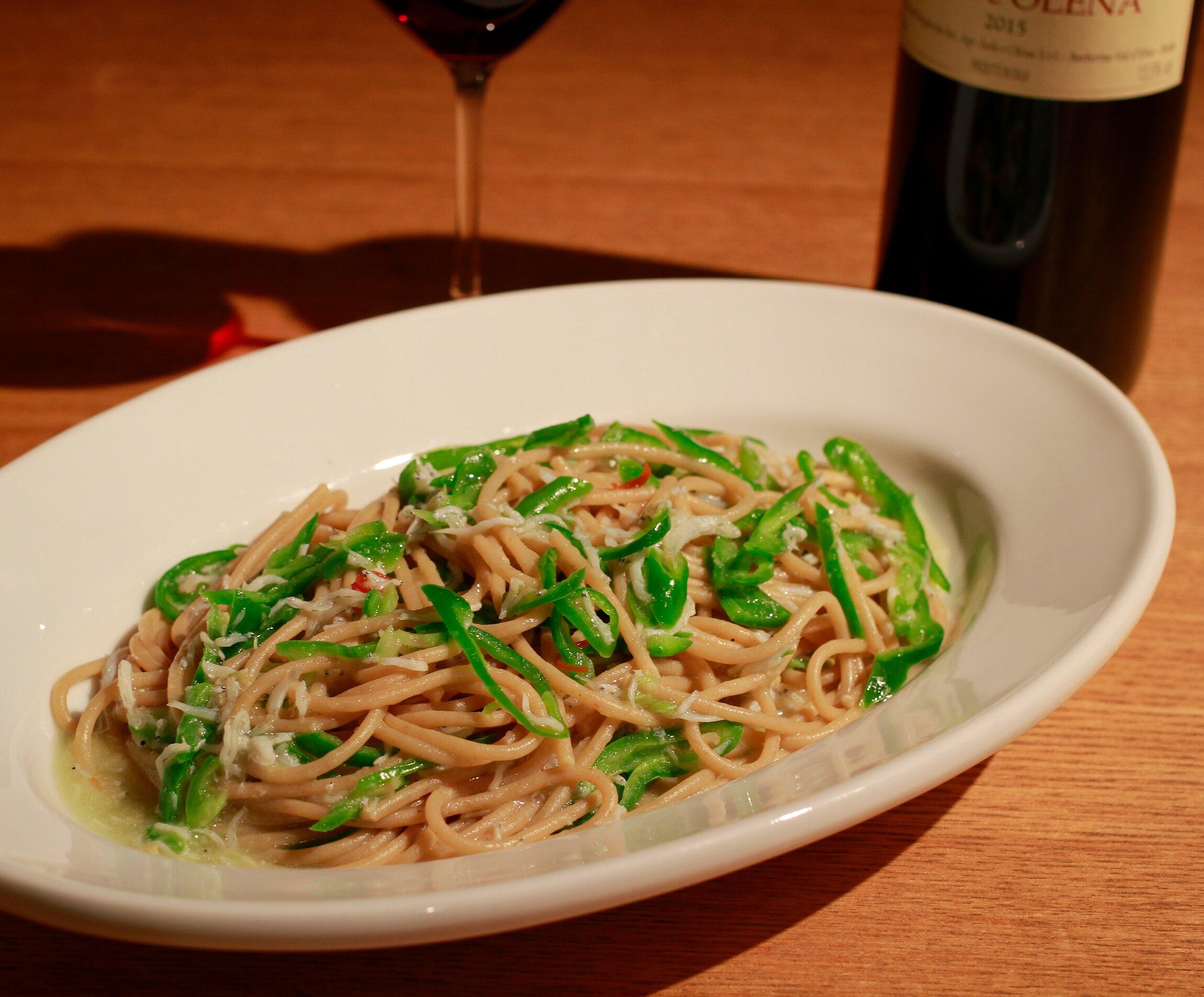 香ばしい全粒粉のパスタと、ほろ苦い万願寺唐辛子で、オイルパスタに。これが意外に、赤ワインの渋みと合うんです。万願寺唐辛子は、シャキッとした食感を生かしたいので、さっと加熱するだけでOK。