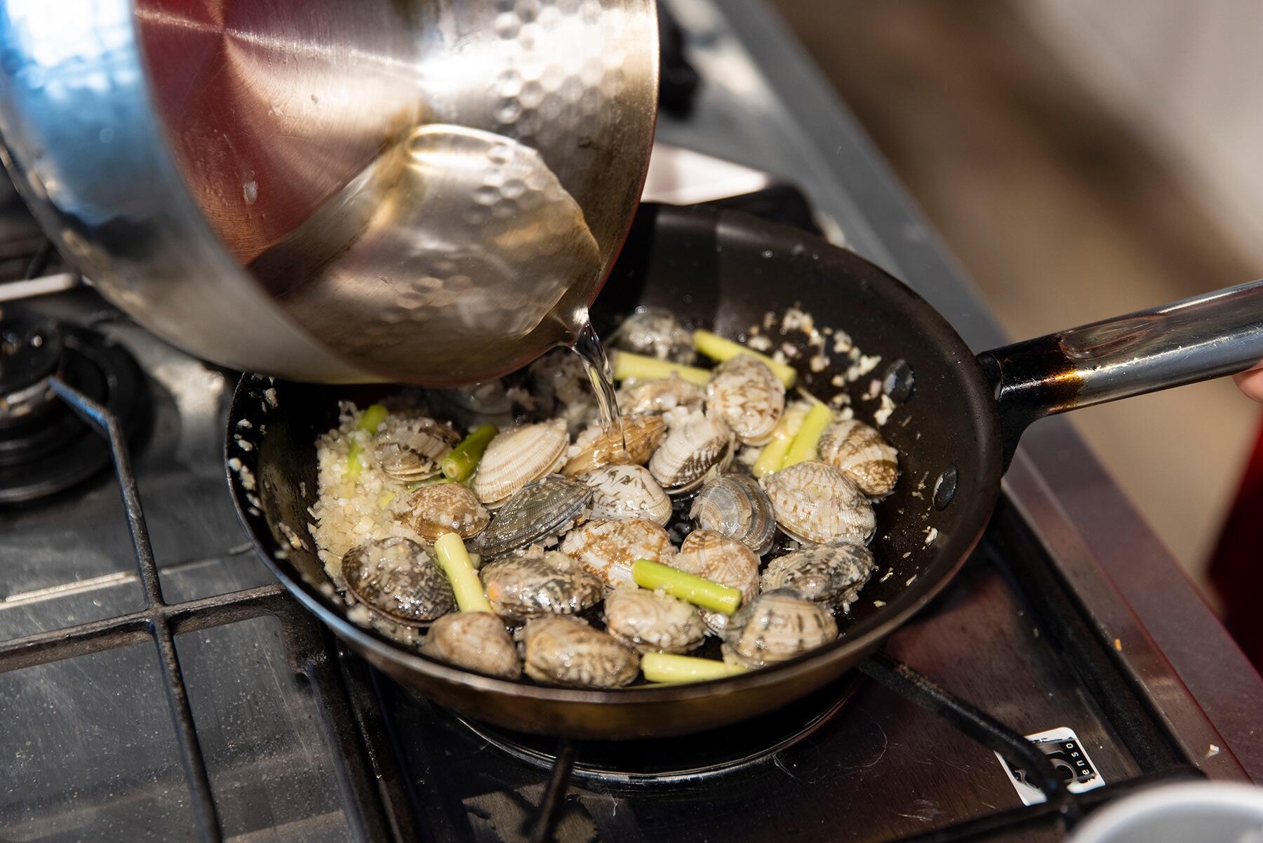 1のフライパンに水、酒を入れ中火にし、蓋をしてあさりの口が開くまで待つ。水、酒の量の目安は、あさりが半分つかる程度。