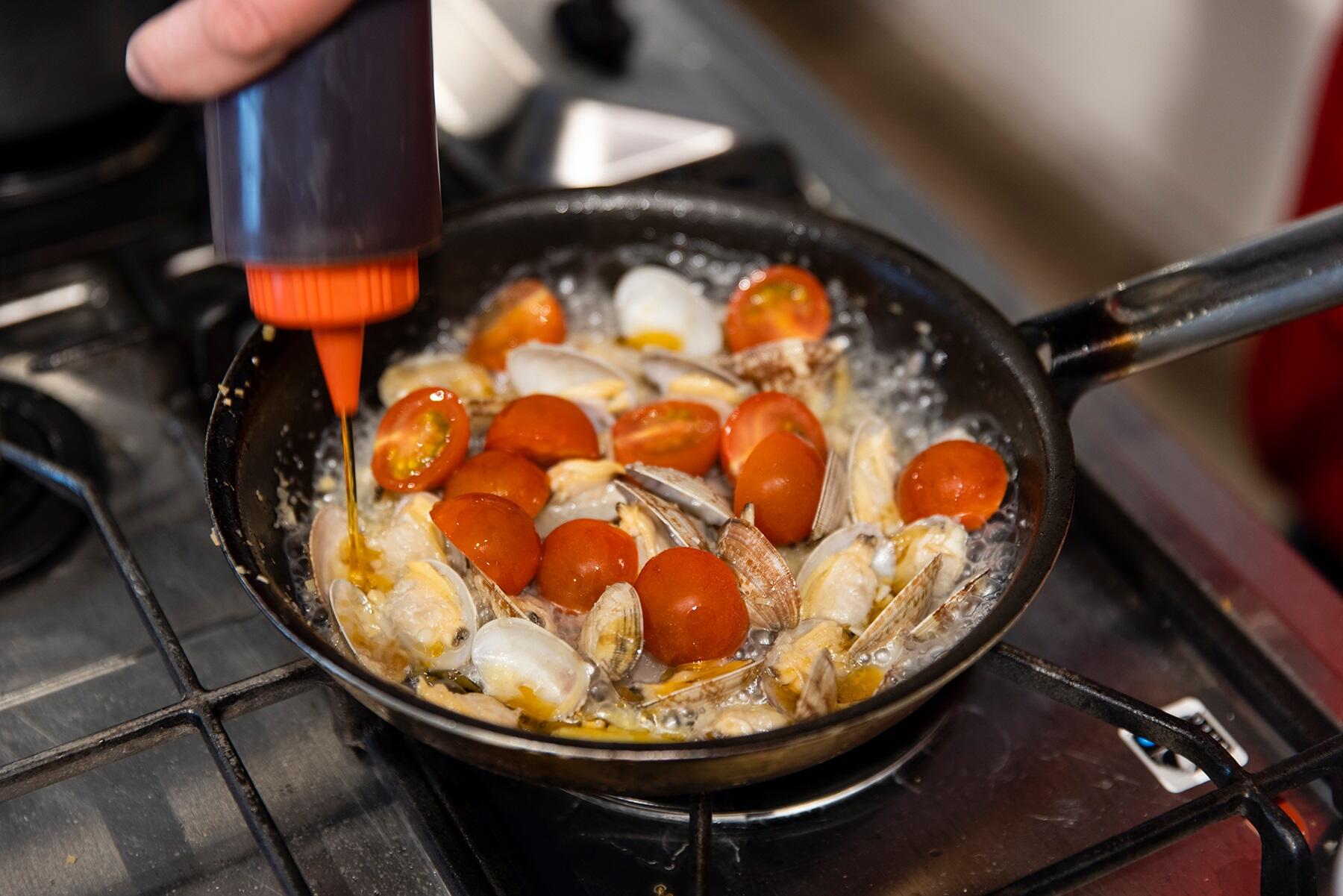 あさりの口が開いたらナンプラー、プチトマト、胡麻油を入れ強火にし、ソースが乳化するまで炒める。口が開かないあさりを残すと生臭くなるので、炒めながら素早く取り除く。