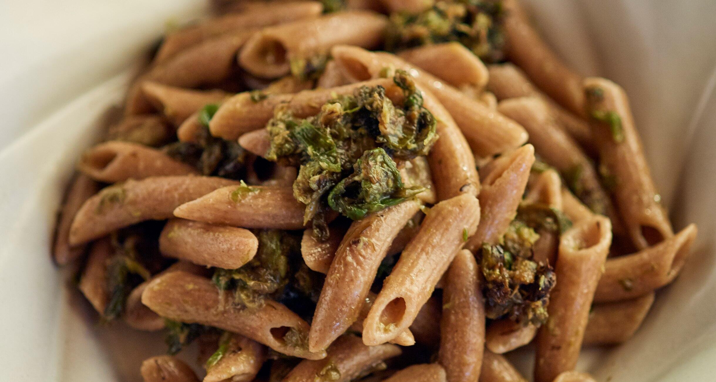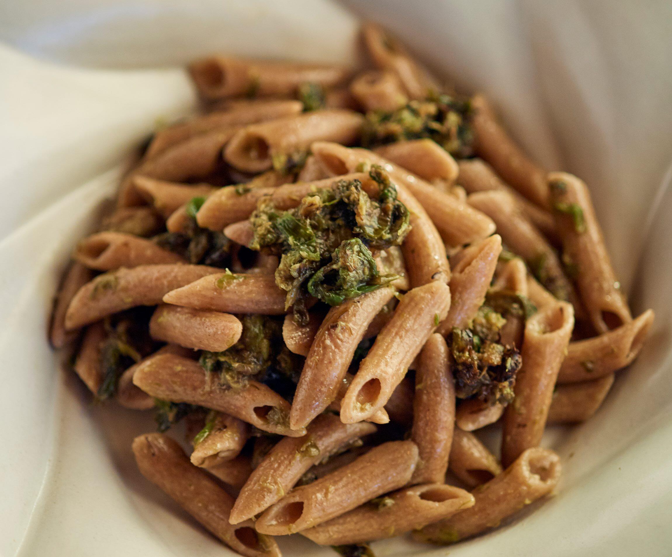 とってもシンプル。味つけは塩と、できたらおいしいオリーブオイルを使えばそれだけで十分です。普通のパスタでももちろんおいしくできますが、噛みごたえのある全粒粉のパスタがお薦めです。ほろ苦いふきのとうが、オイルベースにぴったり。