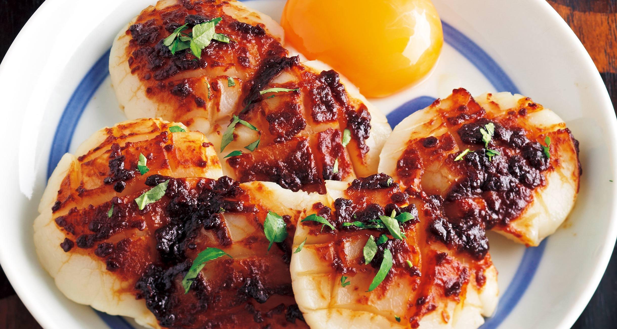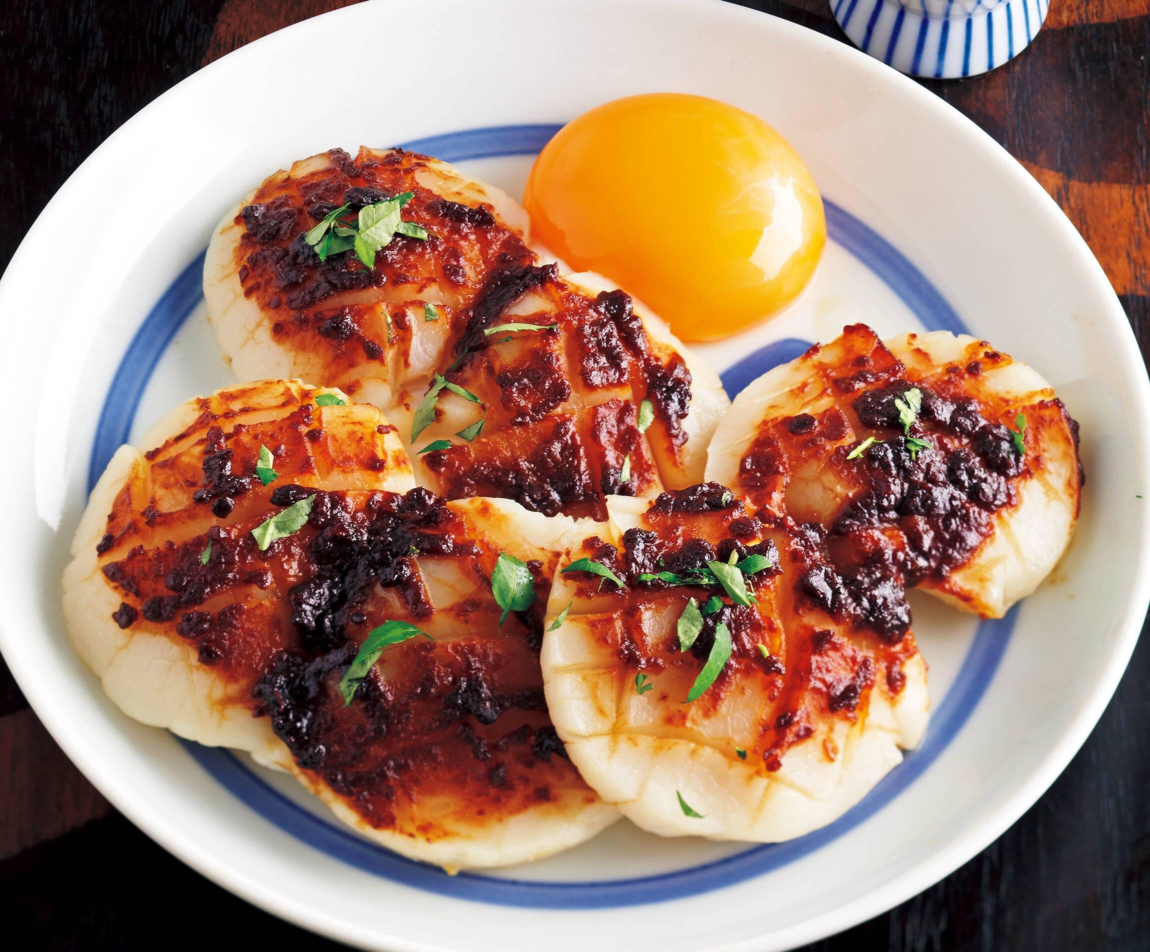 何なのでしょう、世にも魅惑的な取り合わせは!焼きほたての甘~い味わい、ちょい焦げ味噌の香ばしさ、なまめかしい卵黄、そして鼻から抜ける山椒の香り……。つくる前に、お酒の準備も忘れずに。