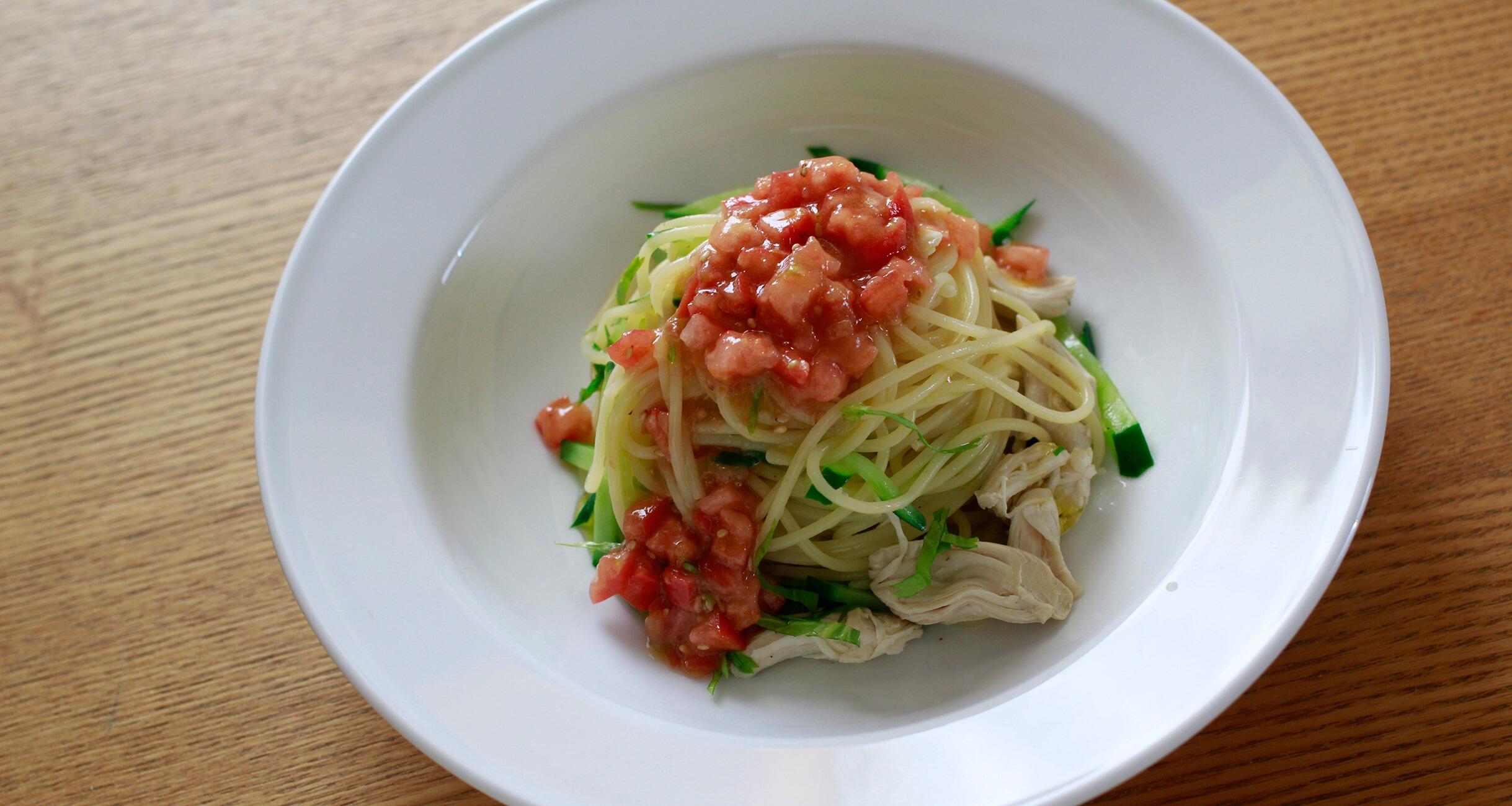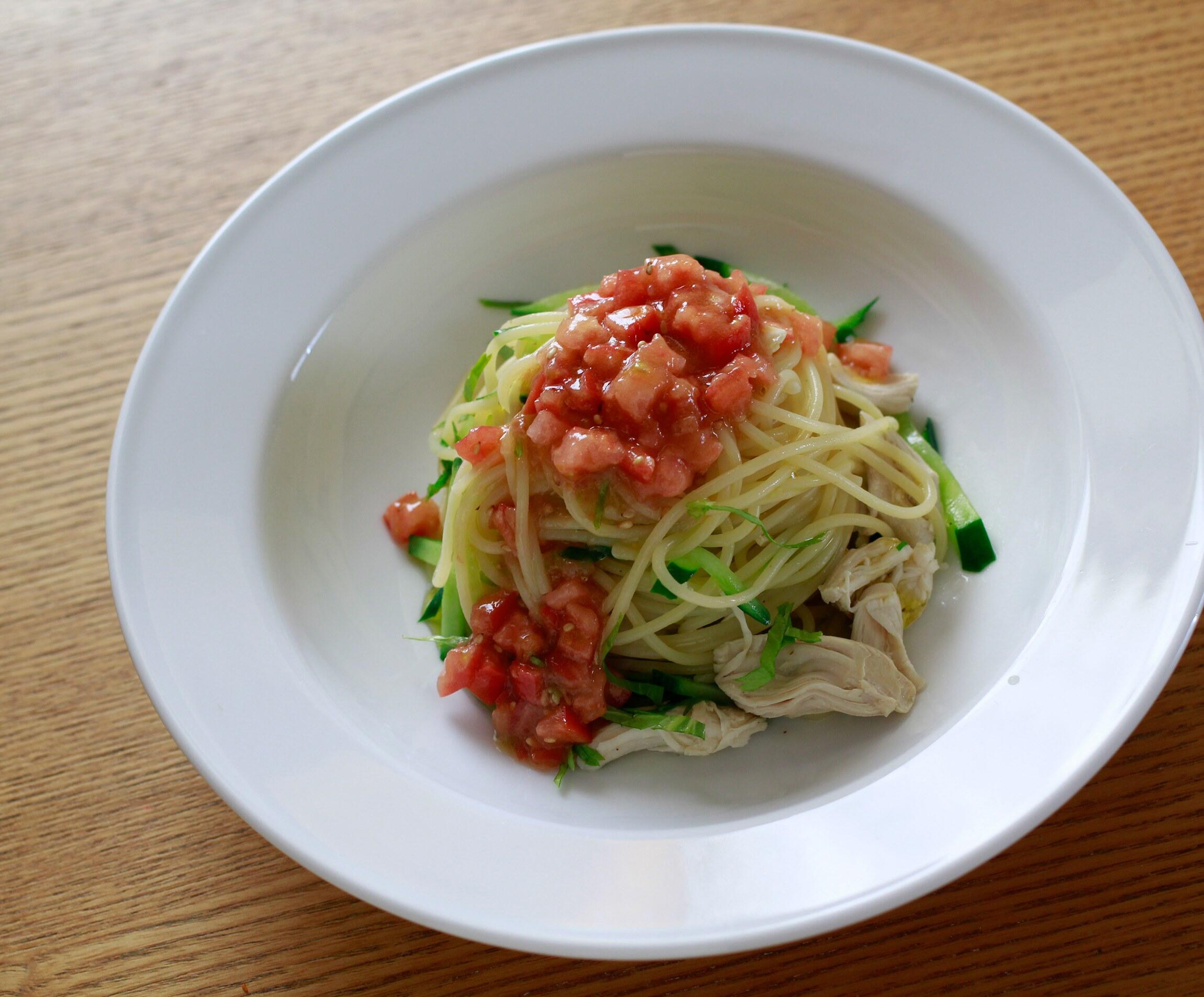 暖かい日に食べたい、春夏っぽいパスタ。ささみにきゅうりにトマト、ほんのり梅の風味を効かせて爽やかに!きゅうりは少し加熱したほうが、パスタとよく馴染みます。