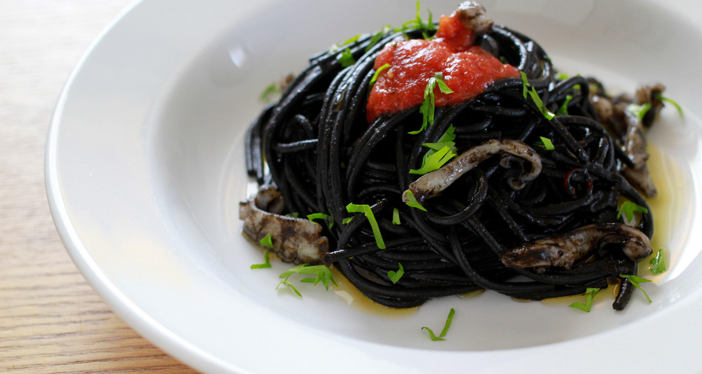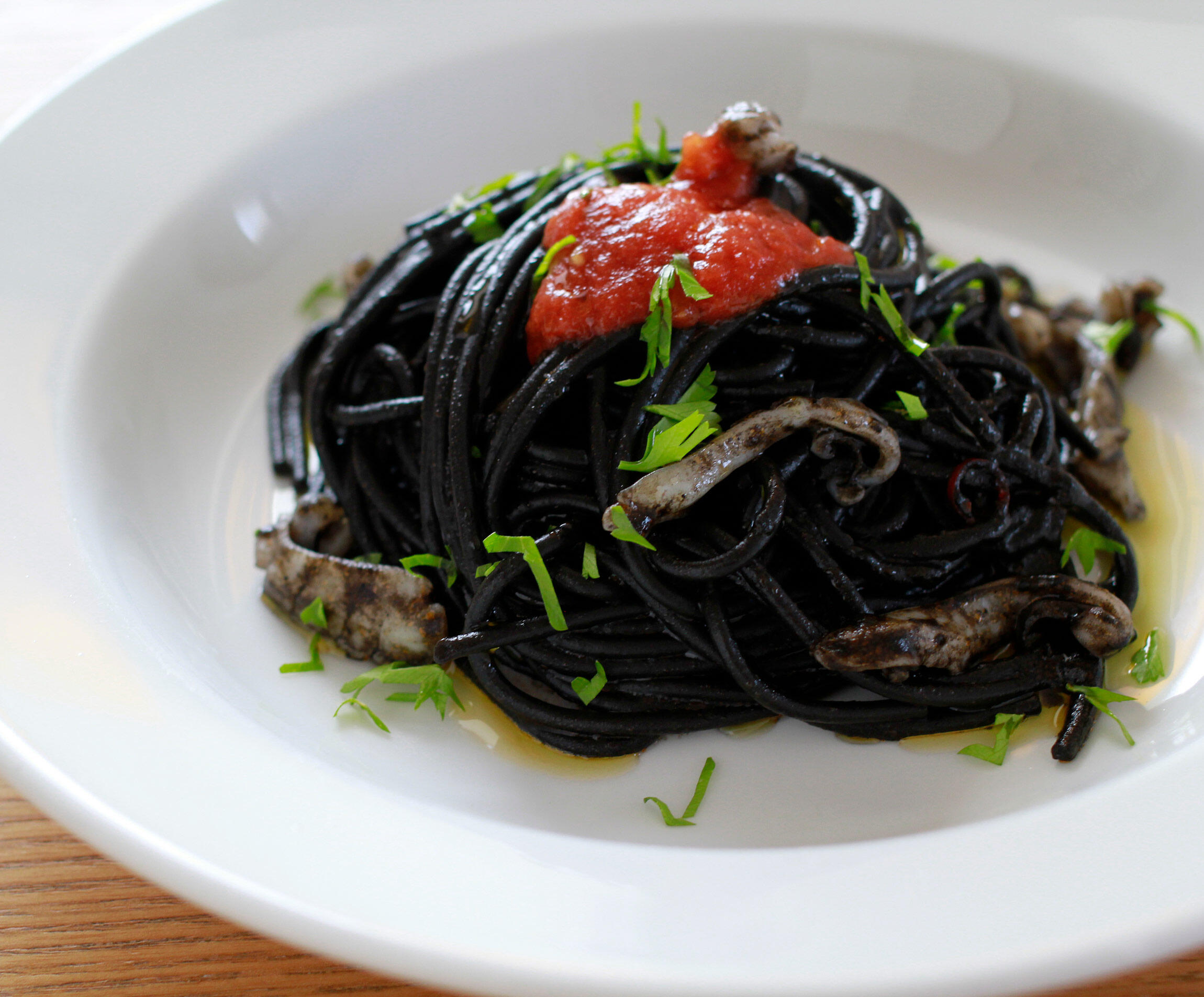 服や口の周りが汚れがちなイカスミパスタこそ、外食でなく自宅で食べたい!イカスミを練りこんだパスタを使えば、イカスミペーストが少量でも、十分コクが出ます。トマトピュレをちょっと加えると、酸が味を引き締めてくれて、見た目にもきれい。