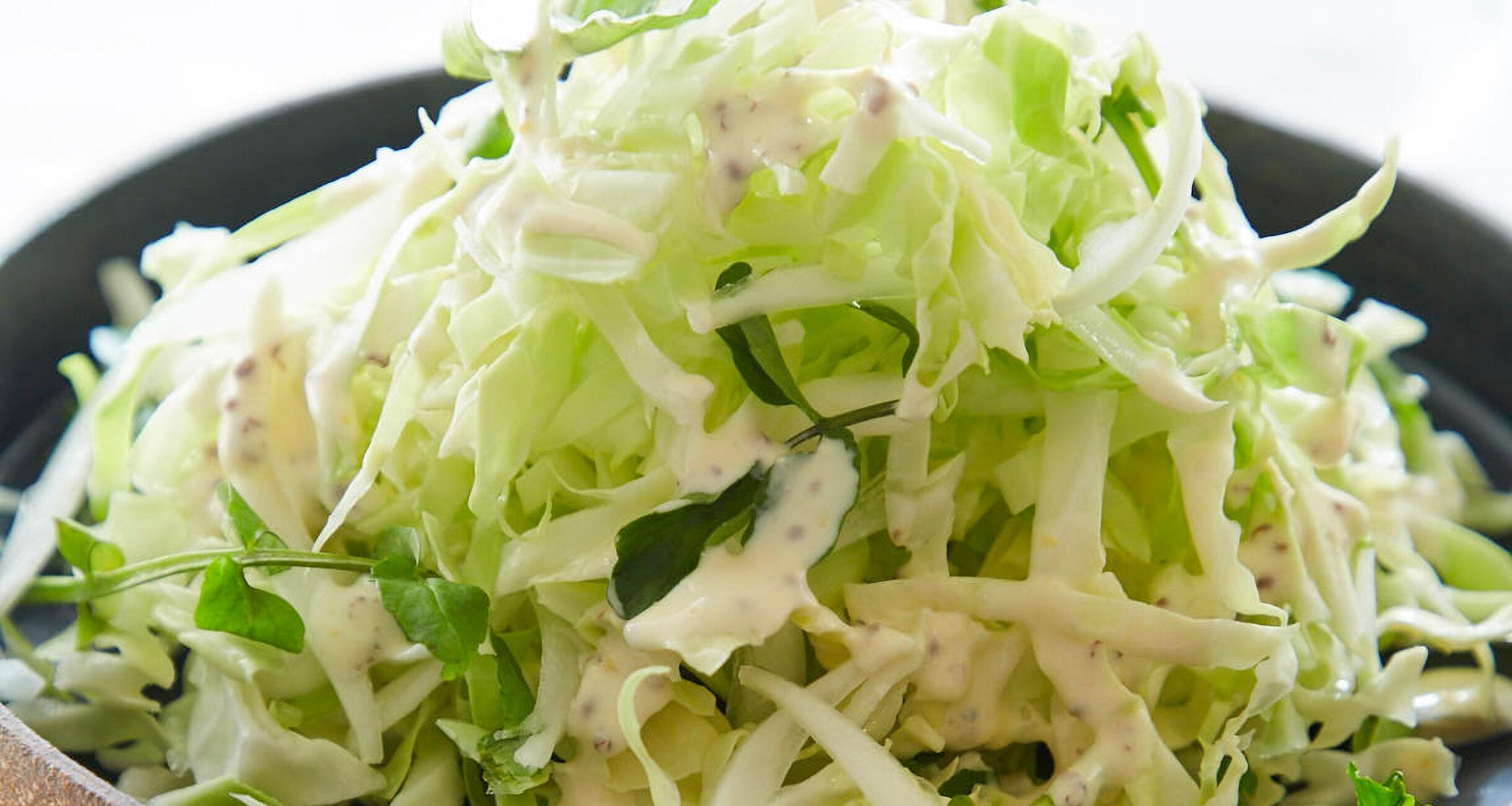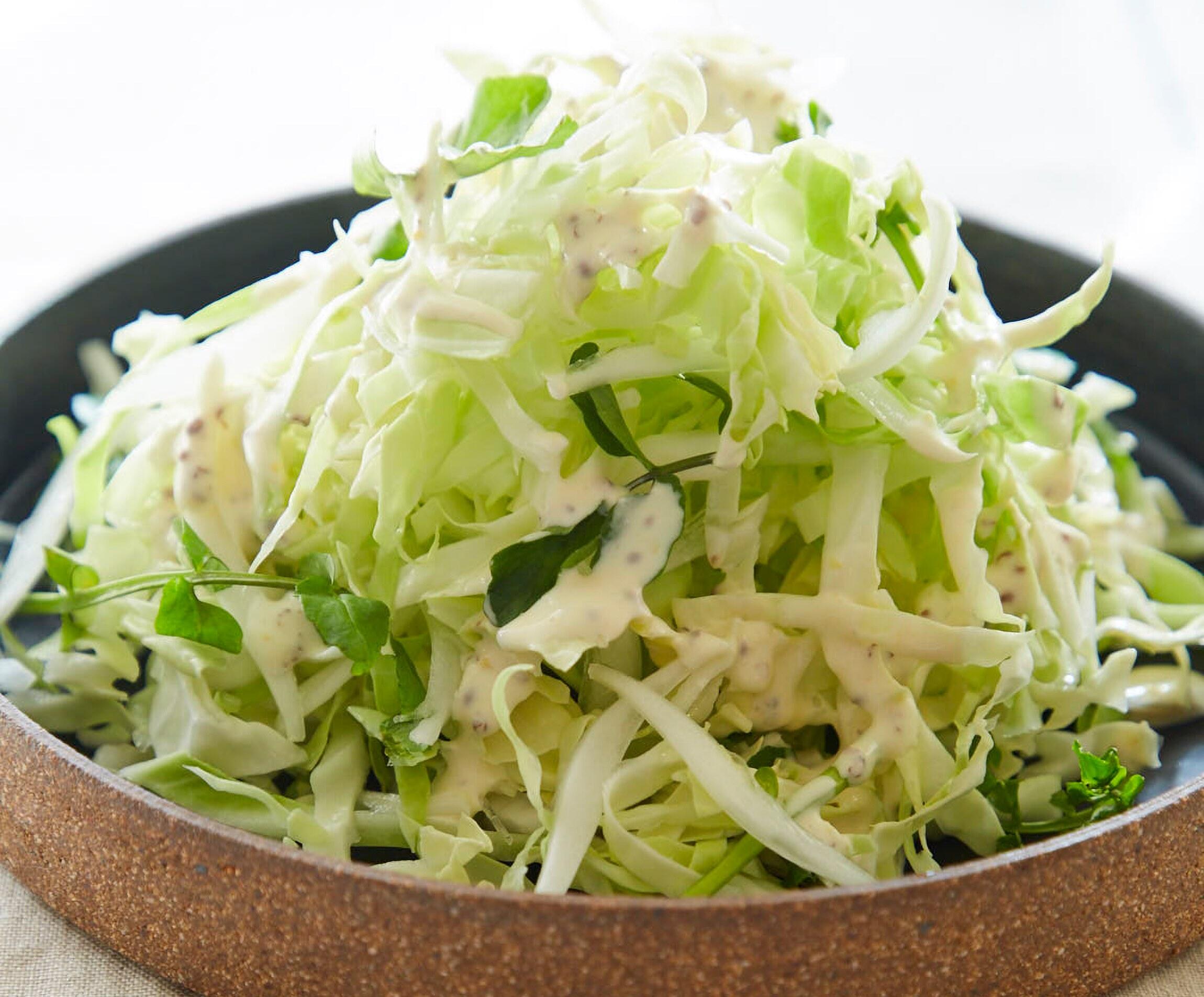 ふだん何気なく食べているキャベツのせん切りも、春だからこそ一層おいしく感じられます。粒マスタード入りのドレッシングが絶品。和、洋、どんな主菜とも合いそうです。