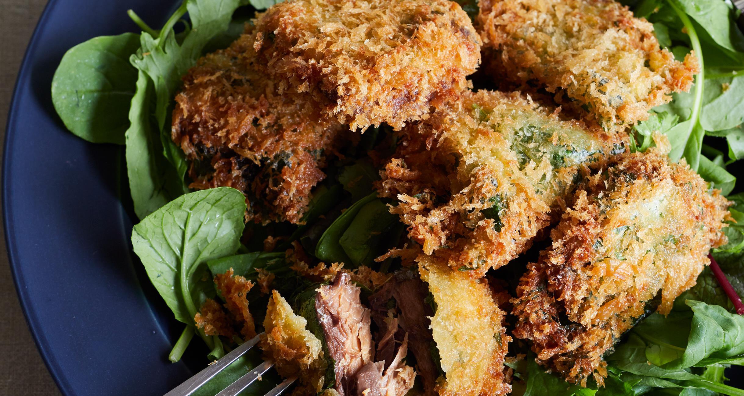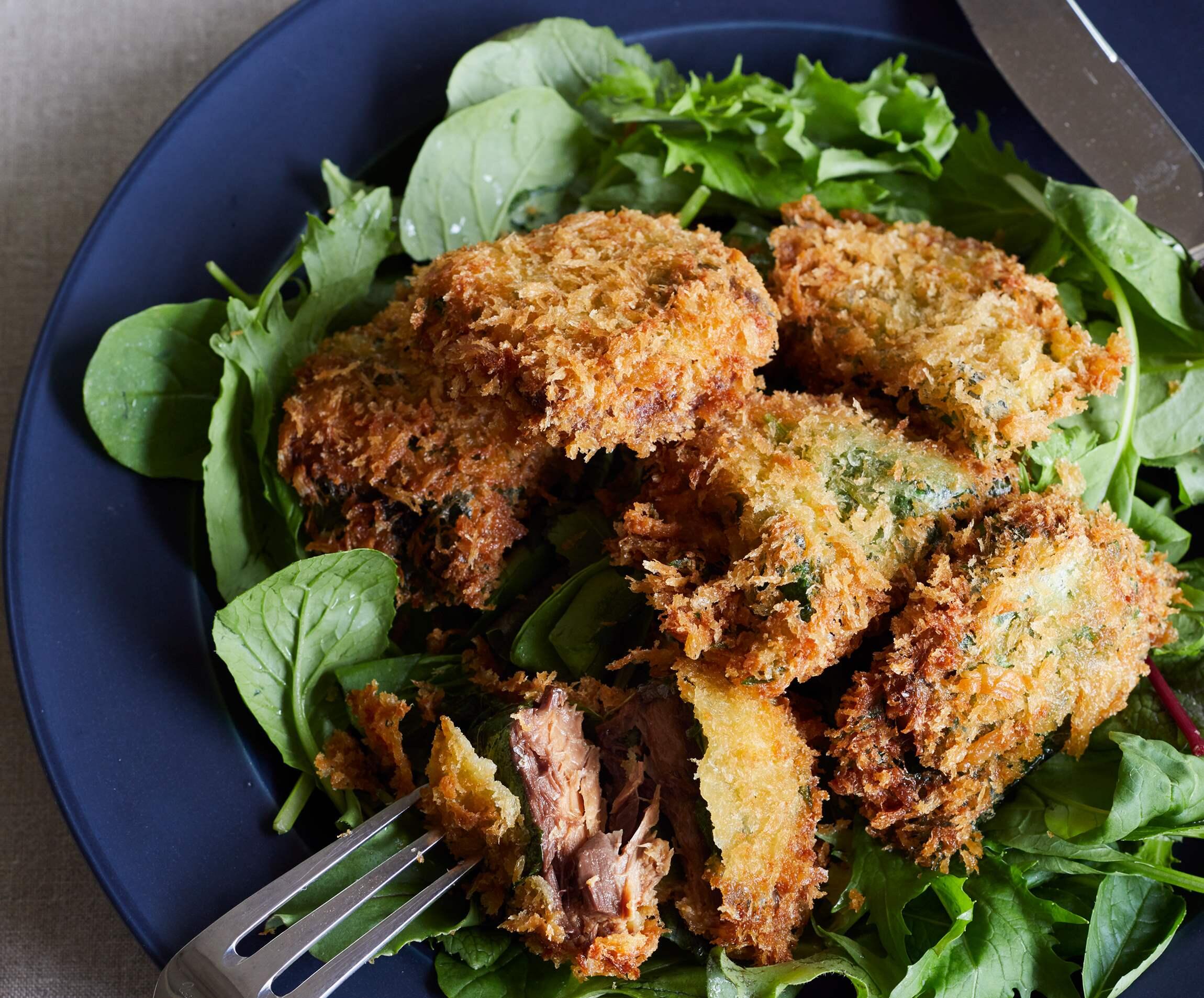 缶詰のサバを揚げてしまう、という斬新なテクニックが見事に大成功!身もくずれずカリカリに揚がる。これも味つけサバ缶ならではのなせる業。