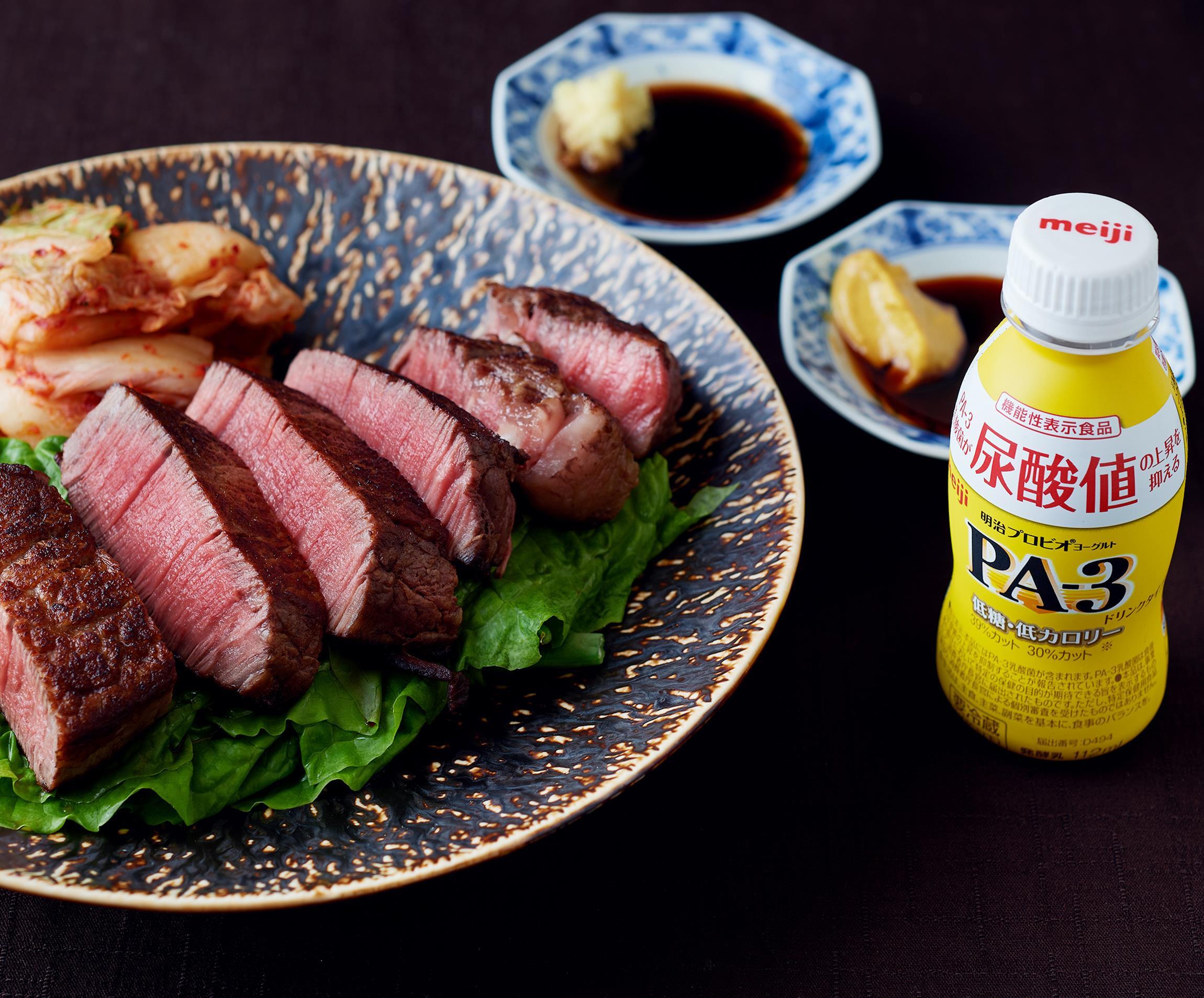 様々な健康問題が騒がれる昨今だが、垂涎モノの食事をたらふく食べたい! ご馳走はやめられない! そんな食欲の頼もしい味方が「明治プロビオヨーグルト PA‐3」。(食事の際に)飲むことで食後の尿酸値の上昇を抑えてくれる機能性ヨーグルトだ。痛風と日々向き合う“プロツーファー”と、自らを称する「肉山」オーナーの光山英明さんが「PA‐3」の頼もしさを語り、尿酸値のことも気遣える“牛ヒレ肉の食し方”を披露します。