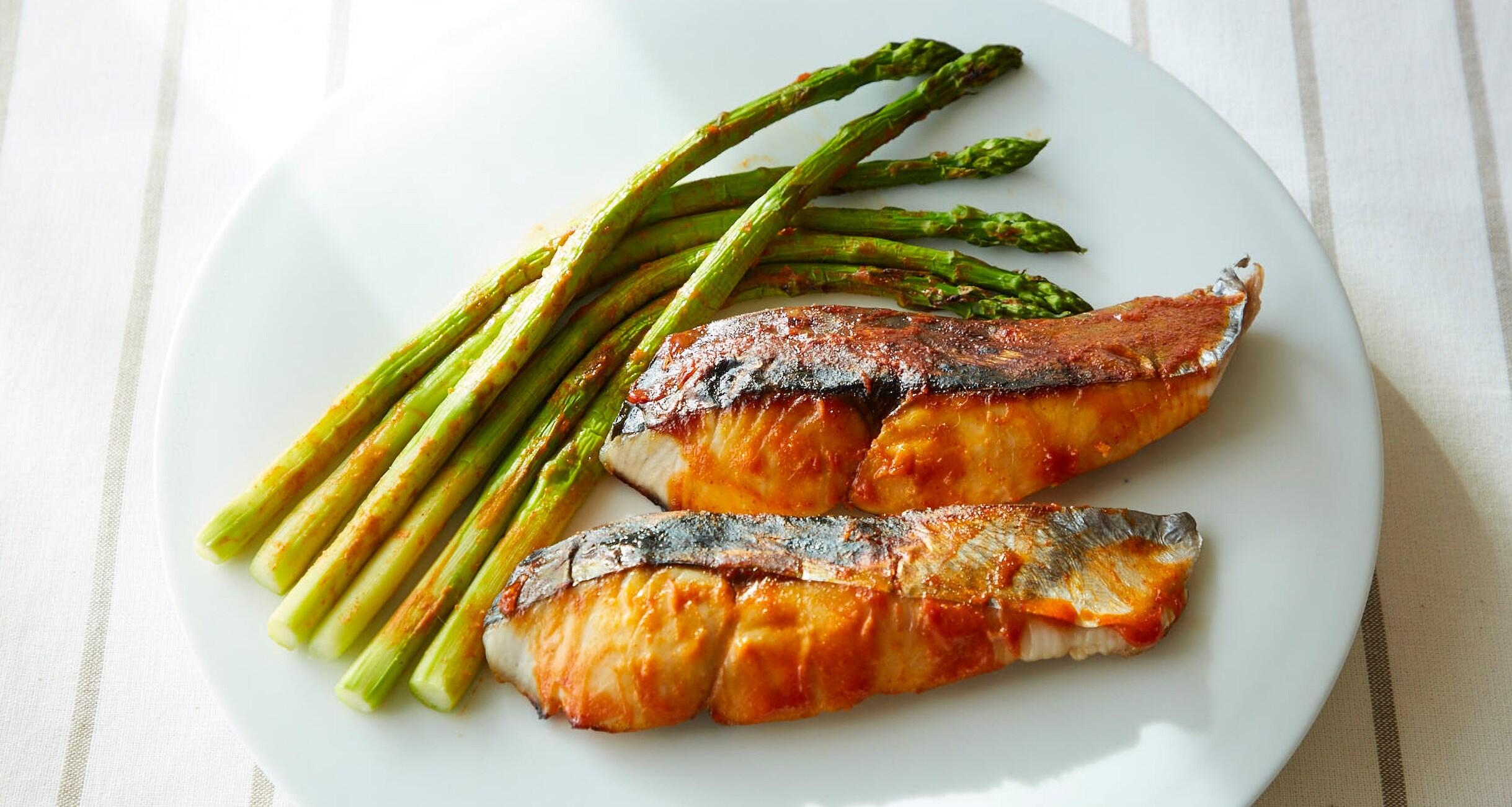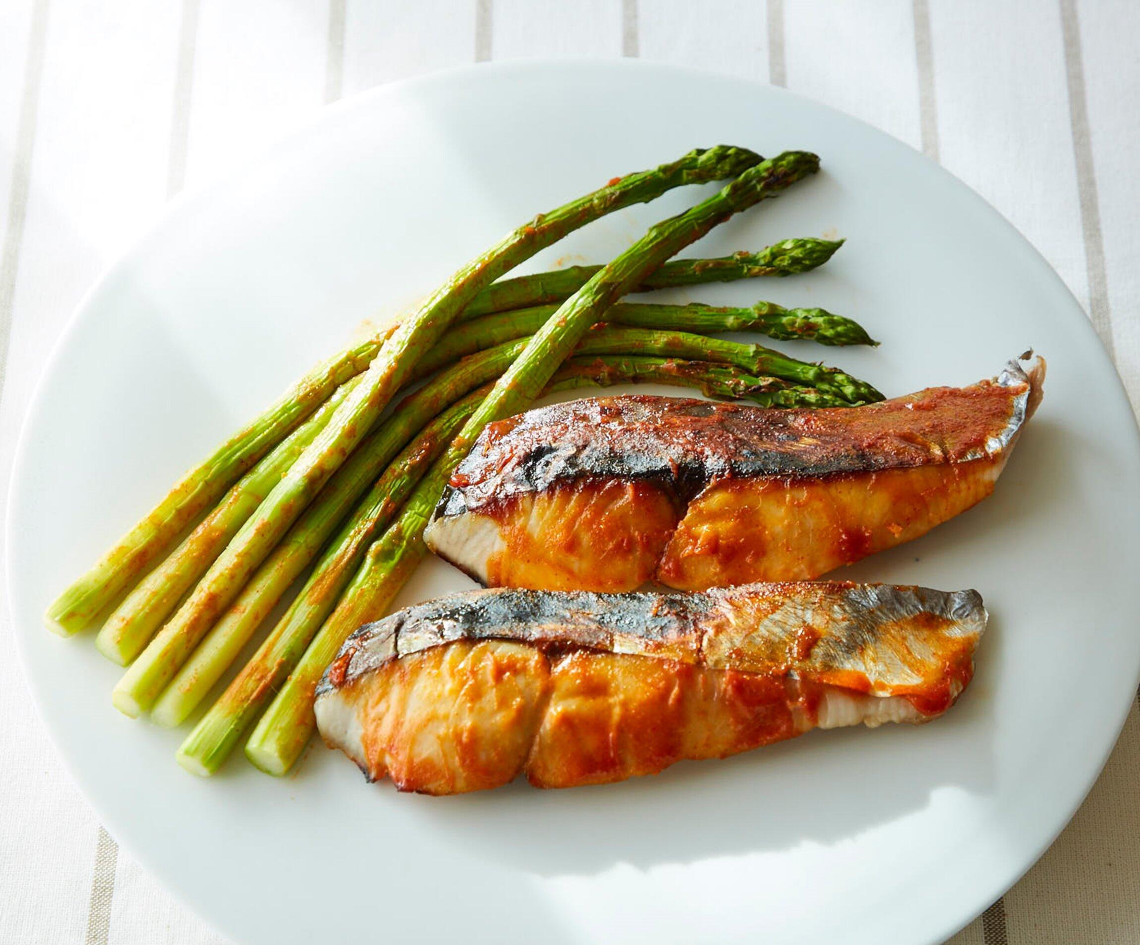 さわらの西京漬けは定番ですが、そこにコチュジャンを加えるだけで、唐辛子の清涼感のある辛味と香りが加わります。さっと火を通してから焼いたアスパラガスともよく合います。
