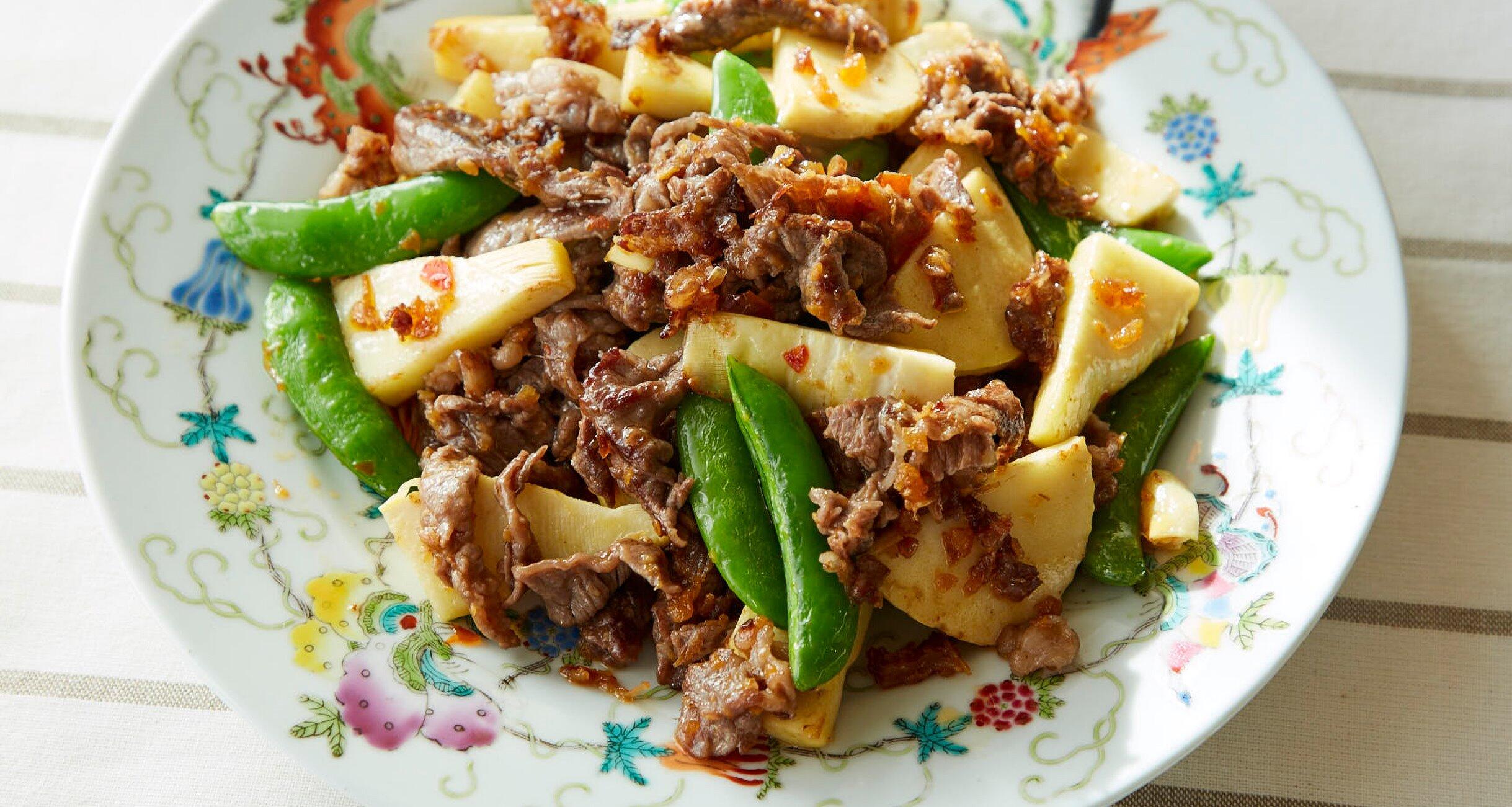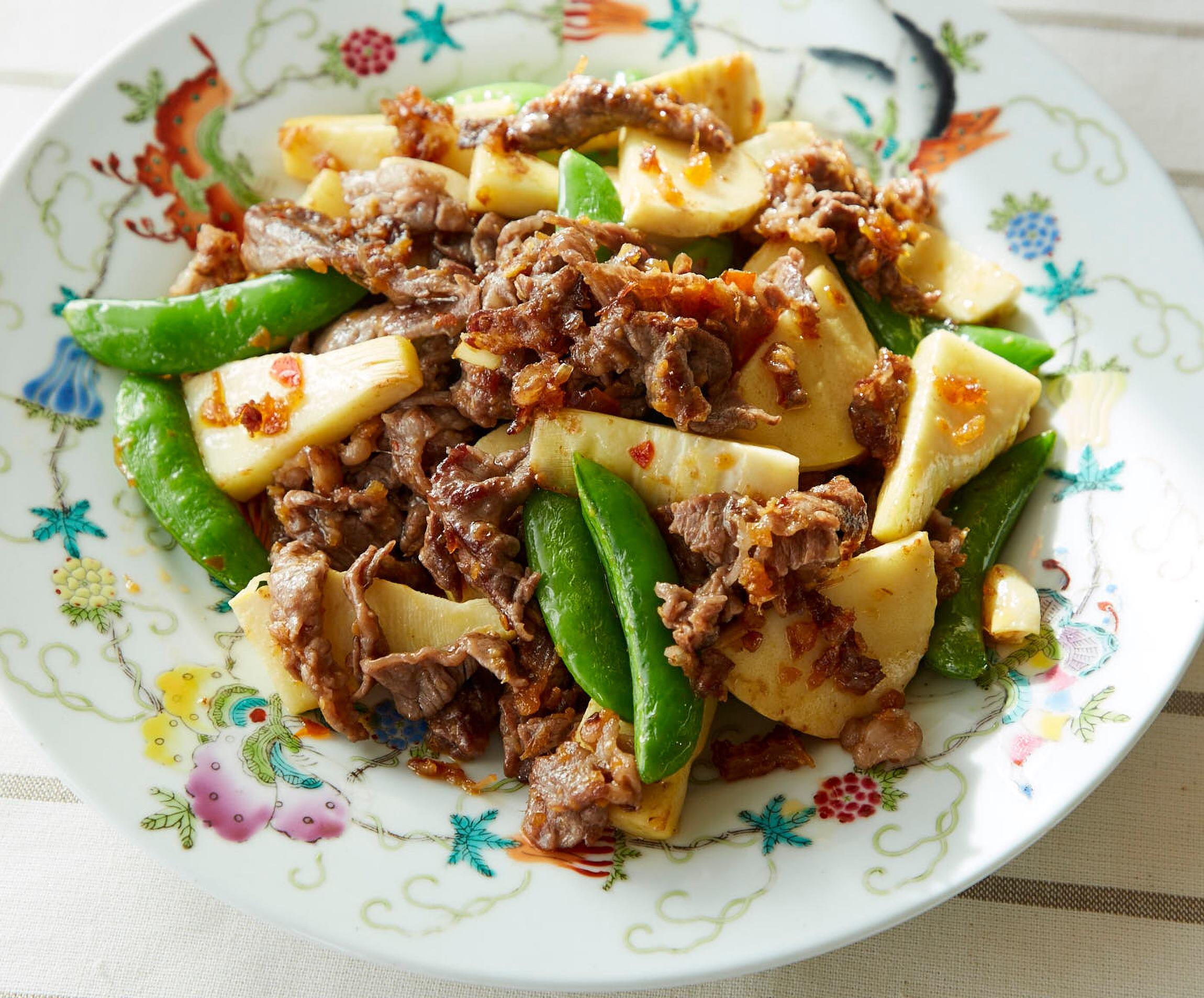 たけのこと牛肉は甘辛味や醤油味にも合う組み合わせですが、干し海老や干し貝柱でつくったXO醤で炒めると部屋中にたまらないいい香り。白いご飯とお味噌汁で頂きましょう。ビールもいいですね!