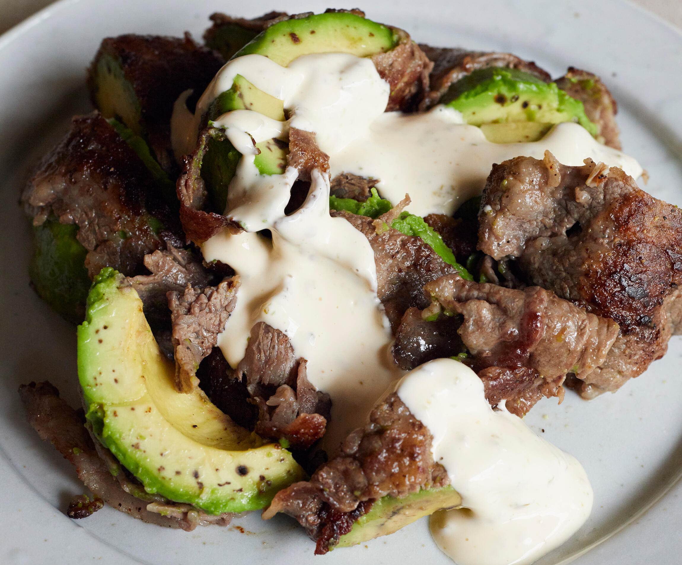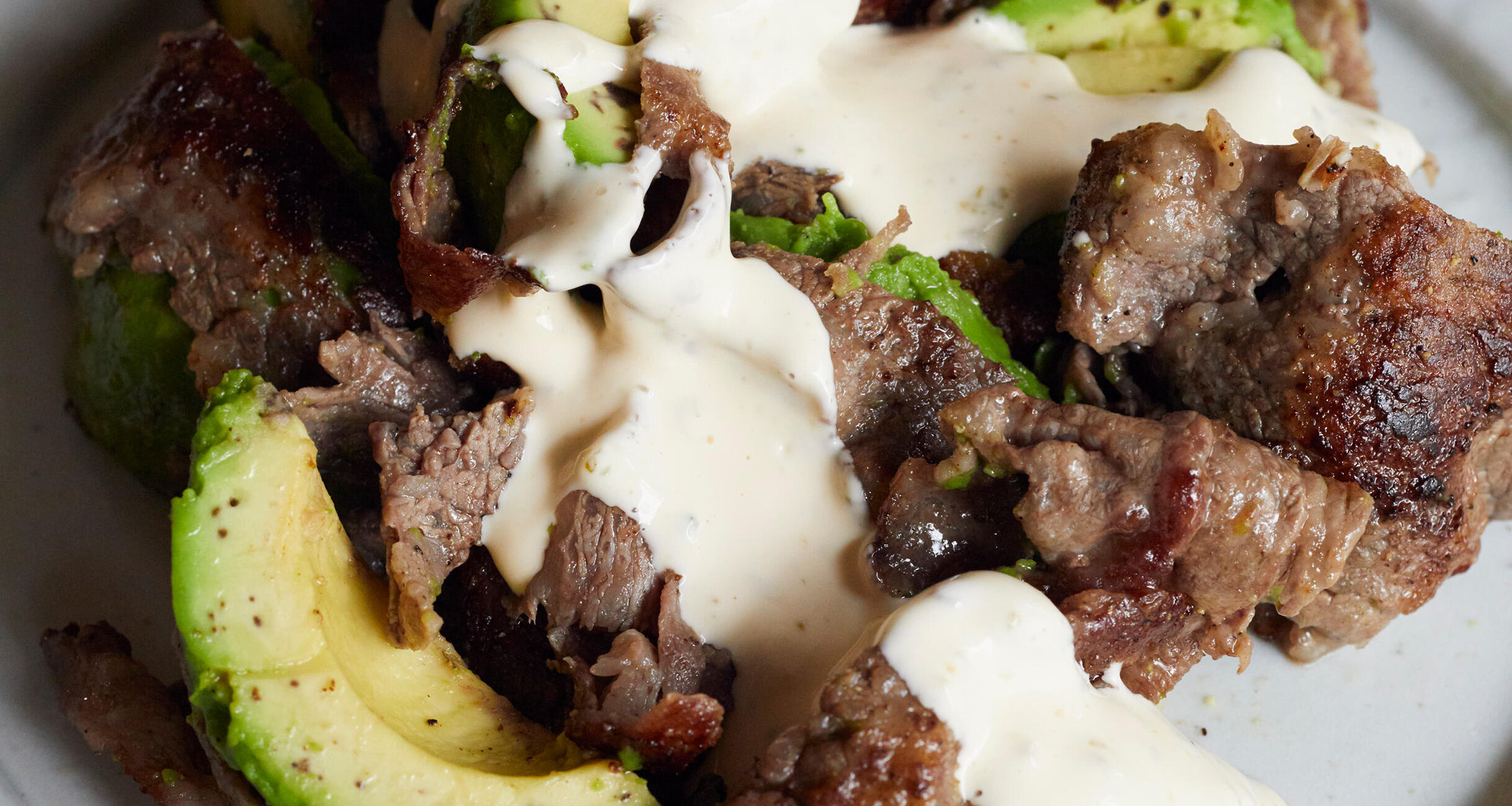 牛肉とアボカドは相性抜群。カリカリの牛肉とホクホクのアボカドの食感を楽しんでください。柚子胡椒を加えたピリ辛のソースをかけて。