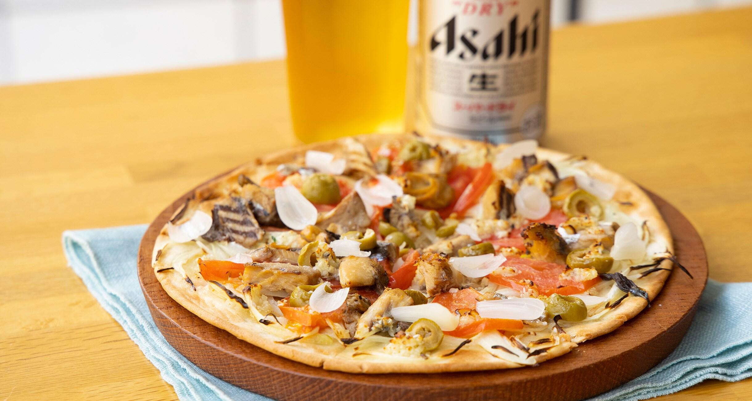 1品目の“サバ缶とオリーブのピザ”は、買ってきたピザ生地に素材をのせて焼くだけ。10分もあれば完成です。ビールとのペアリングで言うと、味の軸はサバ缶。青魚のサバを焼いたときのほろ苦さとオイルのコクが、ビールとよく合うんです。
