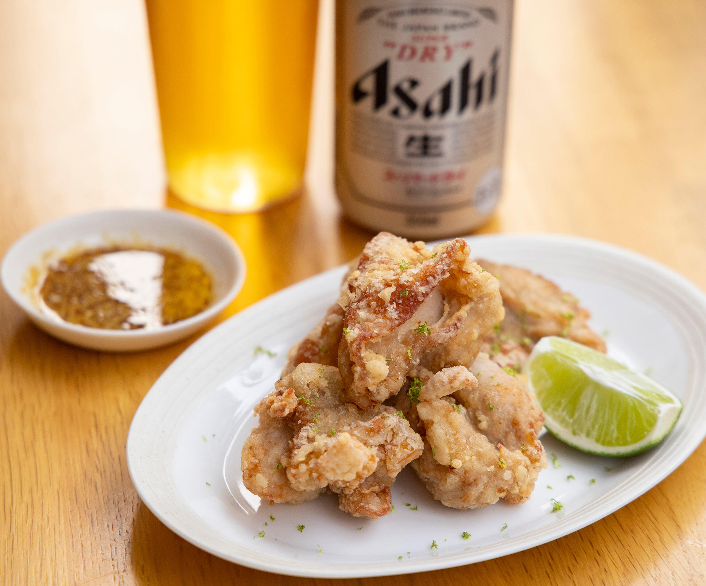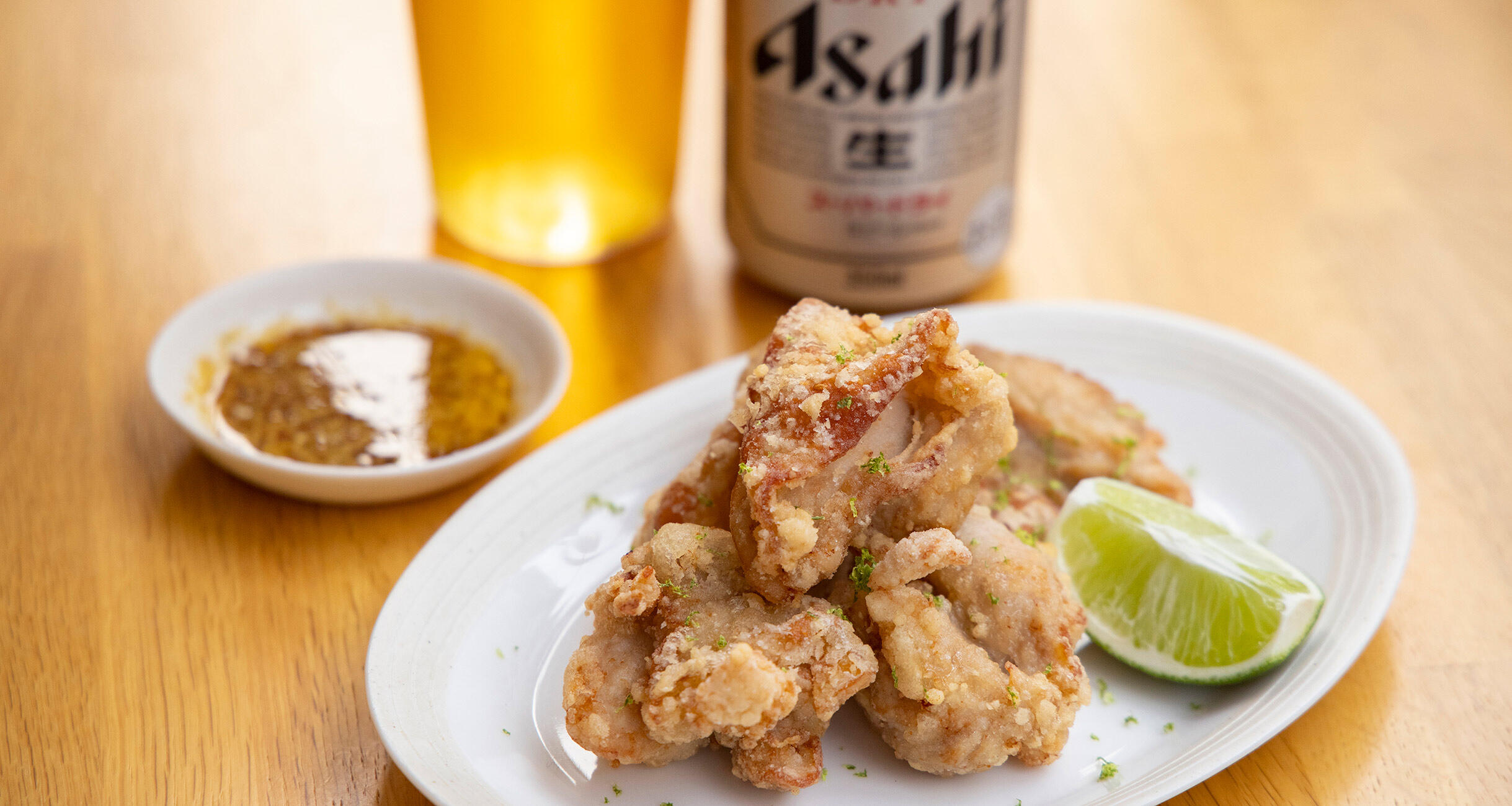 1品目の“鶏唐揚げ ライム風味”は、文字通りライムがポイント。基本的にはいつものレモンをライムに変えただけですが、唐揚げにライムの皮をすり下ろすこと、そしてライム果汁でつくるソースがひと工夫。レモンにはない青々しい爽やかさが生まれ、唐揚げを食べてビールを飲むと、口の中でビールとライムのカクテルが出来上がるような感覚を味わっていただけると思います。