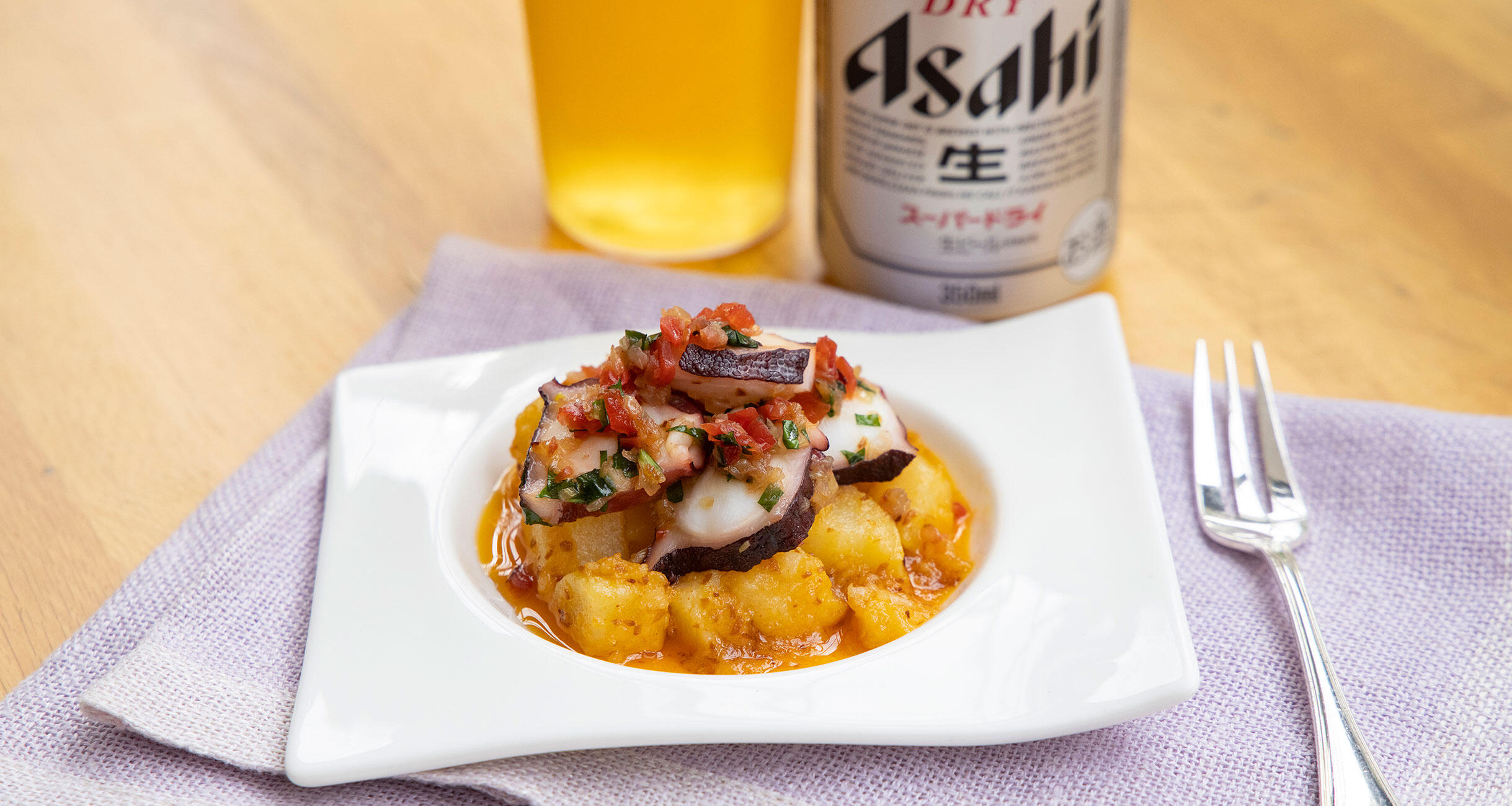 タコとカツオ。旬の魚介類が、スペイン三つ星の味のメソッドで大変身!東京・西麻布「エネコ東京」の総料理長・磯島仁さんに教わるビールのつまみレシピ。第5回のテーマは夏の魚料理。人気のスペイン料理「タコのガリシア風」「白ガツオのトマト煮」のおいしさを、簡単ビールのつまみでどうぞ。