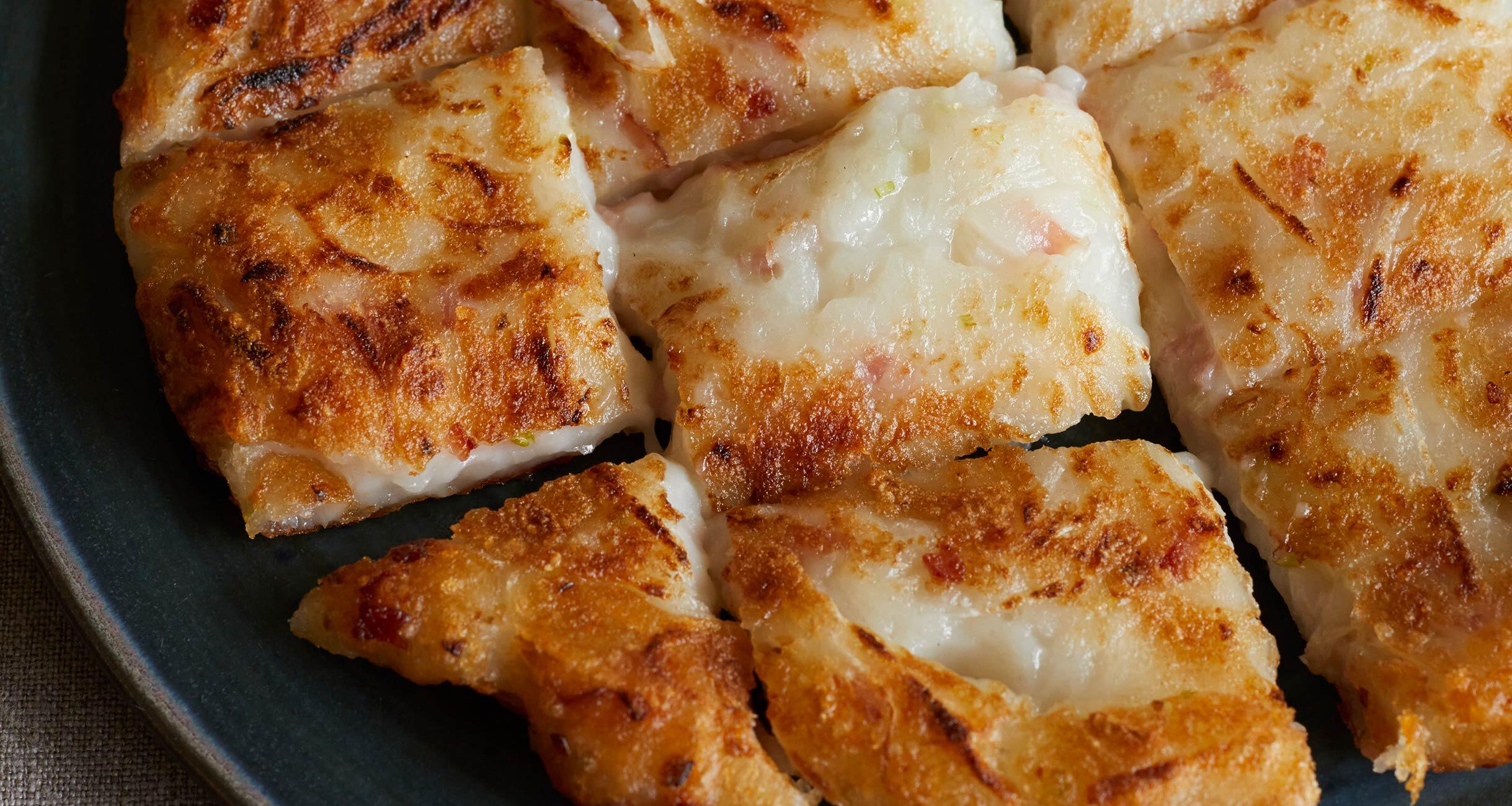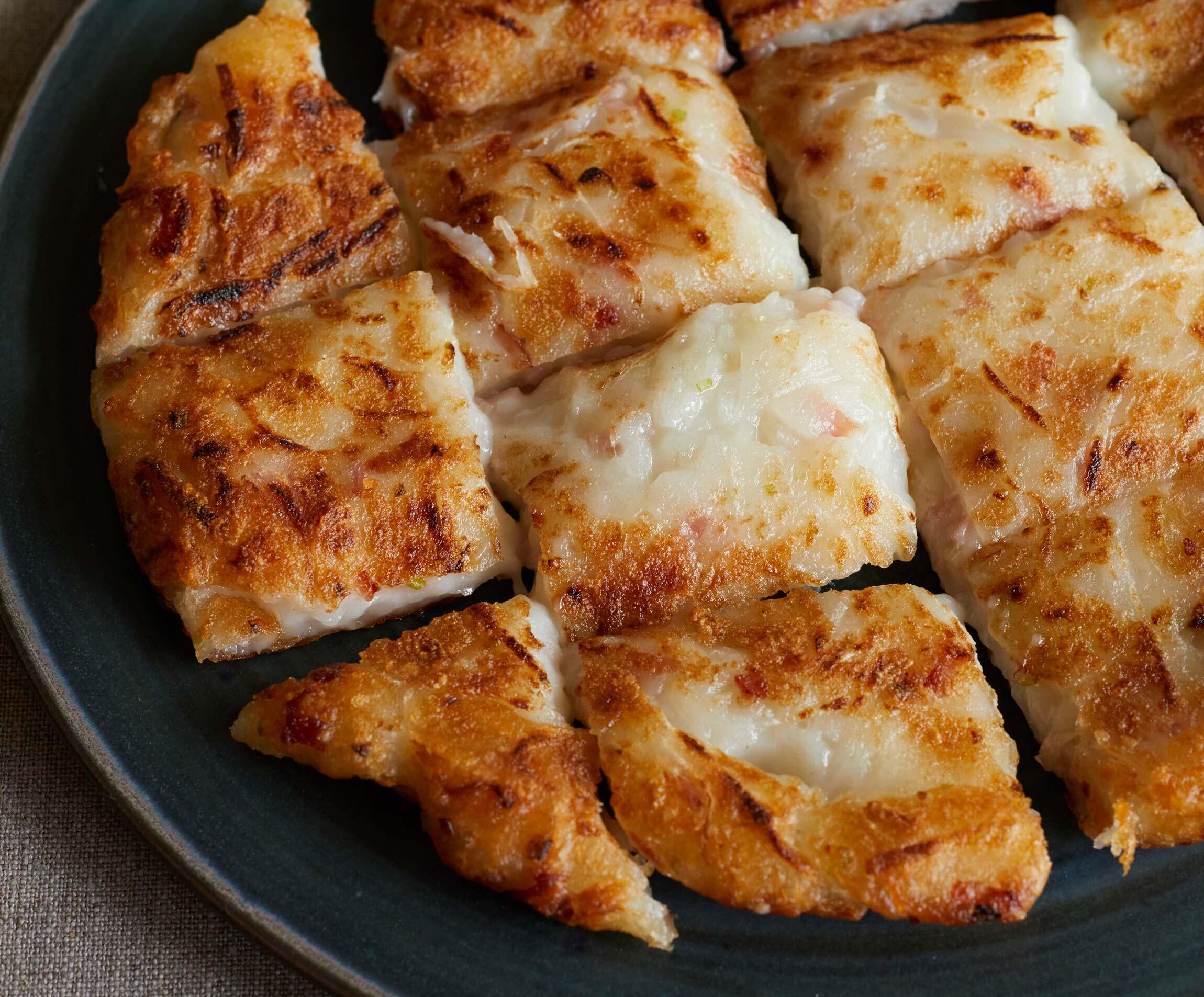 中国料理の点心のひとつ。もっちもちがたまらない。蒸してから焼くのが本場流ですが、フライパンで一気に蒸し焼きに。ハムで手軽に。干し海老でつくればさらに本格的に。